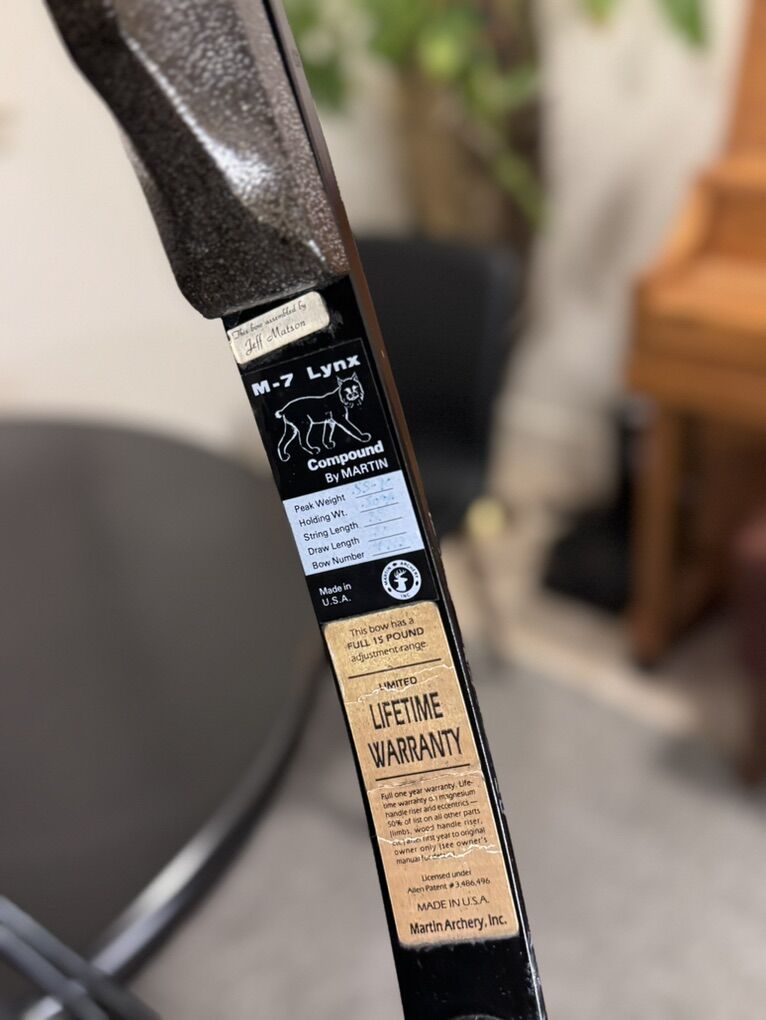 VenmoUp for sale is a classic Martin Lynx Magnum (M-7) compound bow. Assembled by Jeff Matson, this bow features the iconic textured hammer-tone finish and a beautiful wood-grain Martin grip inlay. This is a robust, American-made piece of archery history that has been exceptionally well-maintained.