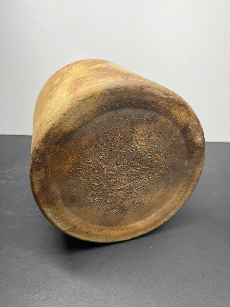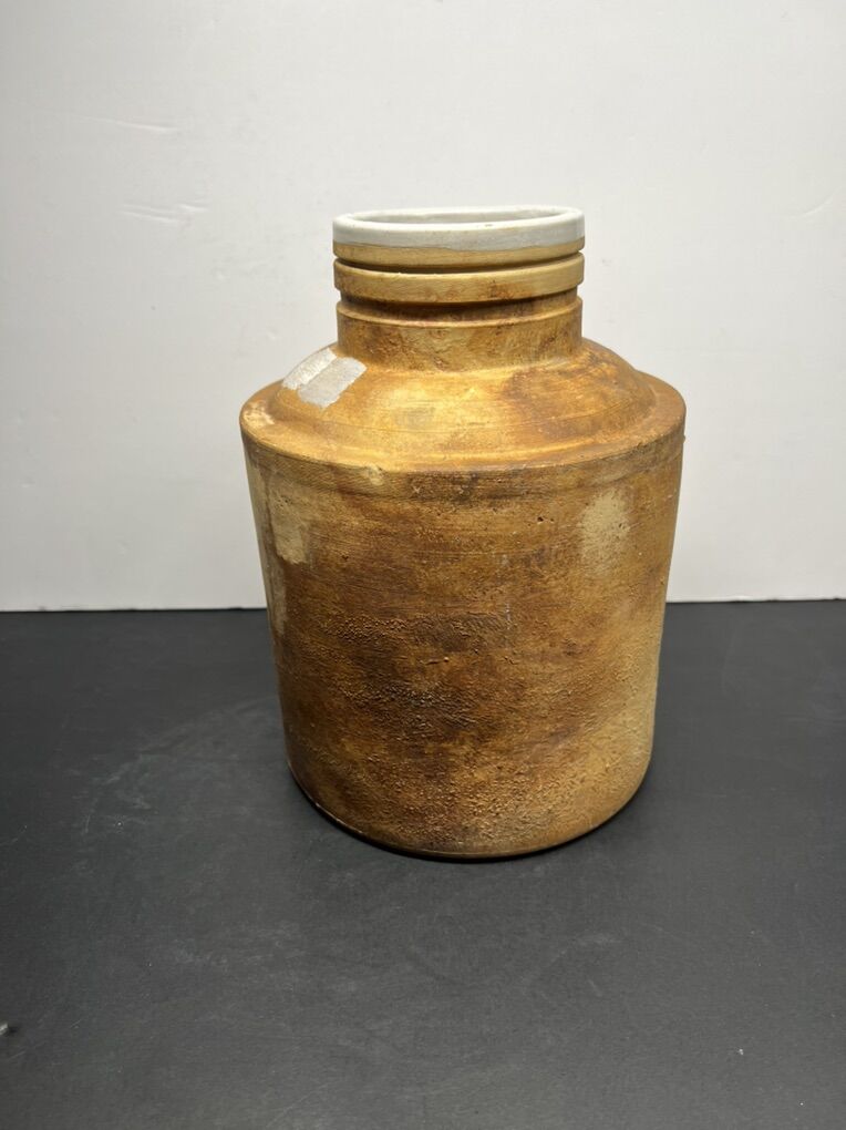 VenmoAntique salt-glazed stoneware crock, dating from the late 19th or early 20th century. Durable, functional pottery designed to store liquids or dry goods. Features a tan-colored, textured body with a white glazed rim, typical of utilitarian kitchen or merchant containers. Historically used for preserving foods like pickles and sauerkraut, or storing water.
