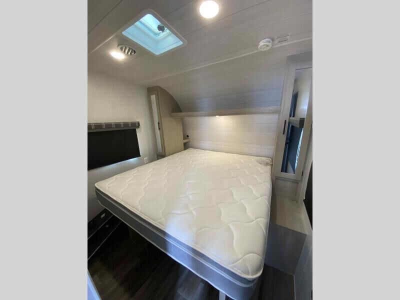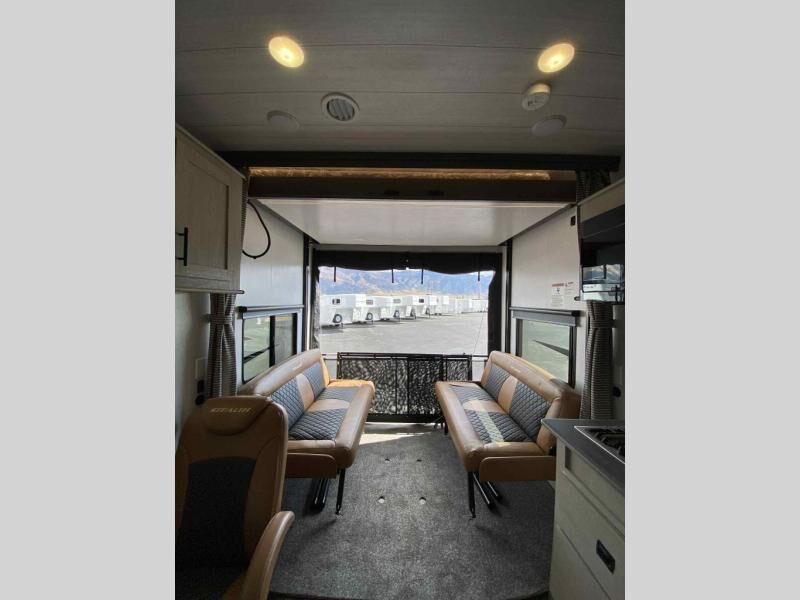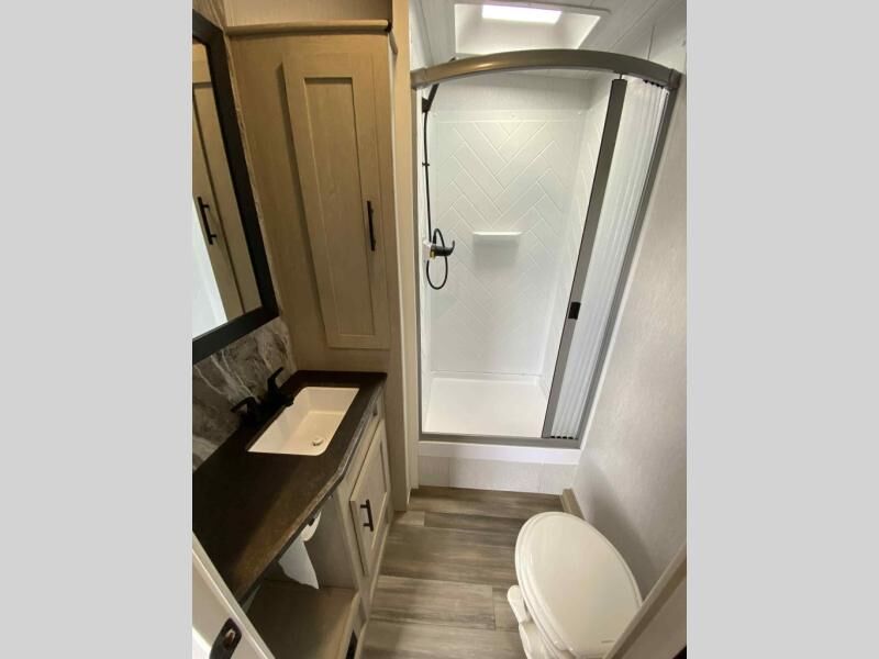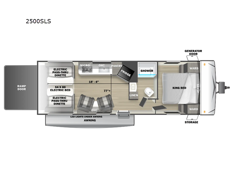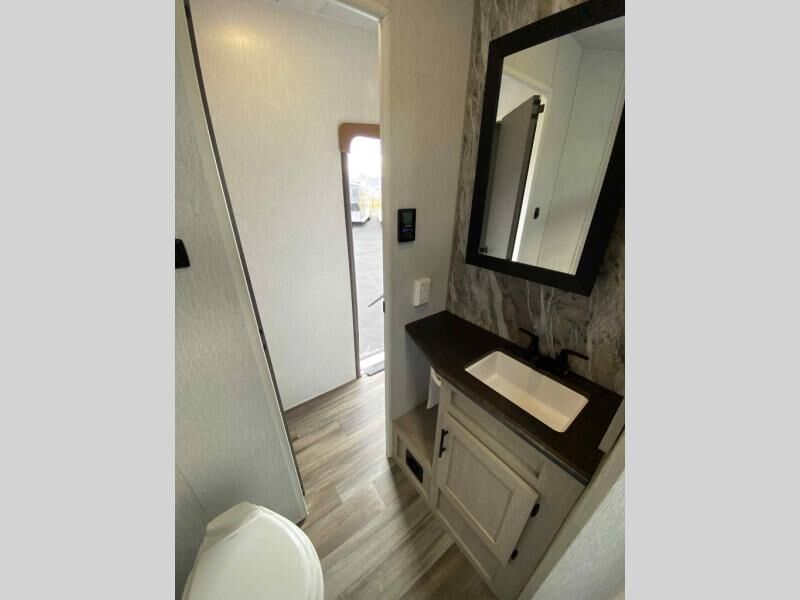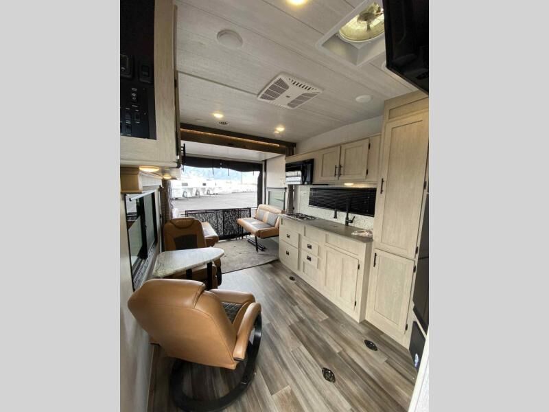 Days riding the trails are made easy when you can come back to creature comforts, like the ones you'll find in this toy hauler. Your crew can play a game at the electric pass-thru dinette, relax on the dual lounge chairs, or head outdoors to visit under the awning with LED lights. There is a full kitchen to prepare meals each day and a pantry to keep snacks ready to go. You'll appreciate a full bath to clean up in each day and a front private bedroom to enjoy your own space at night.