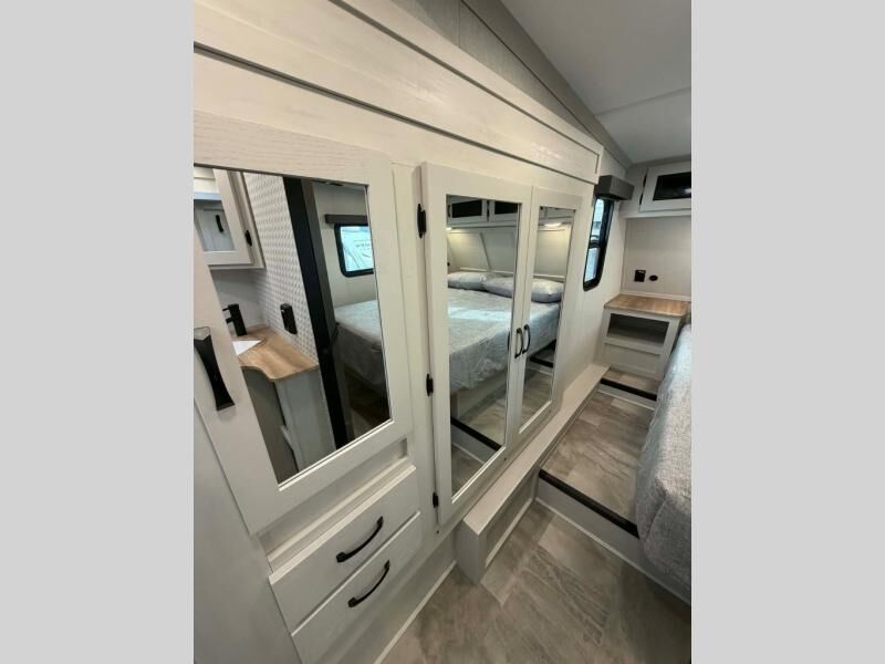 This fifth wheel is perfect for families or large groups since there is a front master bedroom and a middle bunkhouse! The front master suite not only has a queen bed to lay your head on at night and a wardrobe slide, but also an entrance into the dual entry bathroom. The middle bunkhouse has a 30" x 74" bunk bed and a flip-up bunk, shoe storage, and overhead cabinets to keep the clutter away. Grab some eggs from the 10 cu. ft. GE Dual Swing 12V refrigerator, fry them up on the three burner cooktop, and enjoy them at the free-spanning table. You can then read the morning newspaper on either the tri-fold hide-a-bed sofa and theater seating or watch the news with the rear entertainment center!