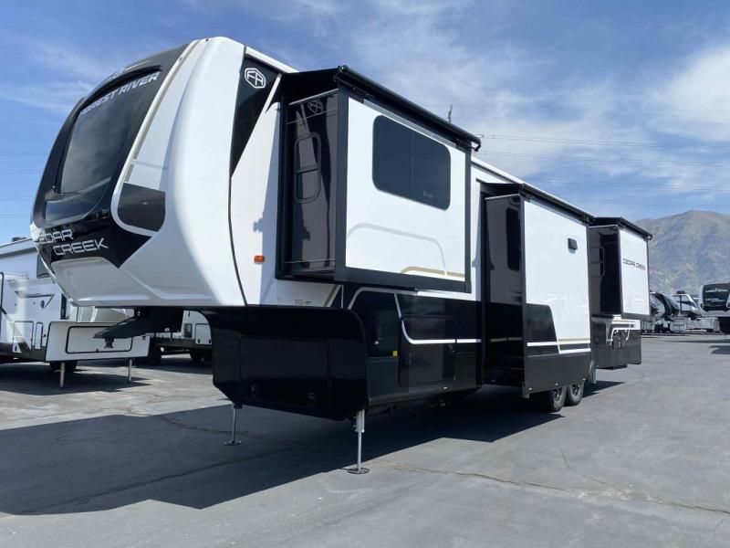 The 2026 Forest River Cedar Creek 370FL is a premium fifth wheel designed for long trips and extended stays. Its five slide-outs and bath and a half layout create a spacious interior with clear zones for living, cooking, and sleeping.