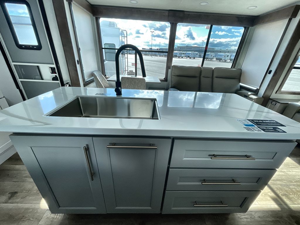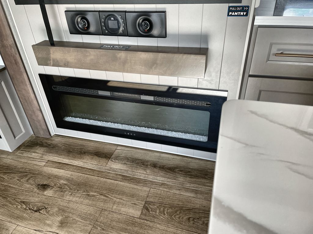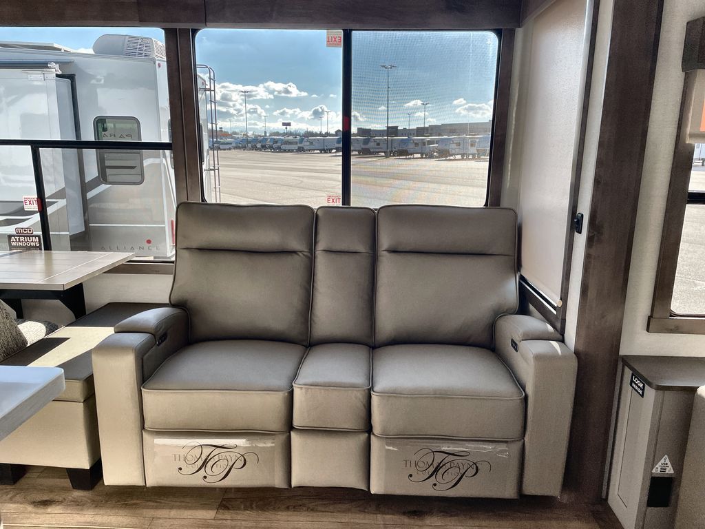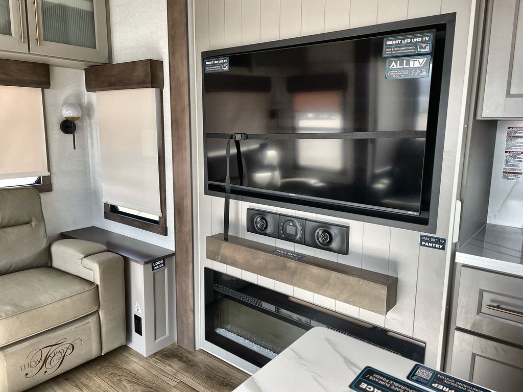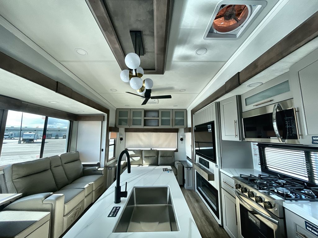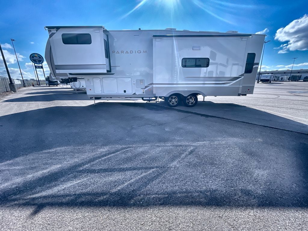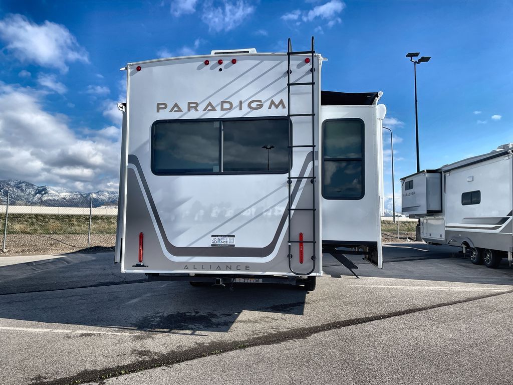 Search for the best views, the nicest RV park, or a place you haven't seen for years with this Paradigm in tow! There is a king bed slide in the master bedroom, a Smart TV, and a dresser with flip-up hidden storage for your belongings. The full bathroom offers a large residential shower, a porcelain toilet with a soft close seat, and storage for your linens, while the kitchen gives you two pantries, an island with a large undermount single basin sink and dishwasher prep if you want the option for easy clean up. You will also have a residential microwave and range, plus a 3.73 cu. ft. oven to make meals. When you're ready to relax for the evening, head to the rear living area to enjoy the dual recliner love seat across from the 50" Smart TV and fireplace!