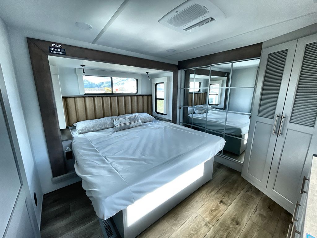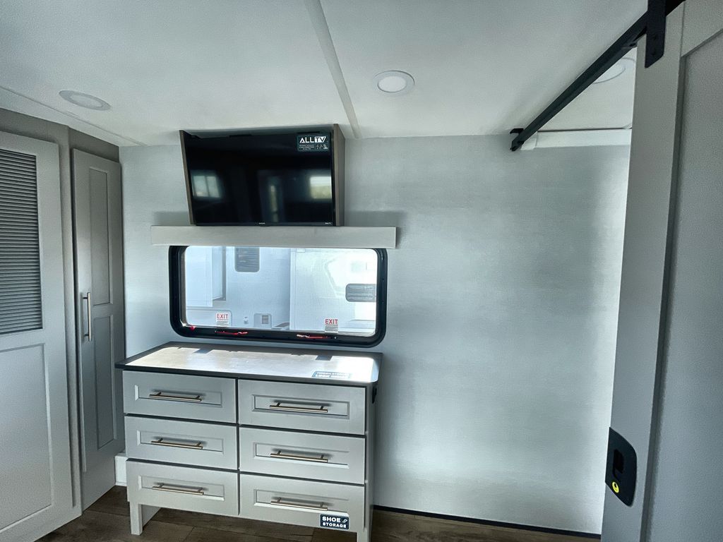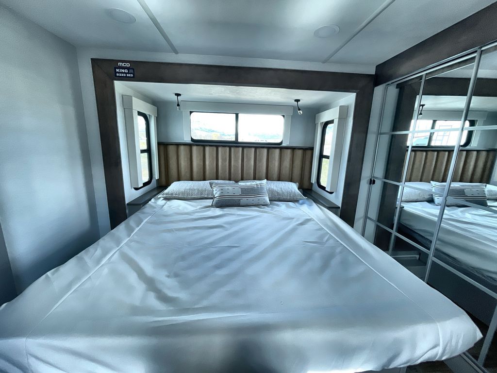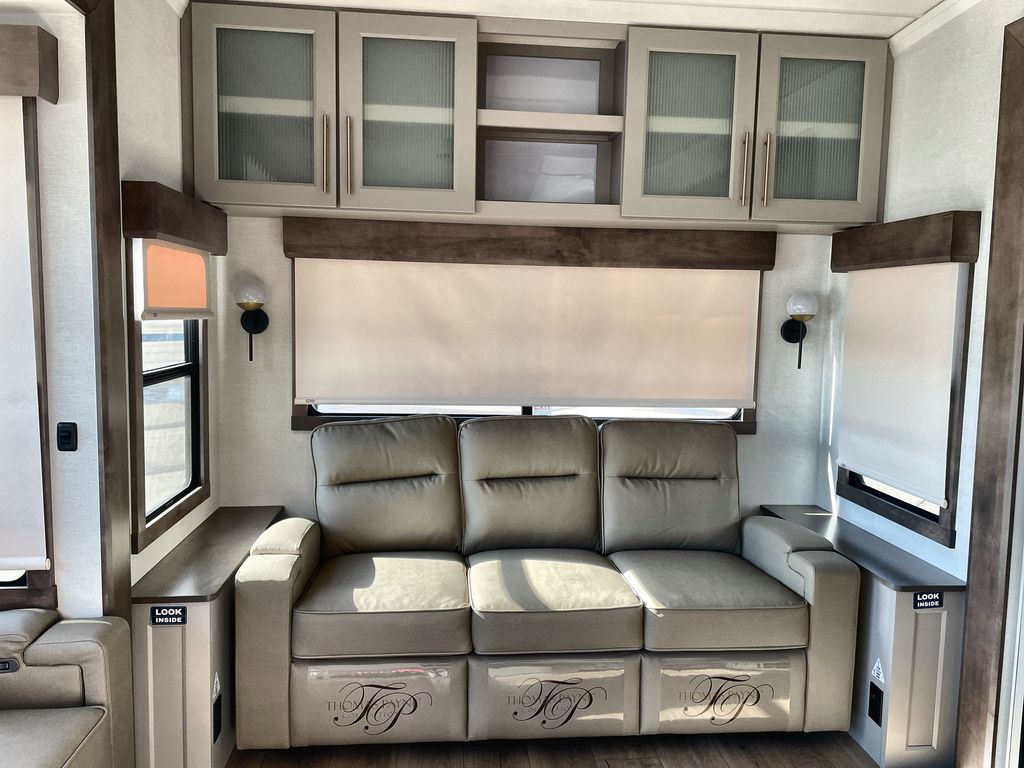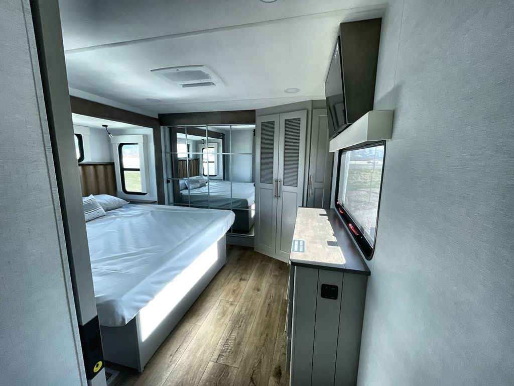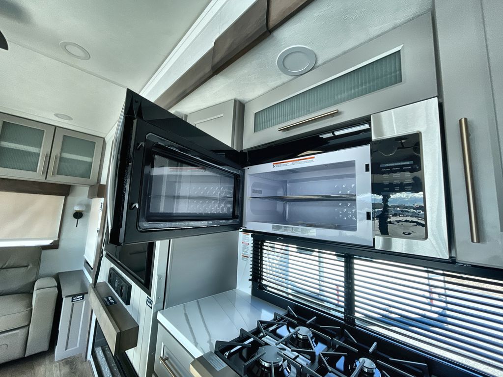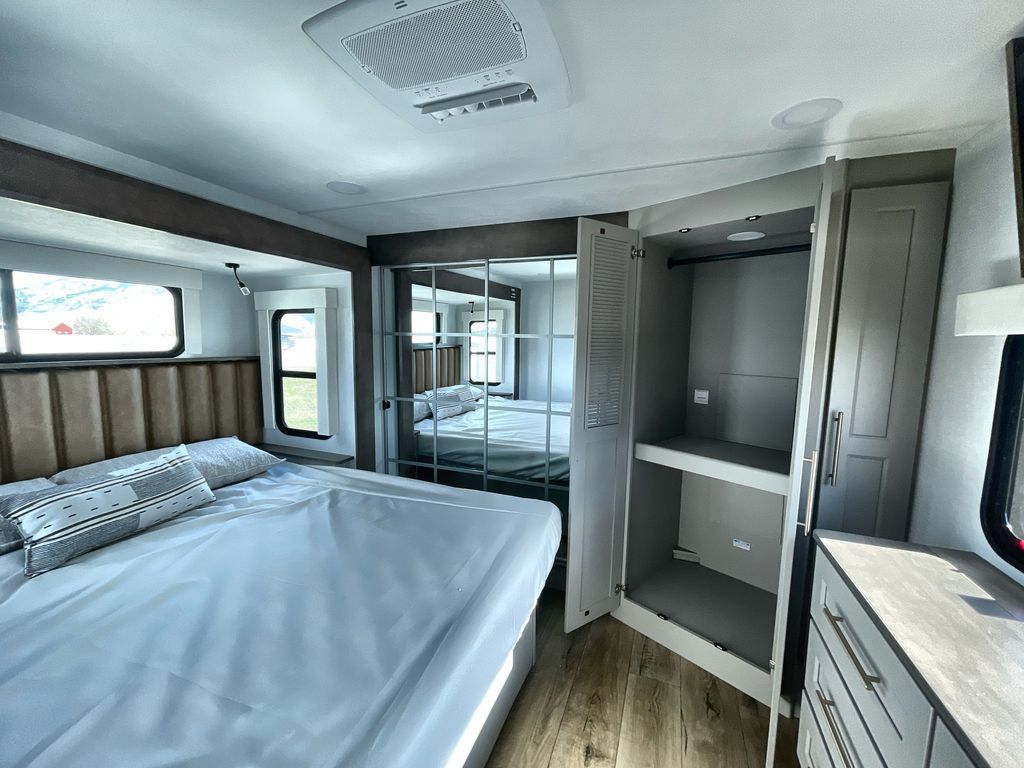 Search for the best views, the nicest RV park, or a place you haven't seen for years with this Paradigm in tow! There is a king bed slide in the master bedroom, a Smart TV, and a dresser with flip-up hidden storage for your belongings. The full bathroom offers a large residential shower, a porcelain toilet with a soft close seat, and storage for your linens, while the kitchen gives you two pantries, an island with a large undermount single basin sink and dishwasher prep if you want the option for easy clean up. You will also have a residential microwave and range, plus a 3.73 cu. ft. oven to make meals. When you're ready to relax for the evening, head to the rear living area to enjoy the dual recliner love seat across from the 50" Smart TV and fireplace!