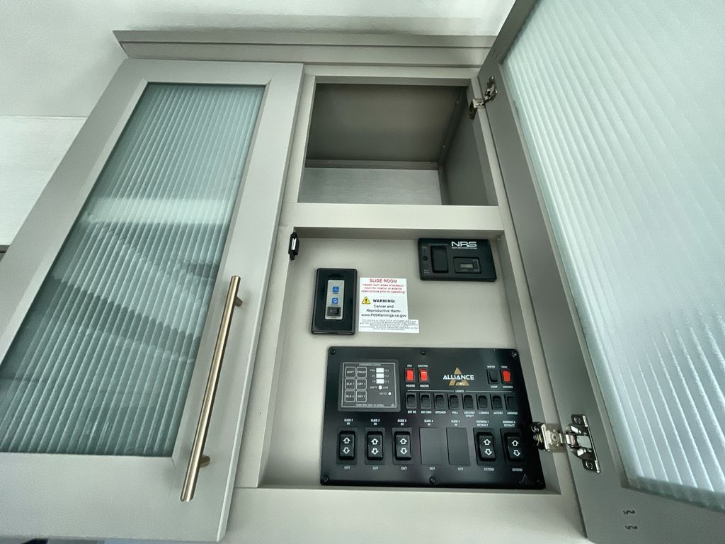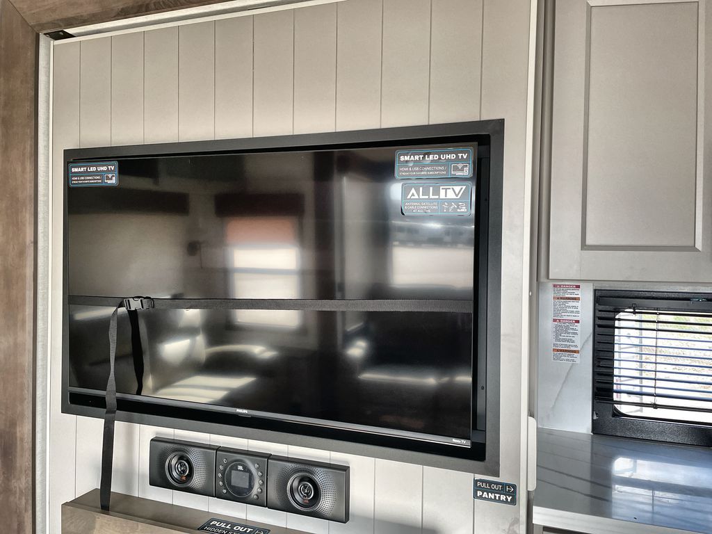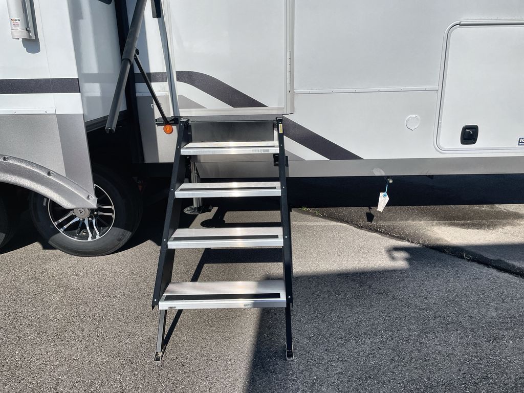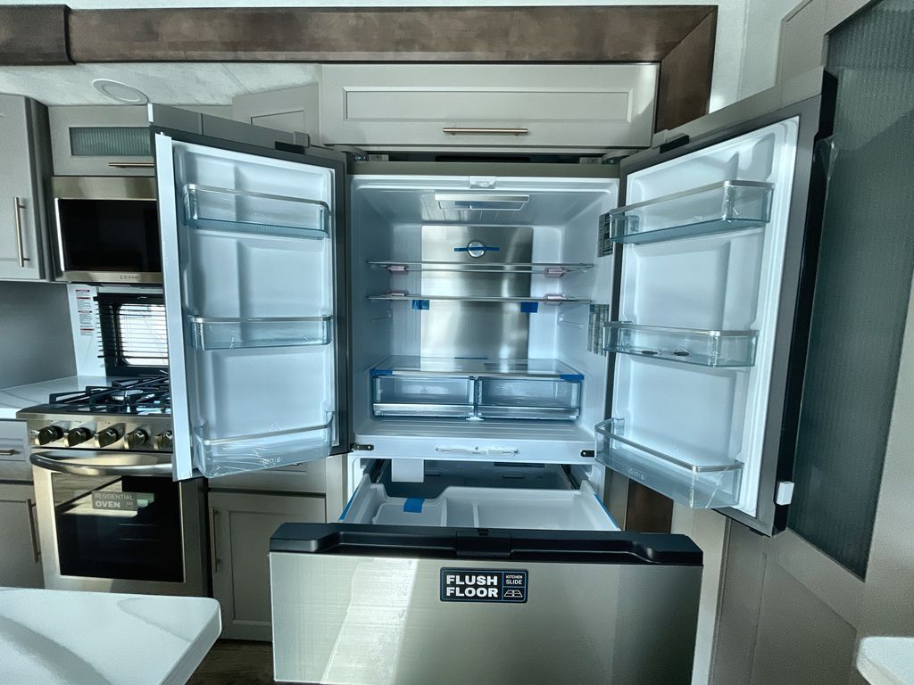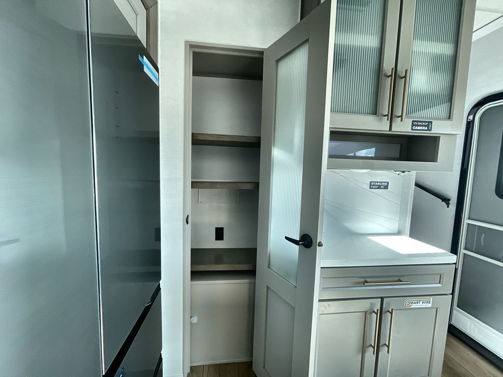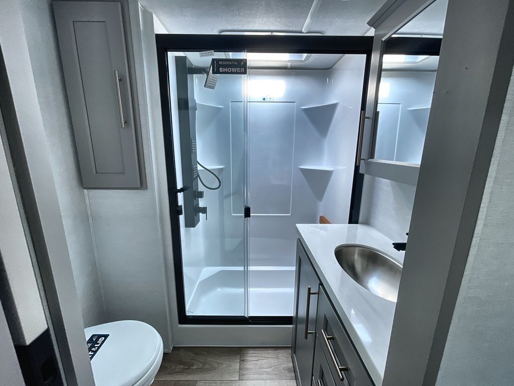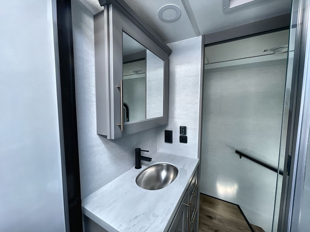 Search for the best views, the nicest RV park, or a place you haven't seen for years with this Paradigm in tow! There is a king bed slide in the master bedroom, a Smart TV, and a dresser with flip-up hidden storage for your belongings. The full bathroom offers a large residential shower, a porcelain toilet with a soft close seat, and storage for your linens, while the kitchen gives you two pantries, an island with a large undermount single basin sink and dishwasher prep if you want the option for easy clean up. You will also have a residential microwave and range, plus a 3.73 cu. ft. oven to make meals. When you're ready to relax for the evening, head to the rear living area to enjoy the dual recliner love seat across from the 50" Smart TV and fireplace!
