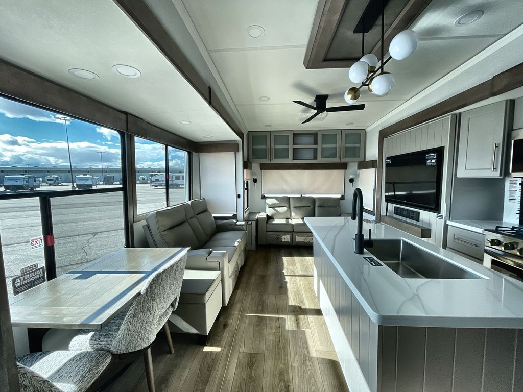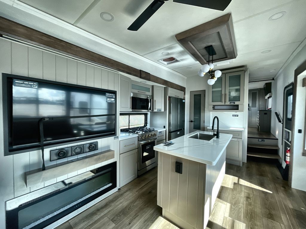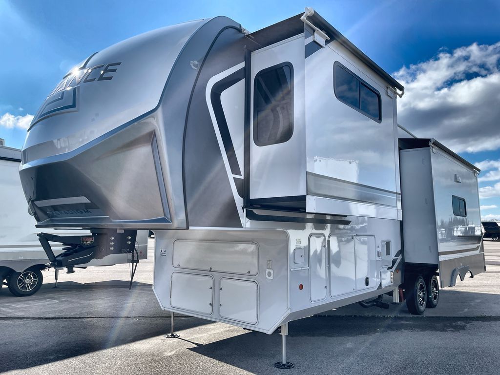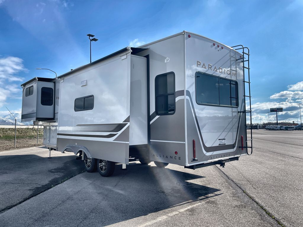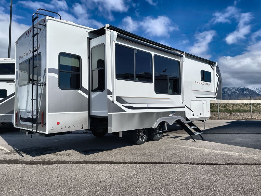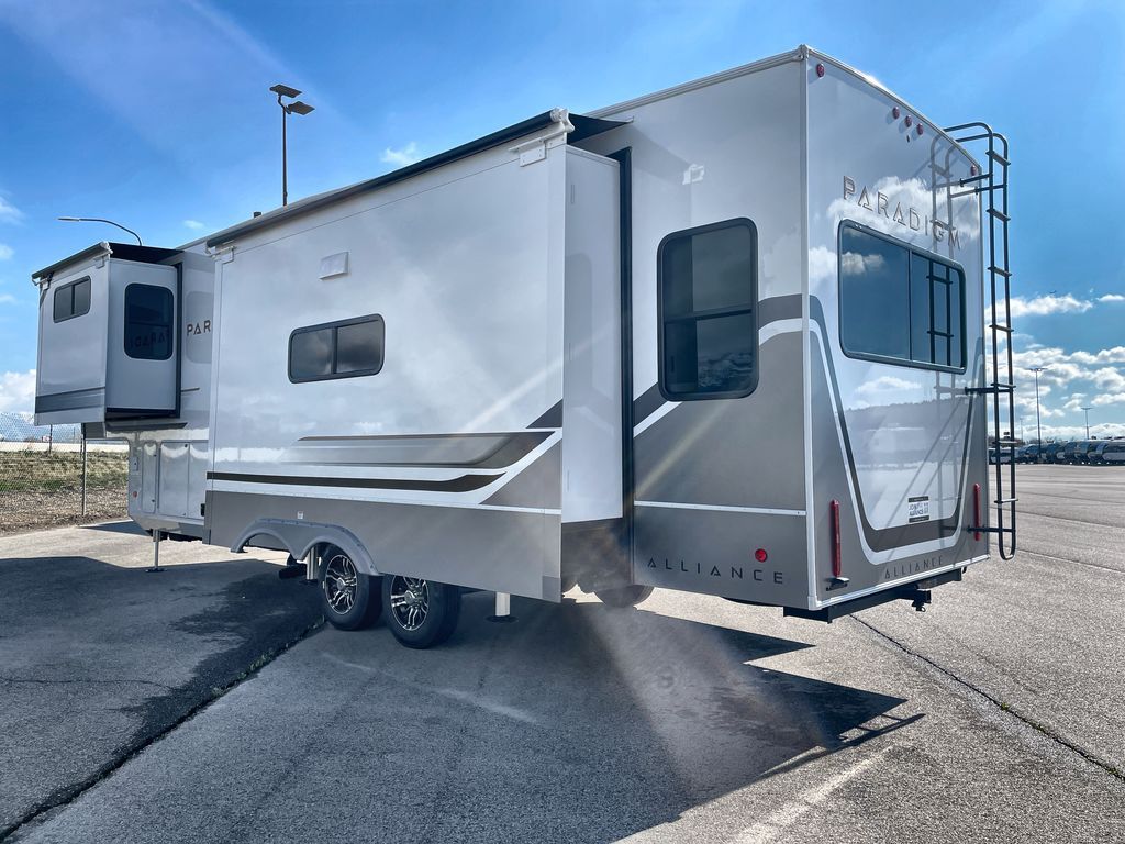 The Paradigm fifth wheels by Alliance RV are functional, high-quality, and luxurious for an unforgettable camping experience. There are three A/C units and a 40K BTU furnace to keep you comfortable year around, and you'll appreciate additional convenient amenities, like the all-in-one enclosed/heated utility center and the color coded and numbered wiring. A Helux Series coil spring pin box comes standard for hassle-free towing, along with Curt 8,000 lb. axles. You'll love the kitchen with its LG solid surface countertops and Lusso range, plus there is LED motion lighting in the pantry and a Maxx fan with a rain sensor to keep everything fresh when making dinner. Each model also includes an HD Smart TV in the living room and bedroom. And of course there are a variety of options you can choose from to further customize your fifth wheel; dual pane windows, Super Solar Plus, slide out awning toppers, and generator prep or a generator to name a few!