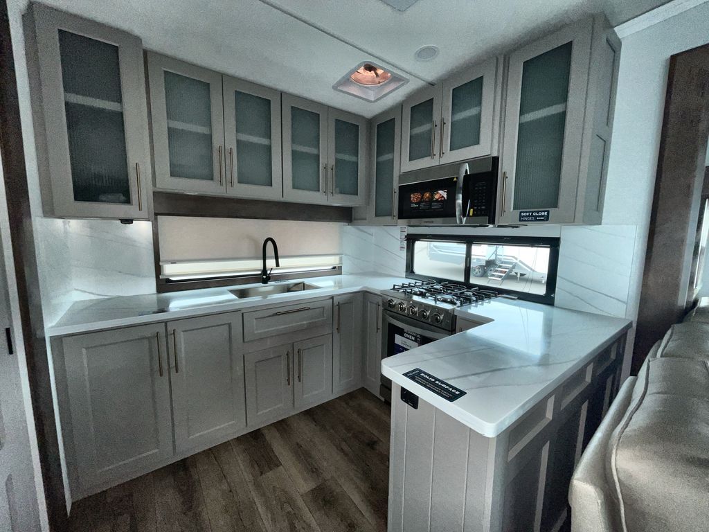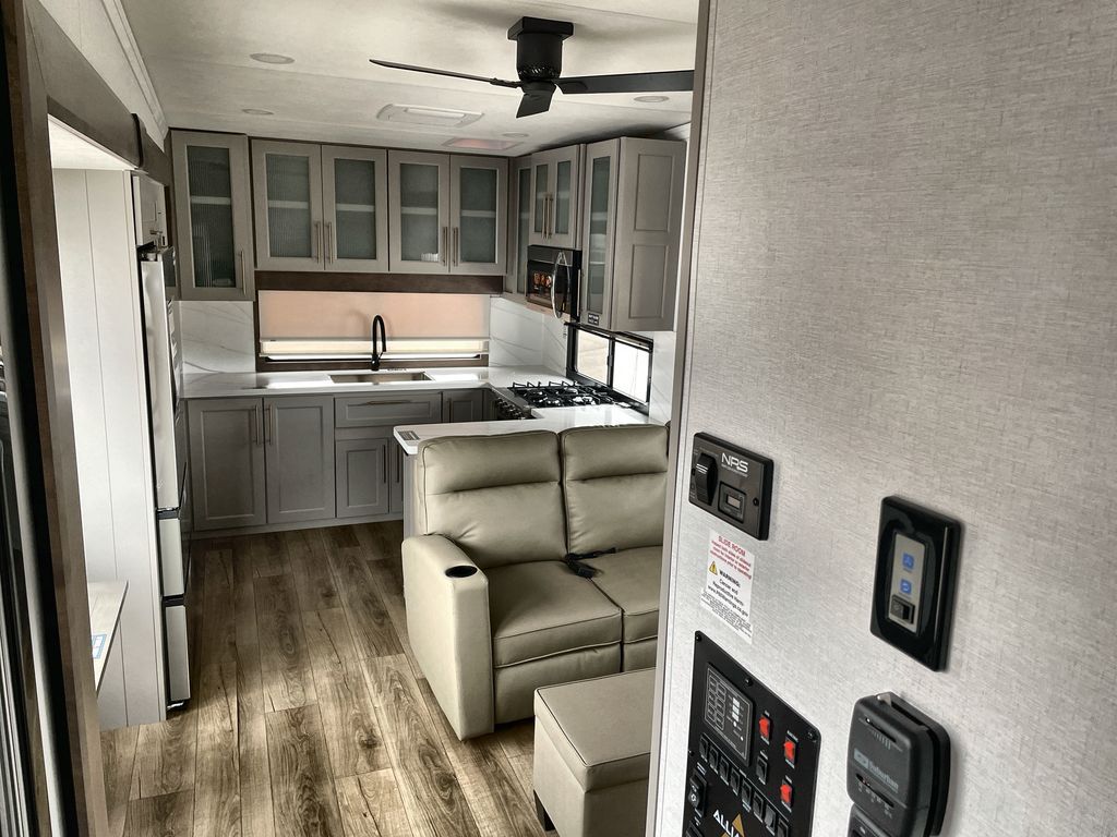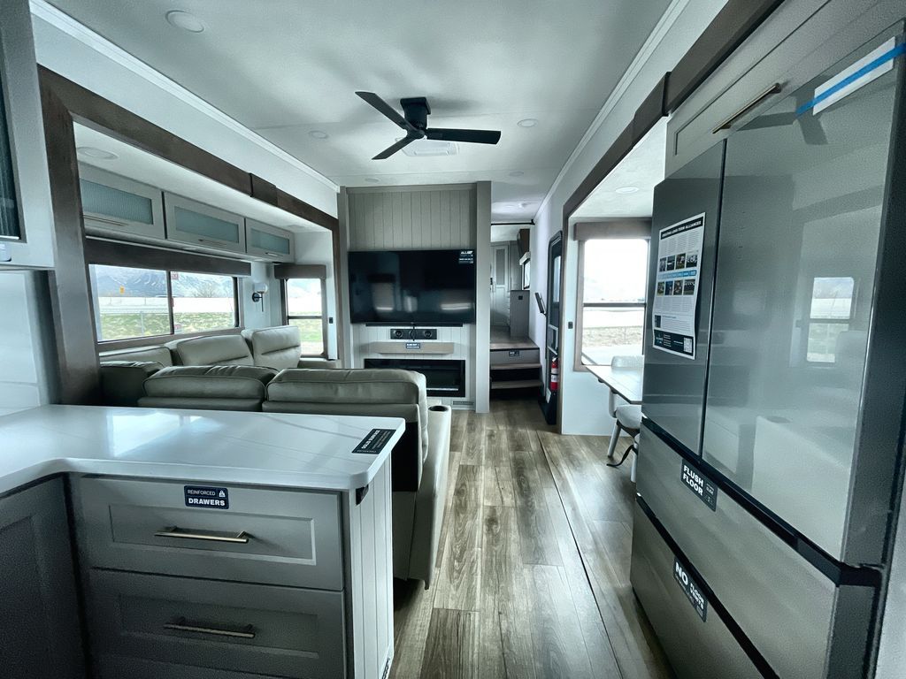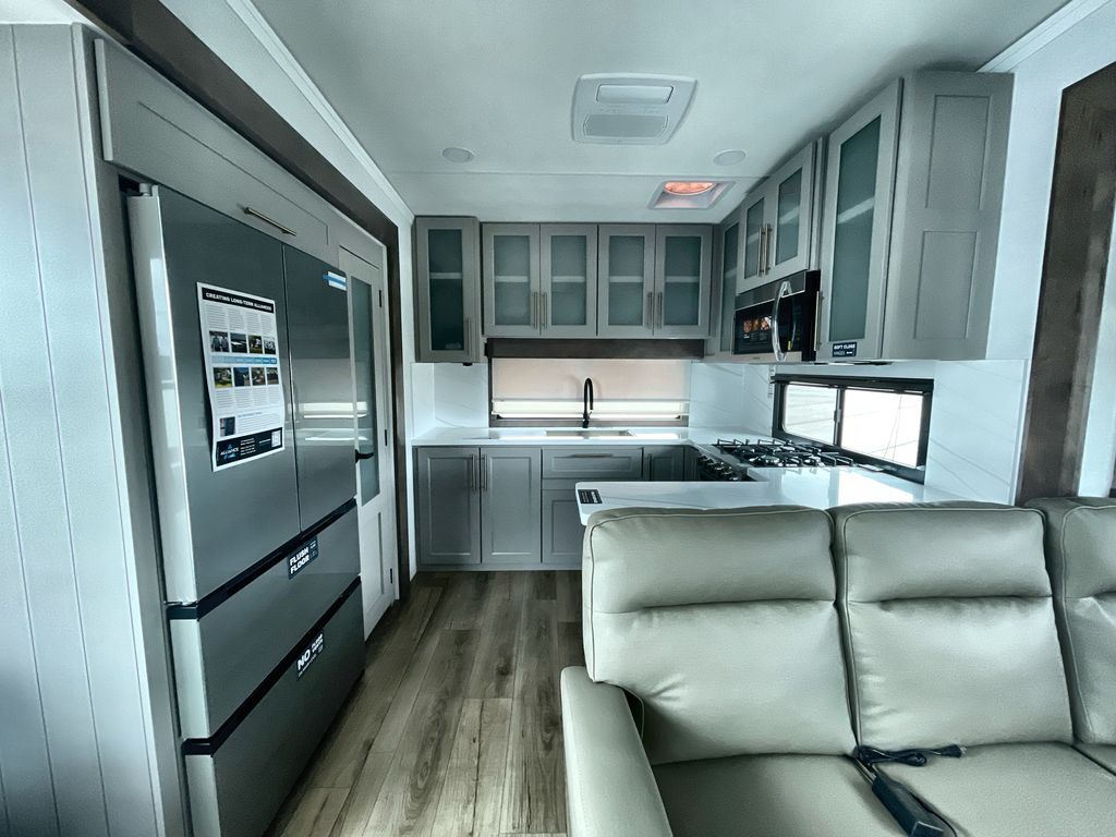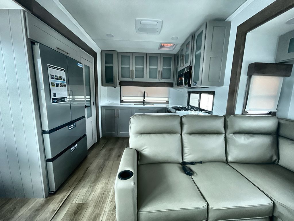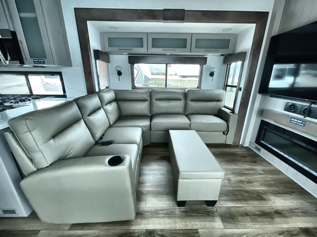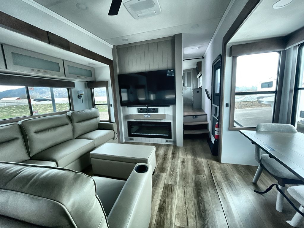 Escape the ordinary and experience the ultimate in luxury travel with this stunning fifth wheel! The rear kitchen is the heart of this fifth wheel, featuring a spacious pantry, 12V refrigerator, microwave, and overhead cabinets. Prepare delicious meals with ease and enjoy the convenience of a fully-equipped kitchen. Unwind in the spacious living area, featuring a plush trifold sofa, L-shape sofa, and a dual recliner love seat. Gather around the turntable dinette or relax in front of the stunning 65” TV. The full bathroom provides a serene space for personal care, while the front bedroom is a peaceful retreat with a comfortable queen bed and a flip-top dresser. Enjoy your favorite shows on the smart TV, perfect for relaxing after a day of adventure.
