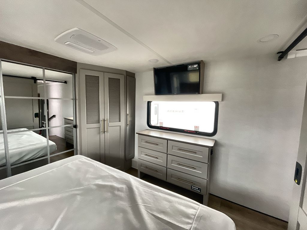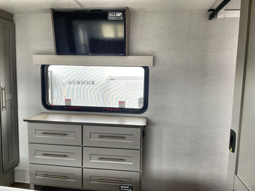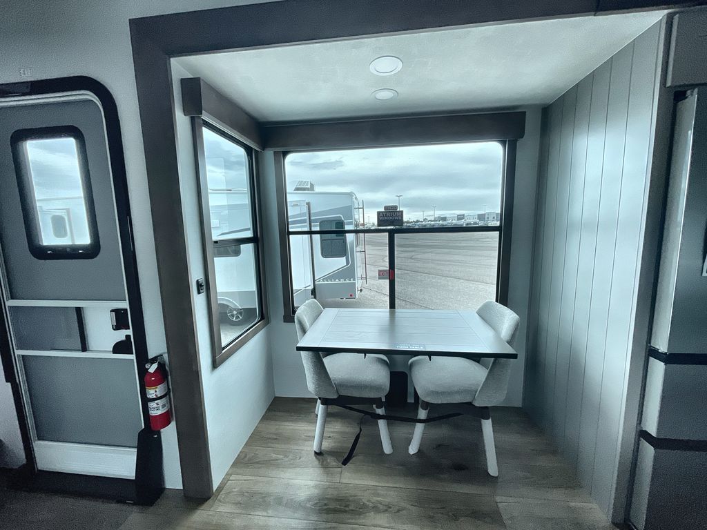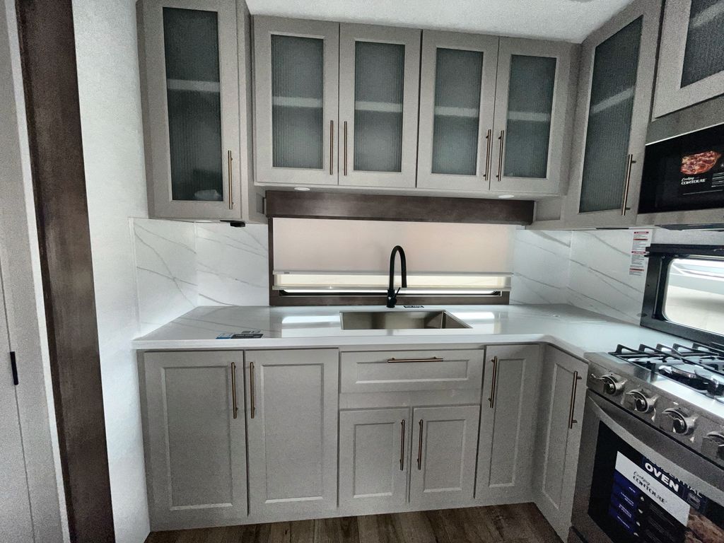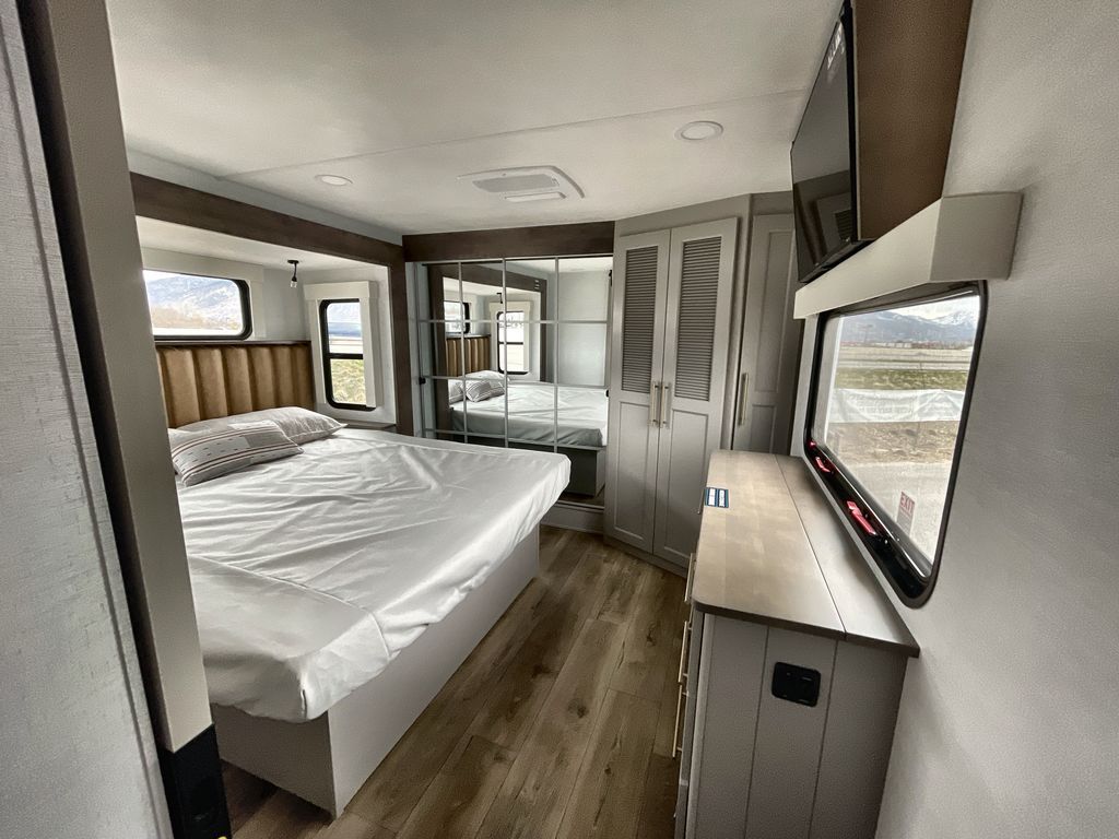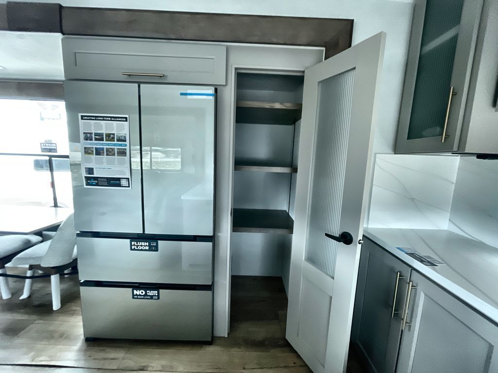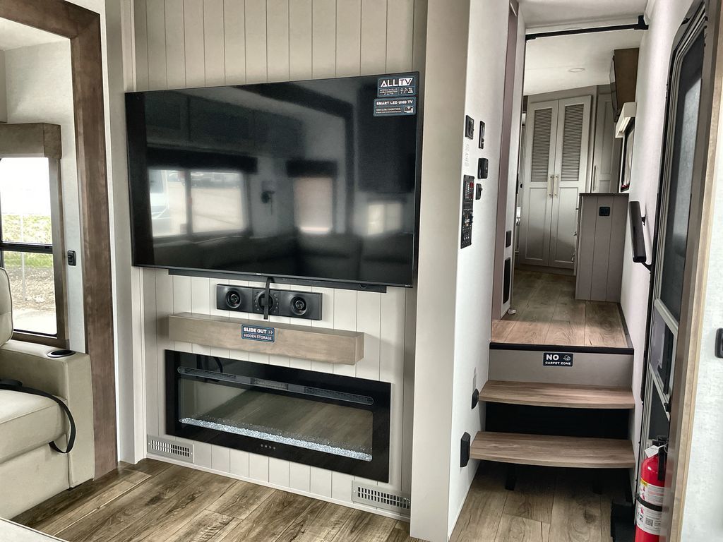 Escape the ordinary and experience the ultimate in luxury travel with this stunning fifth wheel! The rear kitchen is the heart of this fifth wheel, featuring a spacious pantry, 12V refrigerator, microwave, and overhead cabinets. Prepare delicious meals with ease and enjoy the convenience of a fully-equipped kitchen. Unwind in the spacious living area, featuring a plush trifold sofa, L-shape sofa, and a dual recliner love seat. Gather around the turntable dinette or relax in front of the stunning 65” TV. The full bathroom provides a serene space for personal care, while the front bedroom is a peaceful retreat with a comfortable queen bed and a flip-top dresser. Enjoy your favorite shows on the smart TV, perfect for relaxing after a day of adventure.