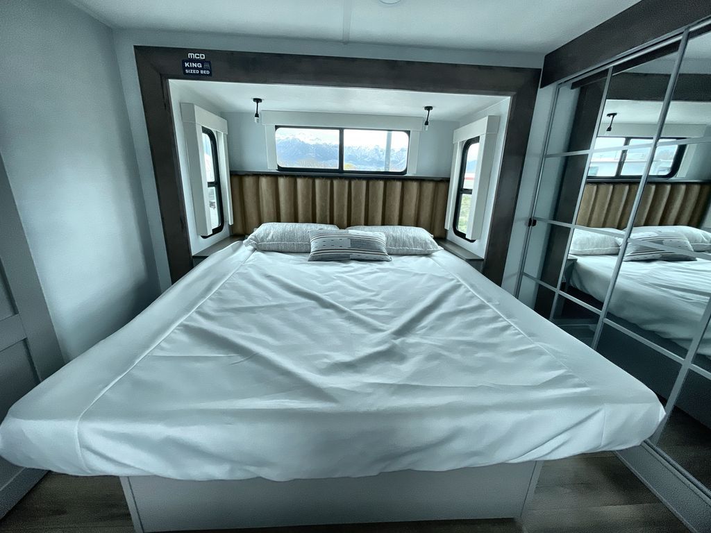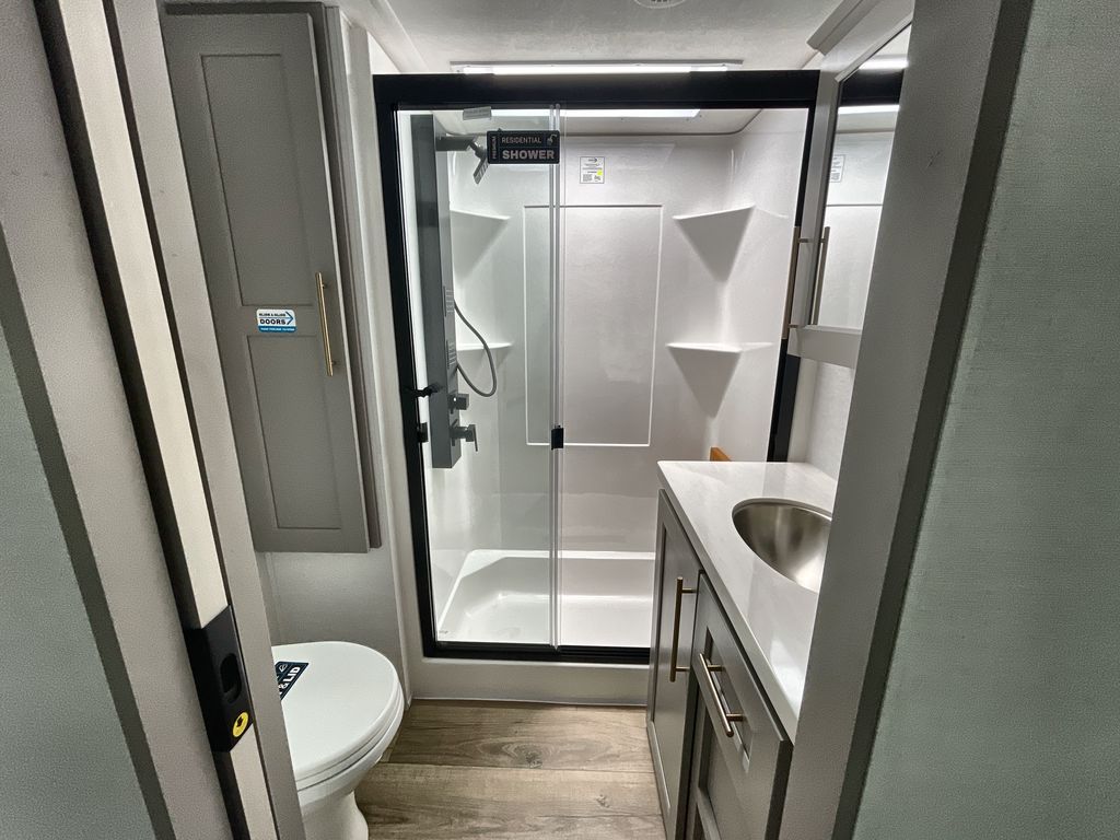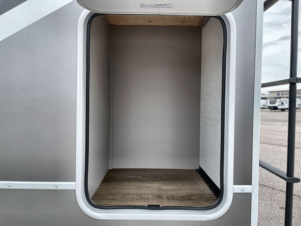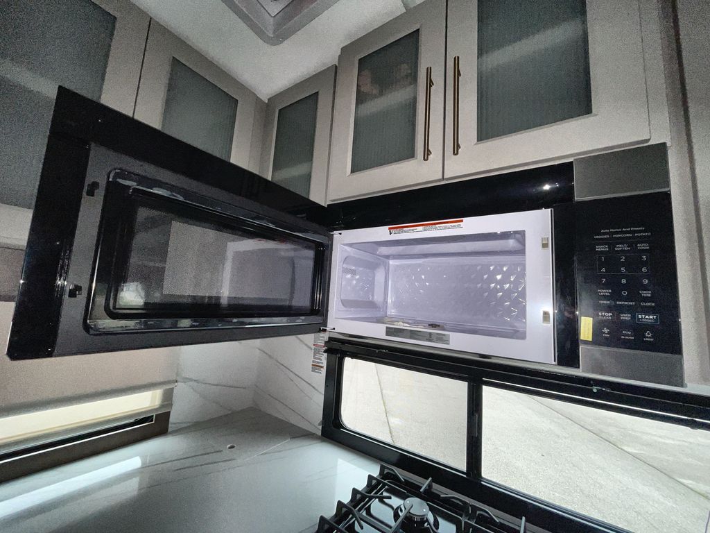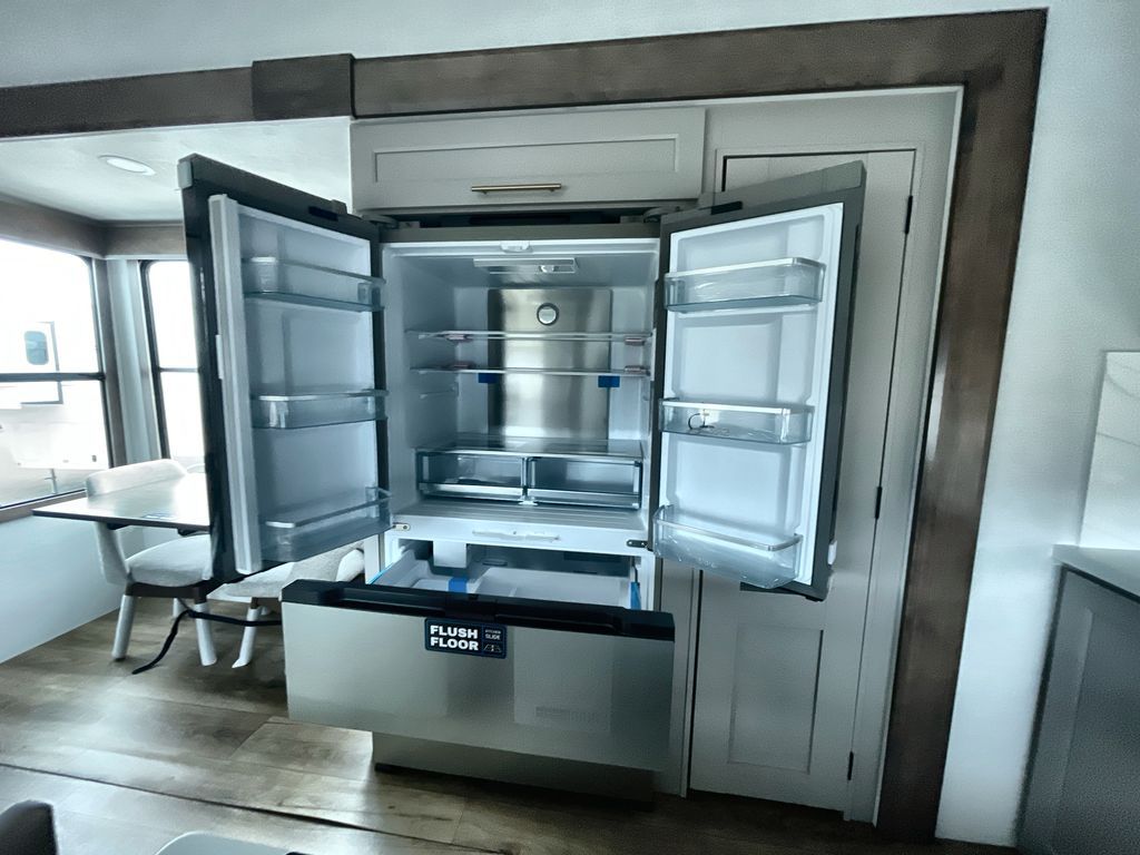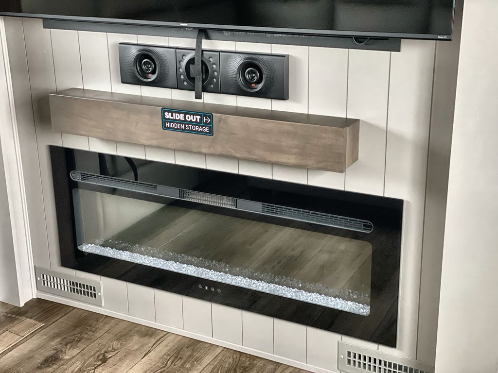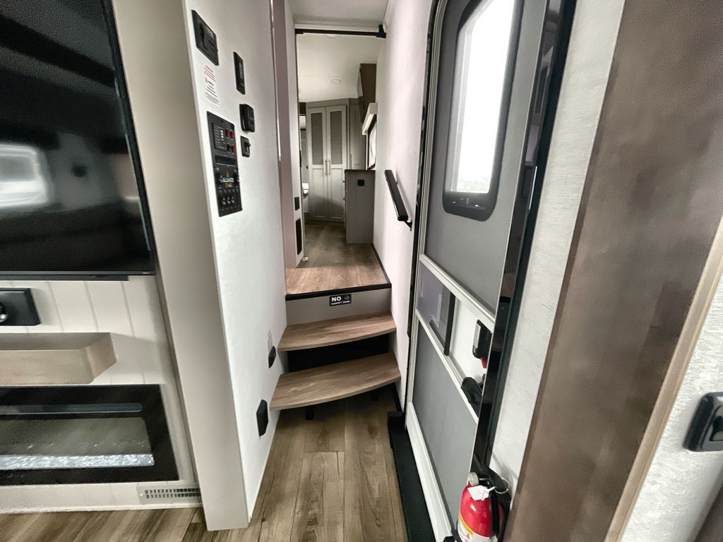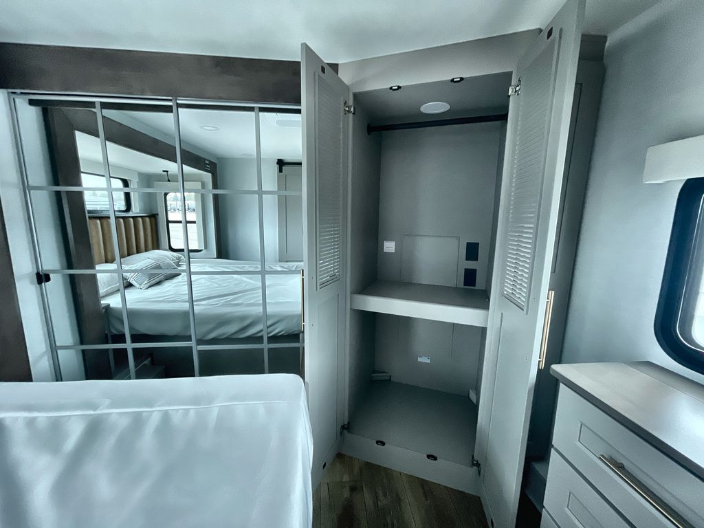 Escape the ordinary and experience the ultimate in luxury travel with this stunning fifth wheel! The rear kitchen is the heart of this fifth wheel, featuring a spacious pantry, 12V refrigerator, microwave, and overhead cabinets. Prepare delicious meals with ease and enjoy the convenience of a fully-equipped kitchen. Unwind in the spacious living area, featuring a plush trifold sofa, L-shape sofa, and a dual recliner love seat. Gather around the turntable dinette or relax in front of the stunning 65” TV. The full bathroom provides a serene space for personal care, while the front bedroom is a peaceful retreat with a comfortable queen bed and a flip-top dresser. Enjoy your favorite shows on the smart TV, perfect for relaxing after a day of adventure.