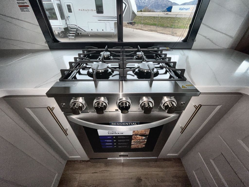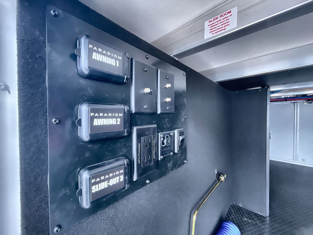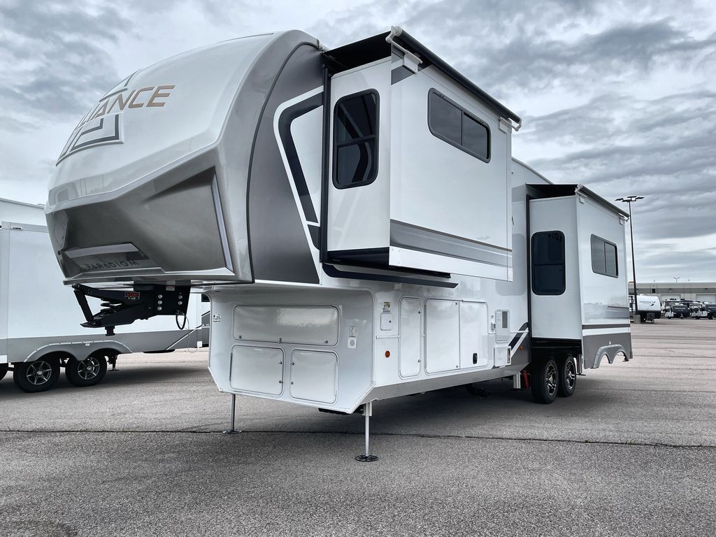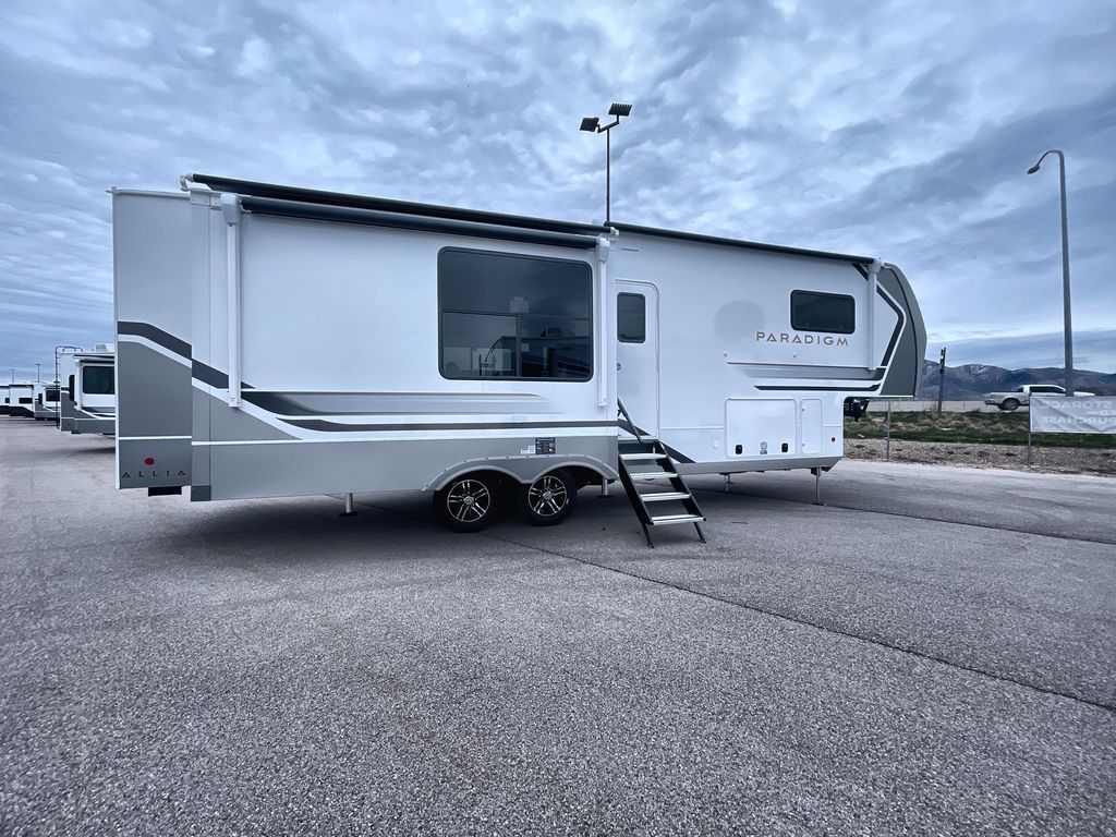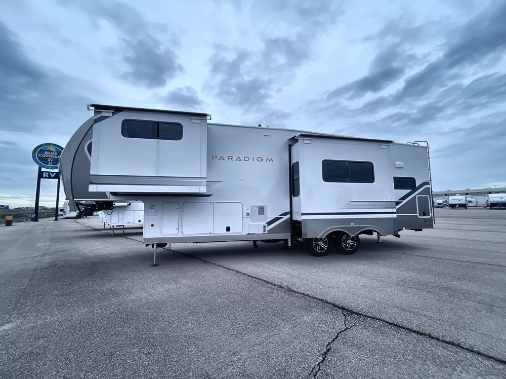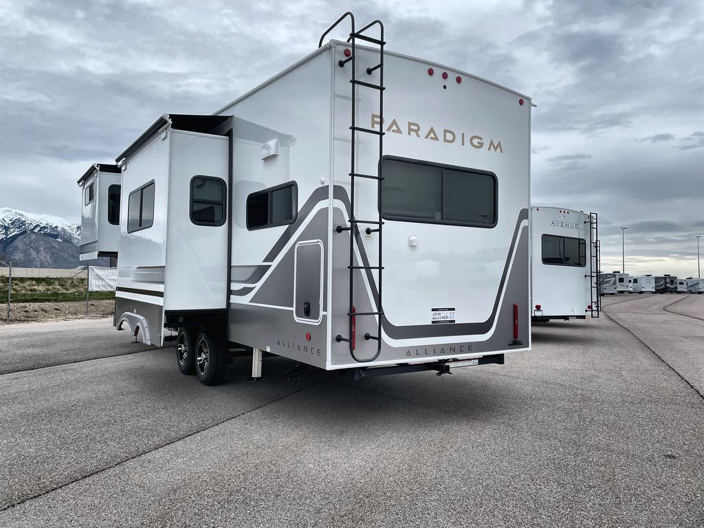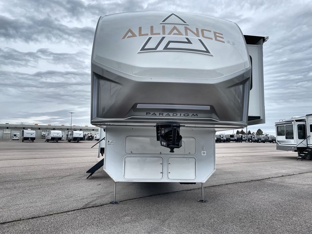 The Paradigm fifth wheels by Alliance RV are functional, high-quality, and luxurious for an unforgettable camping experience. There are three A/C units and a 40K BTU furnace to keep you comfortable year around, and you'll appreciate additional convenient amenities, like the all-in-one enclosed/heated utility center and the color coded and numbered wiring. A Helux Series coil spring pin box comes standard for hassle-free towing, along with Curt 8,000 lb. axles. You'll love the kitchen with its LG solid surface countertops and Lusso range, plus there is LED motion lighting in the pantry and a Maxx fan with a rain sensor to keep everything fresh when making dinner. Each model also includes an HD Smart TV in the living room and bedroom. And of course there are a variety of options you can choose from to further customize your fifth wheel; dual pane windows, Super Solar Plus, slide out awning toppers, and generator prep or a generator to name a few!