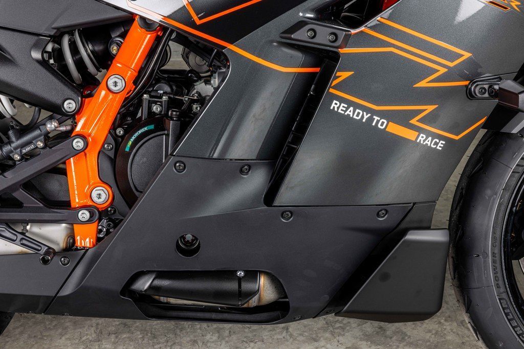 The 947 cc, parallel twin LC8c has been harnessed even further thanks to a tweaked engine map and 100% full throttle opening position to suit the needs of the KTM 990 RC R and the most compact twin in the segment. The impressive engine breathes through a new stainless steel, centralized exhaust muffler, which also helps to urge the whole show to gobble straights and slice corners.