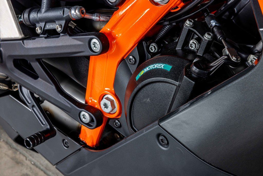 The KTM 990 RC R's ergonomics are standout. To ensure that the rider is integrated in a way to grapple the Supersport DNA of the bike without compromising day-to-day comfort and practicality, KTM has fashioned a tank shape with 6 contact points. The form of the product will suit a wide range of heights and permits the rider to 'glide' around the motorcycle while still being able to exert control through legs, knees and arms. The KTM 990 RC R has aluminum clip-on handlebars, adjustable levers and adjustable footpegs: the standard 'street' setting can be moved 25 mm back and 17 mm higher for a more racing 'track' poise and more influence for full lean angles.