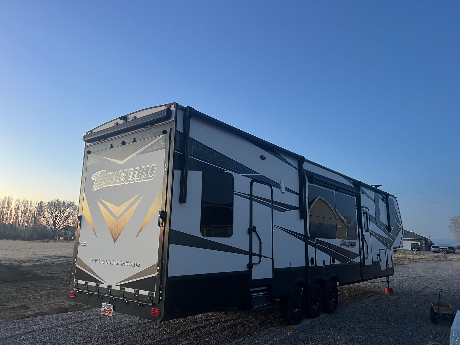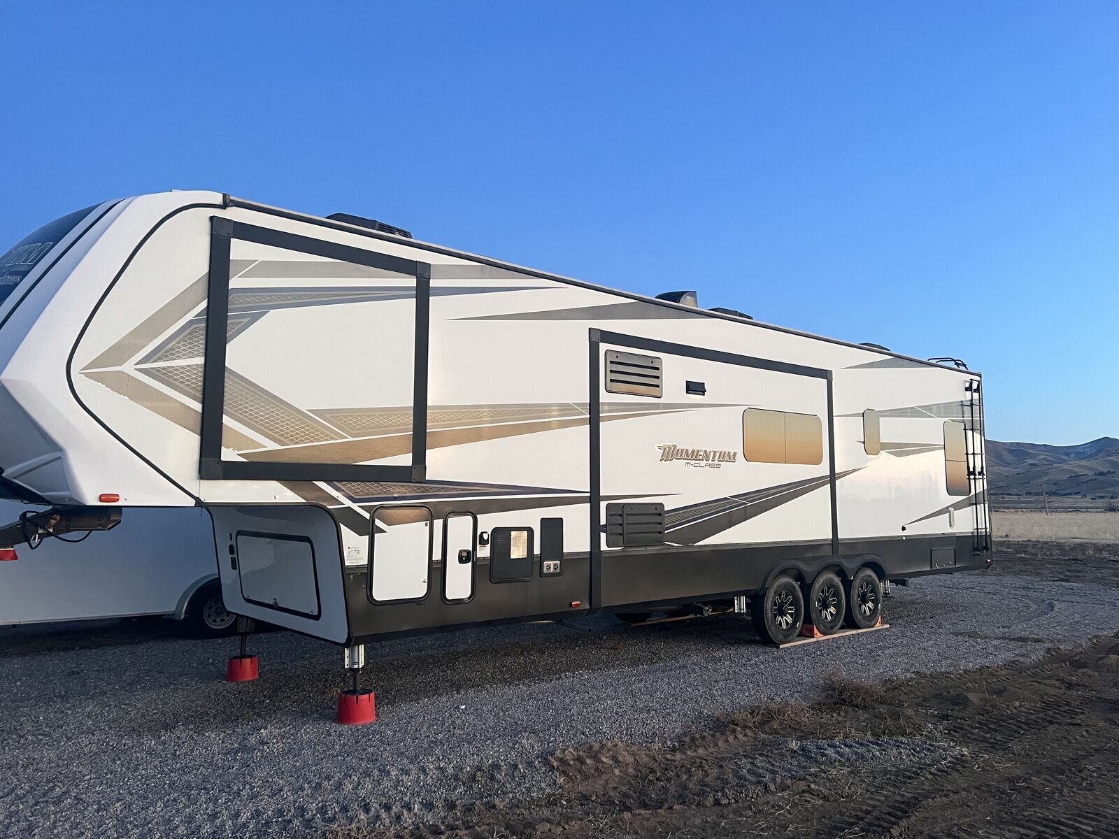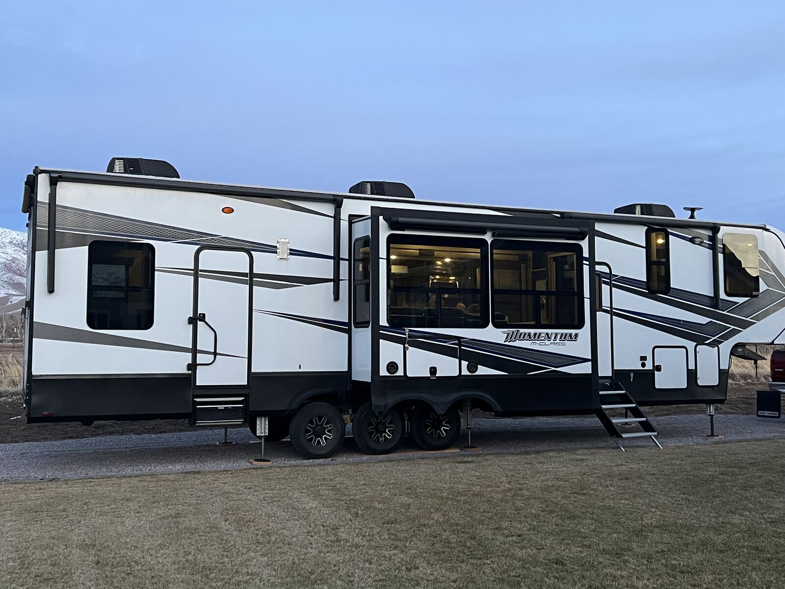 We have absolutely loved this trailer, the only struggle I've had with it is its big and heavy! But what comes with that is its very well built. it has the auto hydraulic leveling system and also the three slides are hydraulic as well which ive really liked and haven't had any problems with. The separate garage in the back does hold my 2017 4 seat turbo rzr but you have to remove the 4 seaso doors on the back doesn't take long at all. the back drop down door turns into a patio. I will try and set the trailer all up so I can up load inside pictures and patio pics with the 4 season doors this weekend. The back garage does have a half bath also. thanks for looking if you have questions I received text or call thank you!