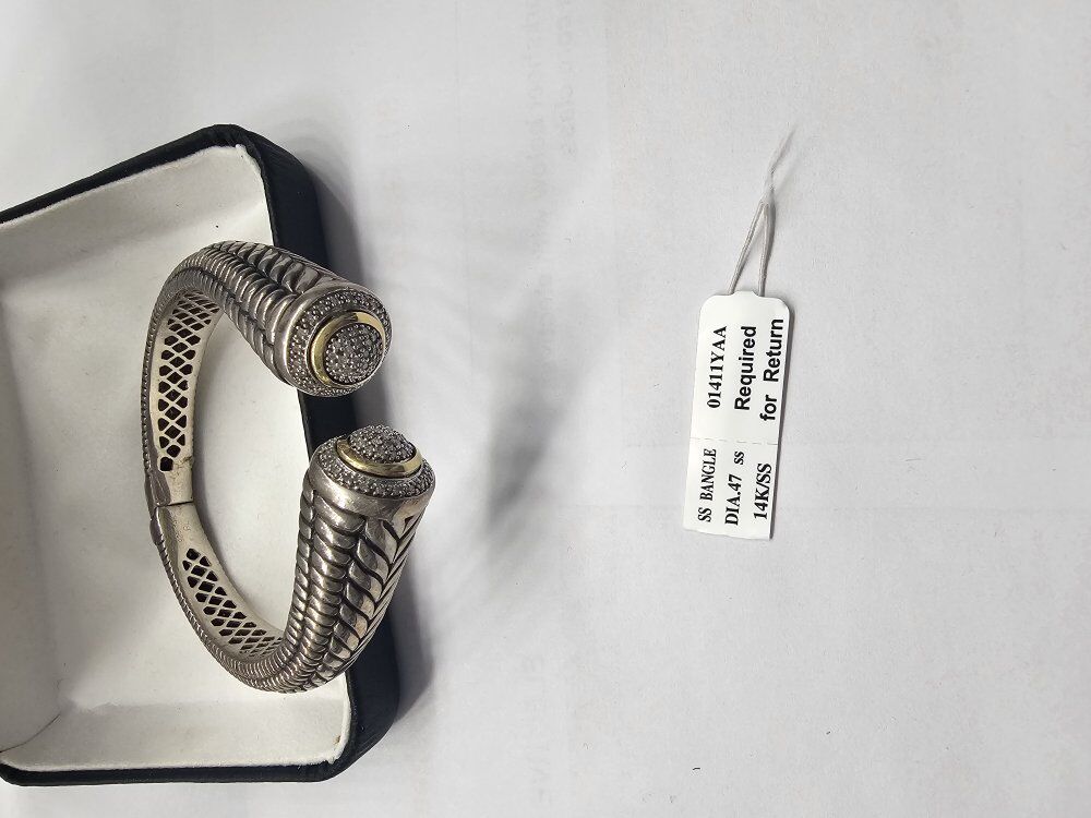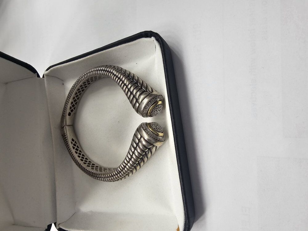 ZelleThis chic sterling silver bangle with 14K gold accents and 0.47 carats of diamonds features an intricate design, perfect for adding elegance to any ensemble. A must-have accessory for stylish occasions