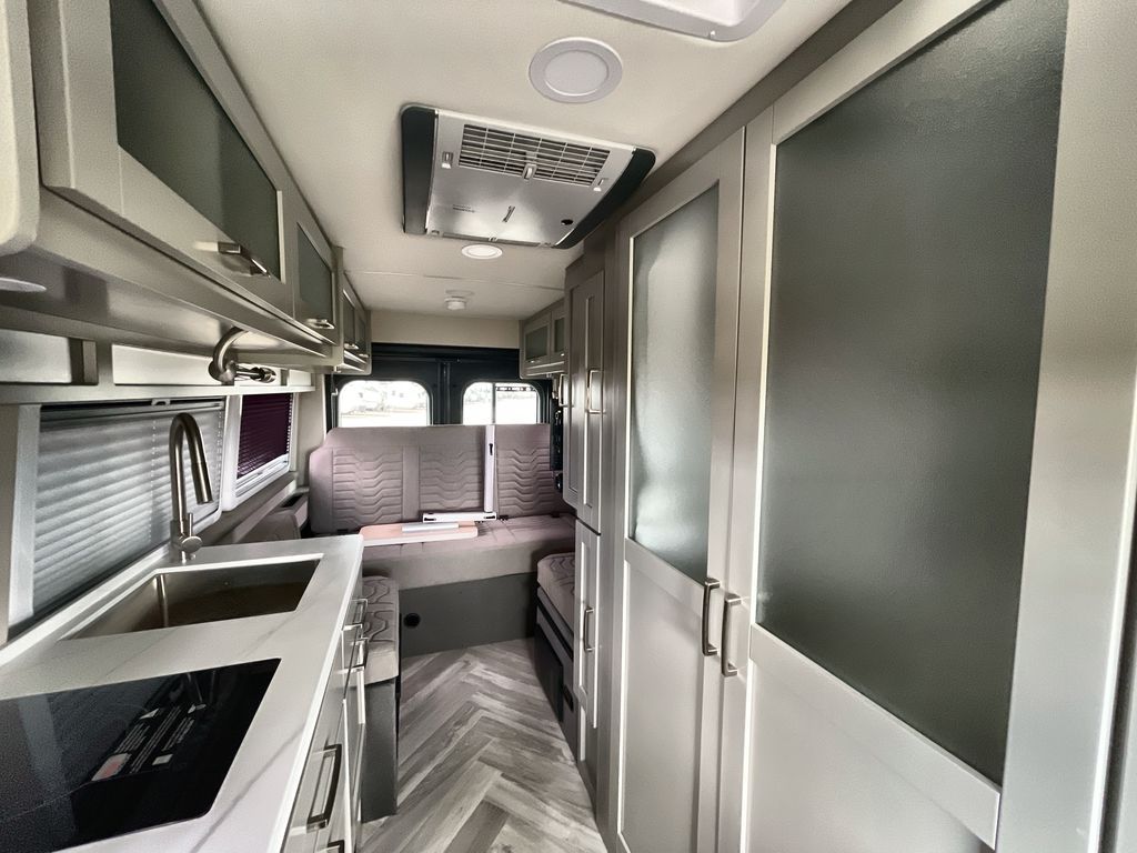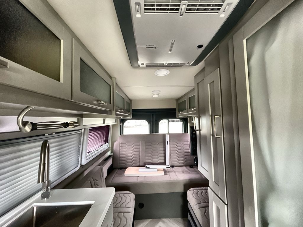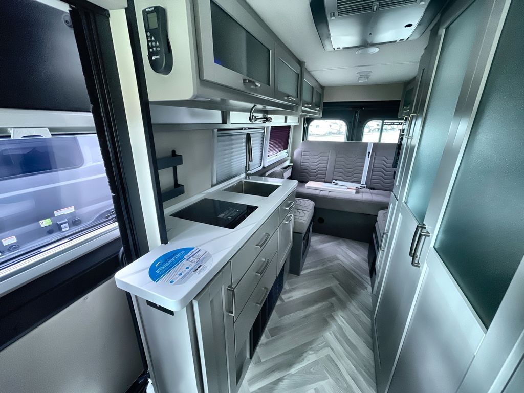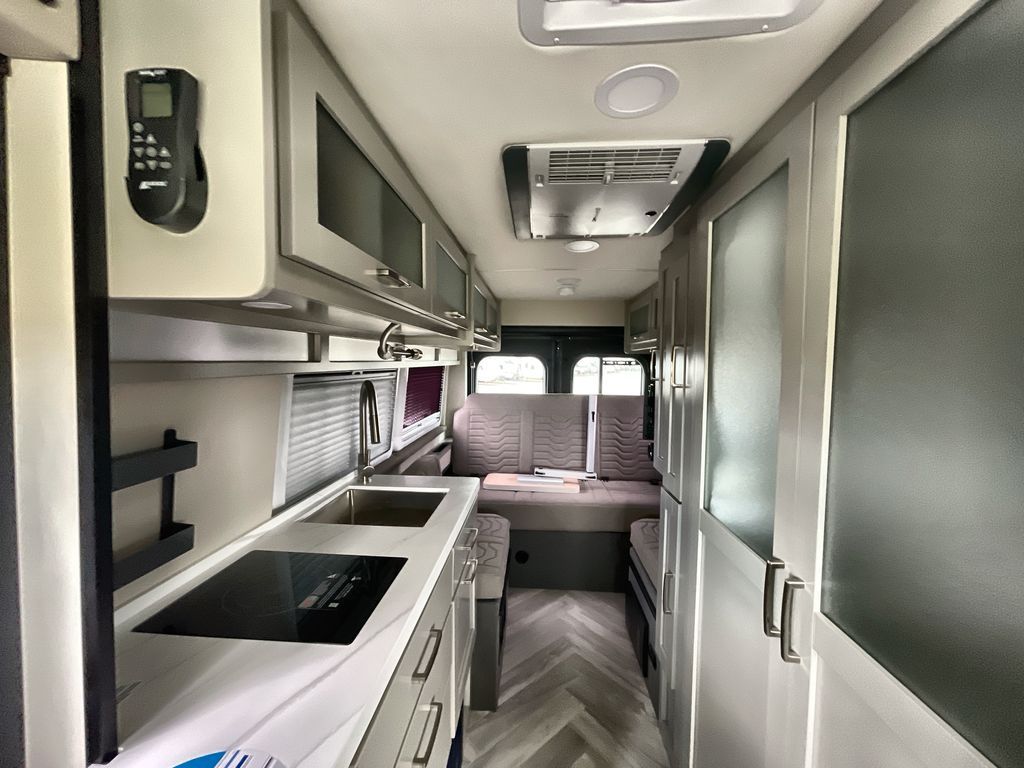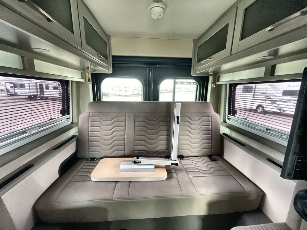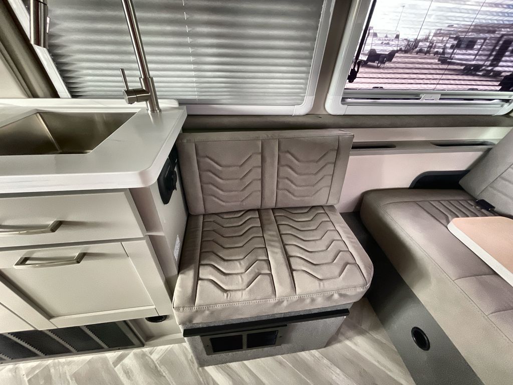 Grab your honey and head to your favorite camping spot in this cozy camper van. Once you park for the day, you can swivel the captain's seats around and enjoy coffee at the swivel table. Lunch can be made on the induction cooktop, and the cold ingredients can go back in the 7.3 cu. ft. refrigerator. The convenient wet bath allows you to freshen up after a hike, and the rear lay-flat power sofa will provide comfortable sleeping space when you're ready to turn in for the night. There are also two jump seats and a swivel table if you want to say up and play a game of cards!