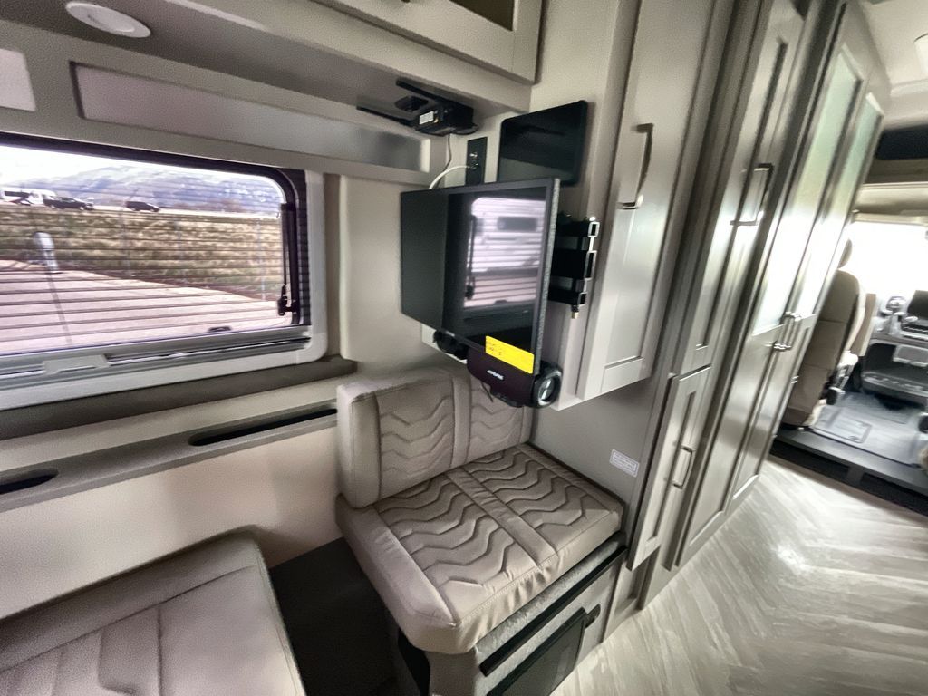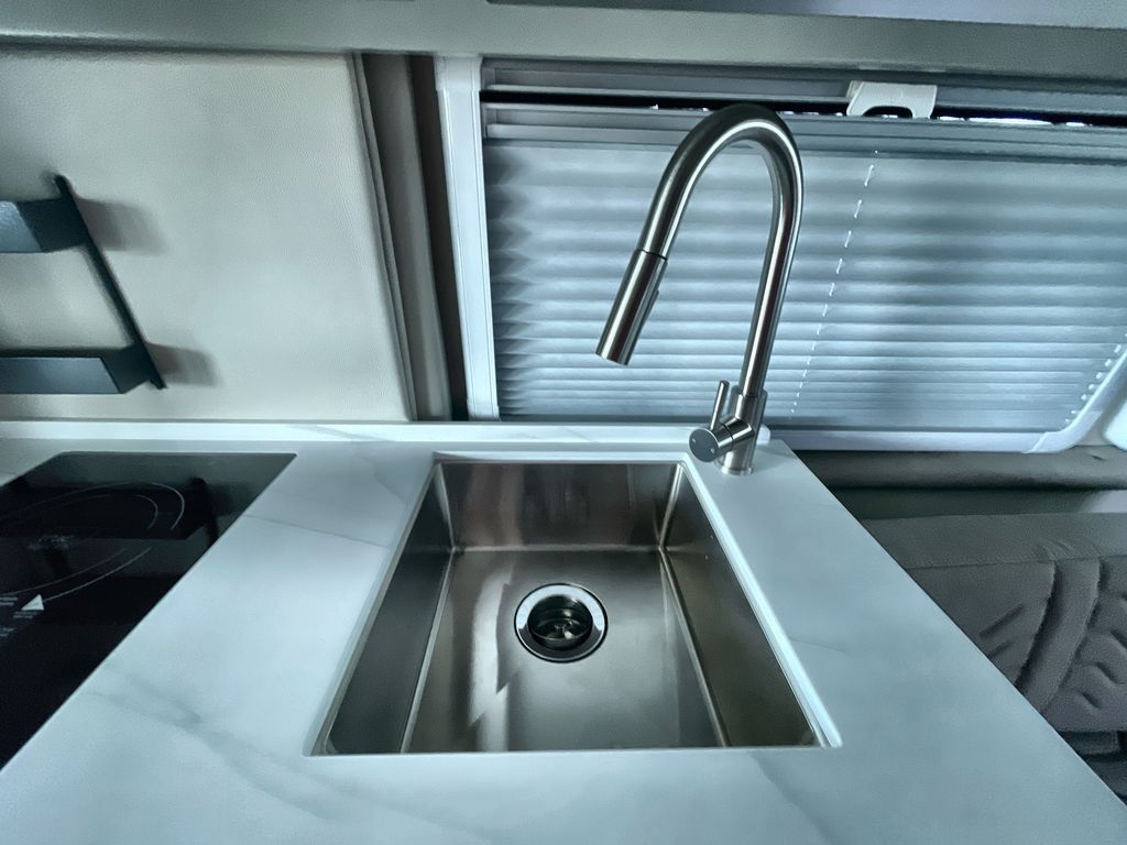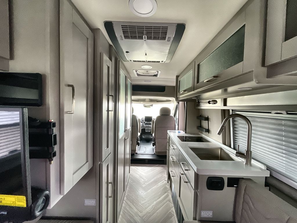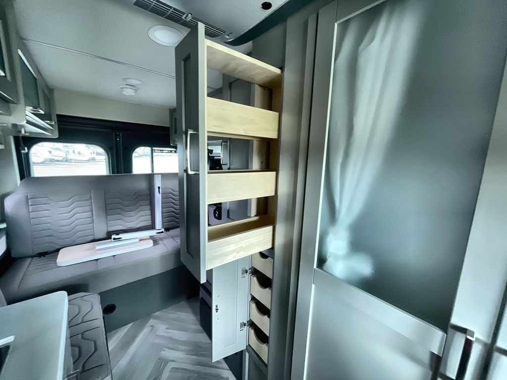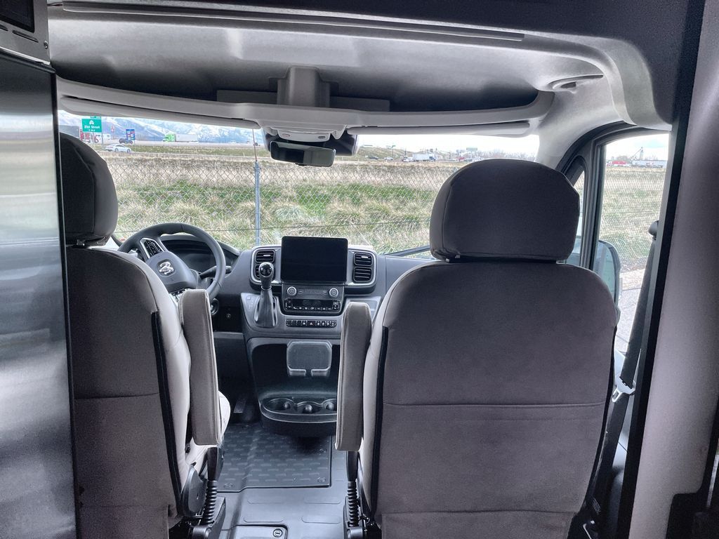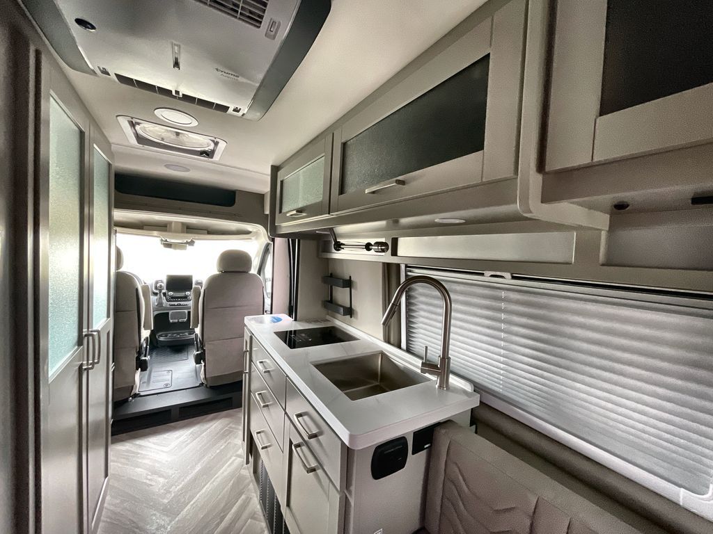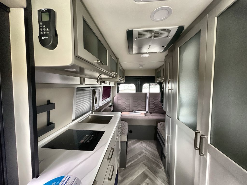 Grab your honey and head to your favorite camping spot in this cozy camper van. Once you park for the day, you can swivel the captain's seats around and enjoy coffee at the swivel table. Lunch can be made on the induction cooktop, and the cold ingredients can go back in the 7.3 cu. ft. refrigerator. The convenient wet bath allows you to freshen up after a hike, and the rear lay-flat power sofa will provide comfortable sleeping space when you're ready to turn in for the night. There are also two jump seats and a swivel table if you want to say up and play a game of cards!
