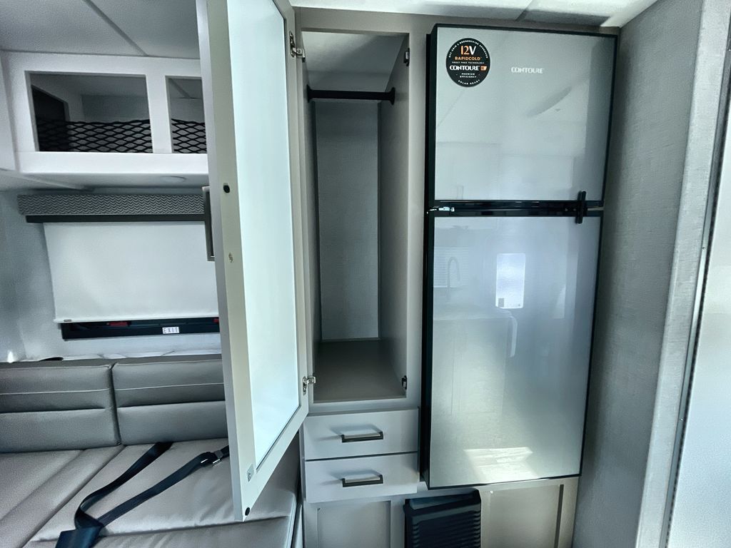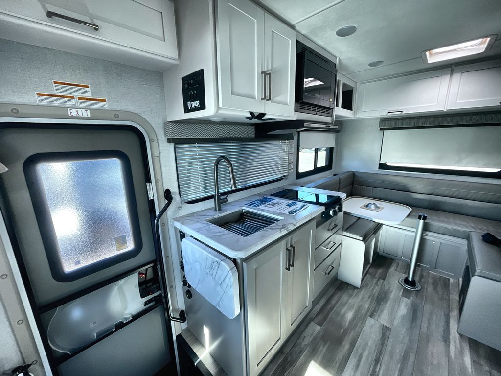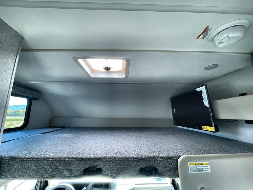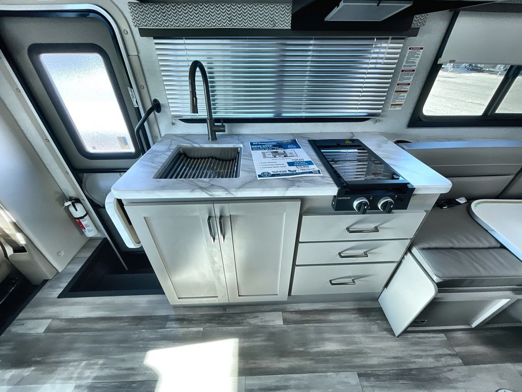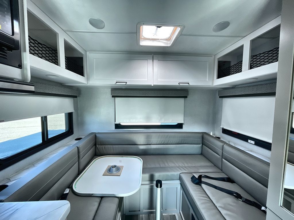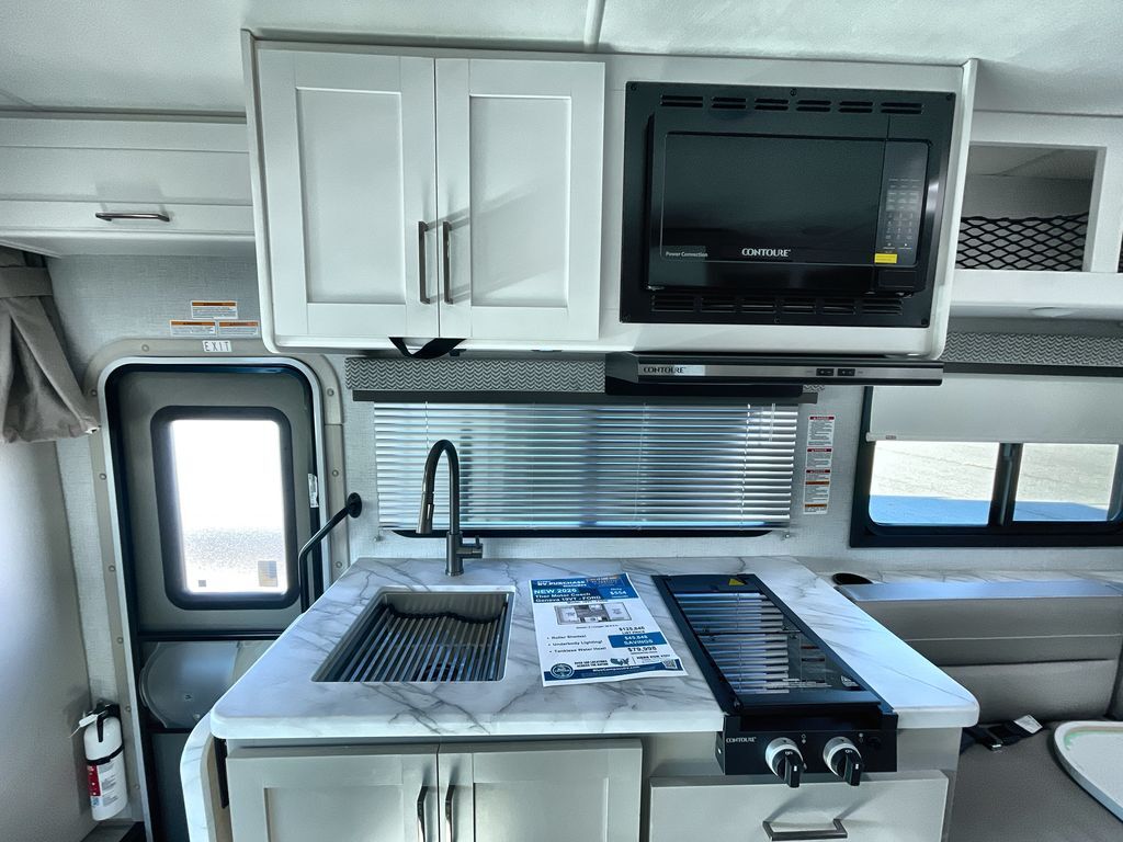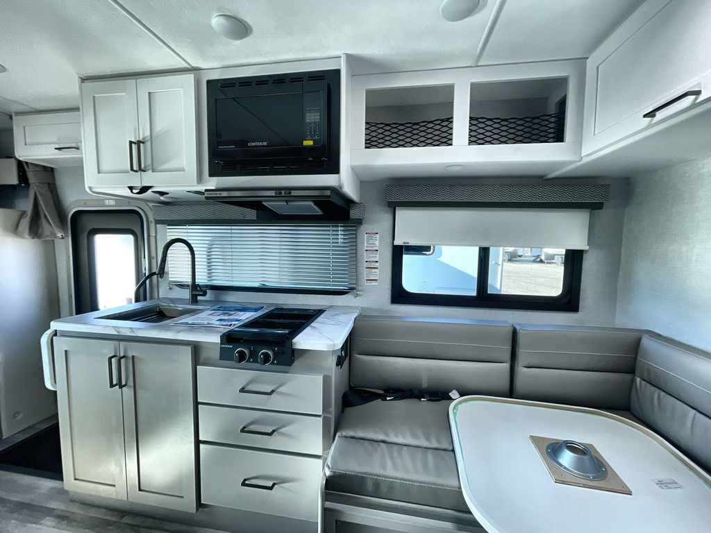 This cozy coach is perfect for three to four happy campers! Once you stop for the day, you can freshen up in the wet bath that includes a foot flush toilet, power vent, and shower skylight for more natural lighting. The two burner cooktop and convection microwave with an air fryer will let you make meals each day, and the 12V refrigerator will keep your food fresh. You'll also appreciate the flip-up countertop for more space to prep meals. There is a U-shaped dinette with a removable table that will convert to a 54" x 77" bed, while the little ones take the cab-over bunk with a 52" x 91" sleeping area.