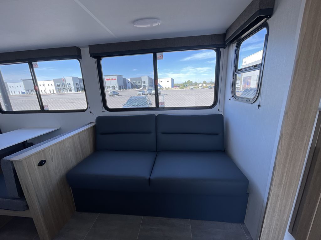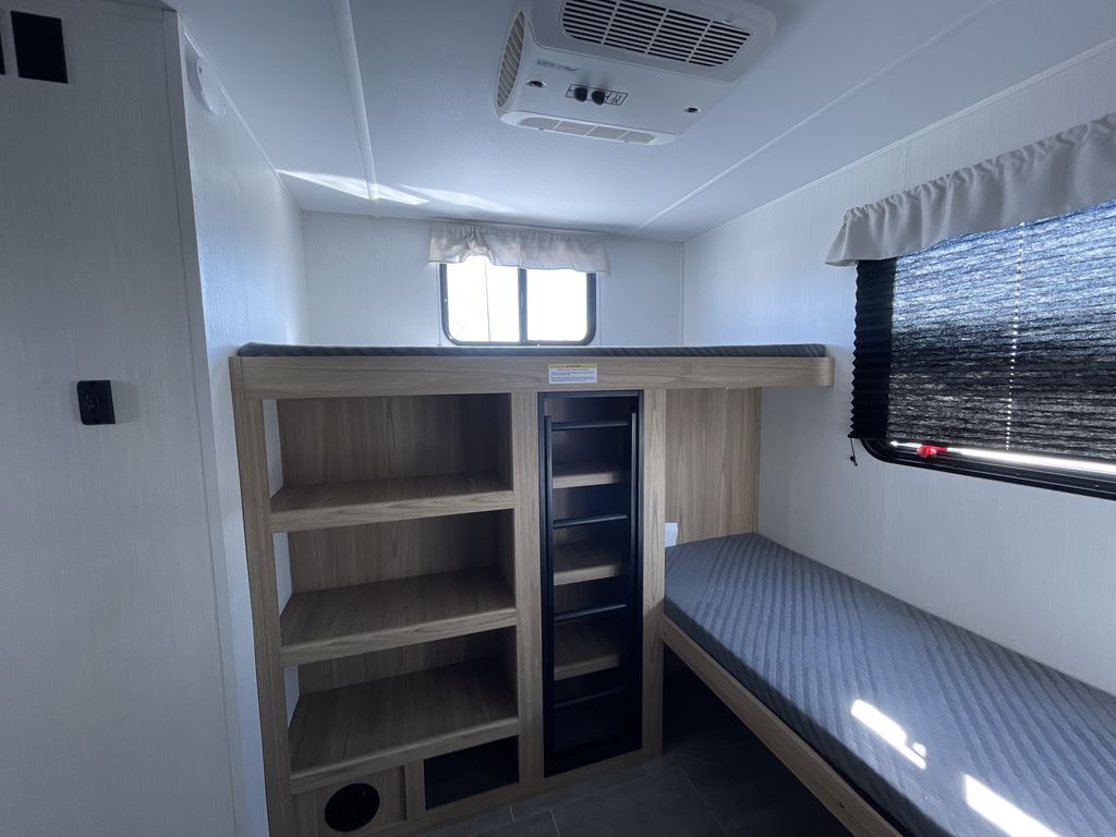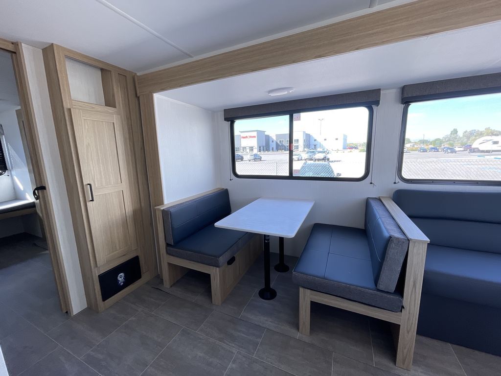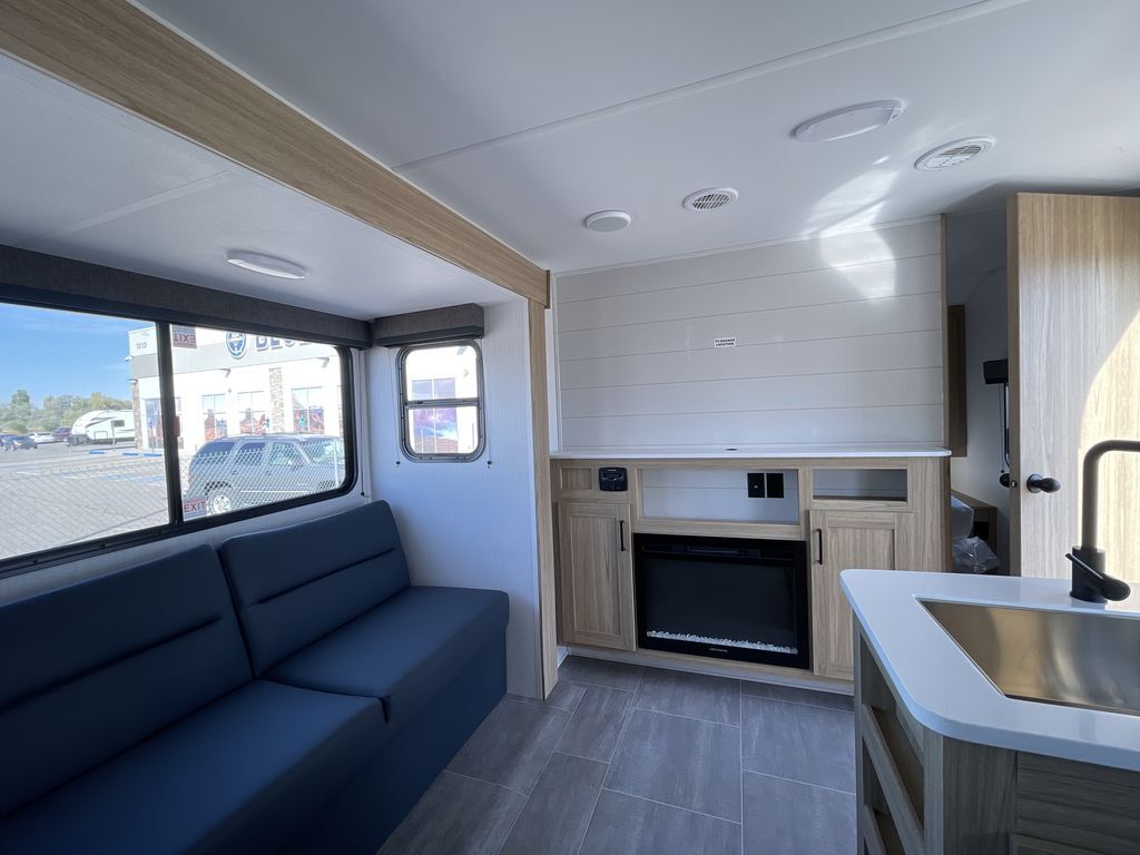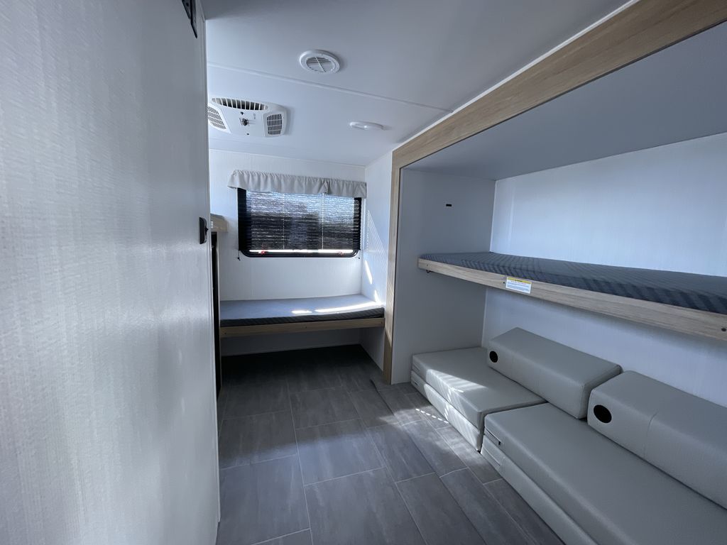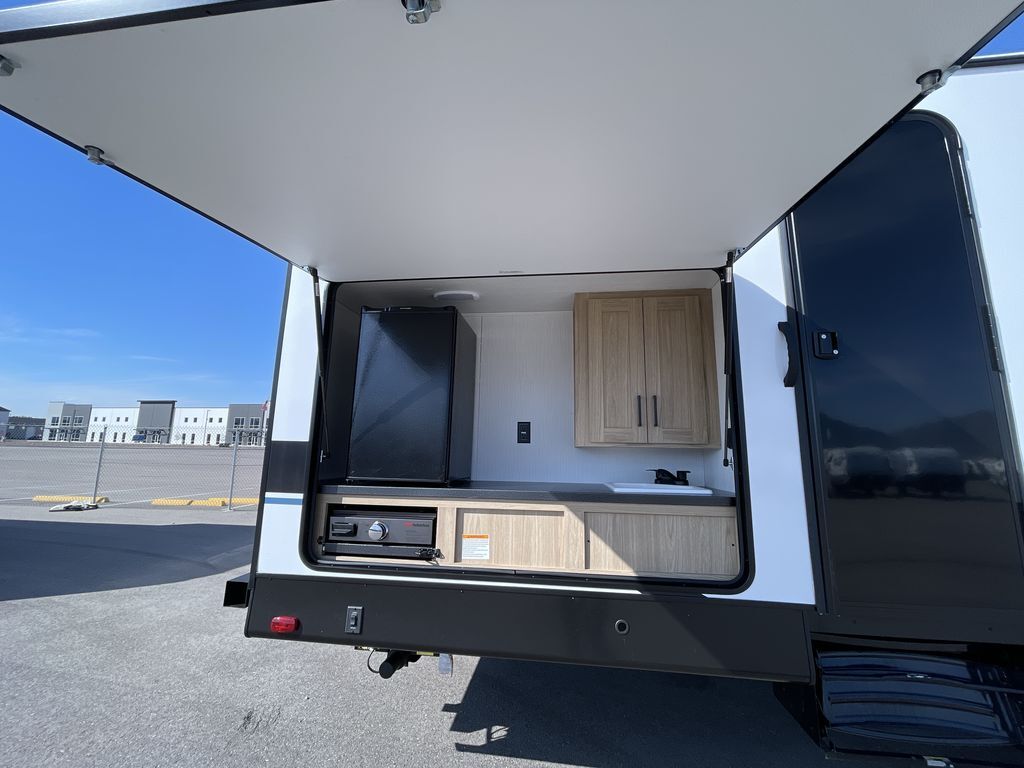 One look at this travel trailer and you'll be hooked! The front private bedroom with a queen bed provides a place for you to retreat to each night, and the full bath will let you freshen up in the morning. One of the dual entry doors is even found in the bath for added convenience! The little ones or your guests will have the bunkhouse to themselves with a total of four bunks and chairs below the flip-up bunk so they can relax. A full kitchen, complete with a three burner cooktop, microwave oven, and farmhouse sink will be perfect for meal times, or you can head outdoors to cook at the outdoor kitchen. In the evening, you can relax on the sofa or play a game at the booth dinette!