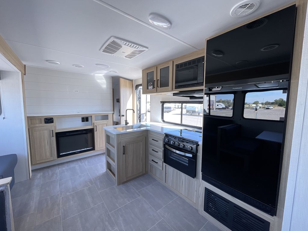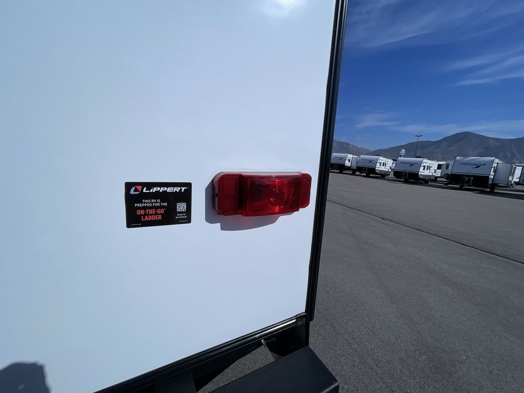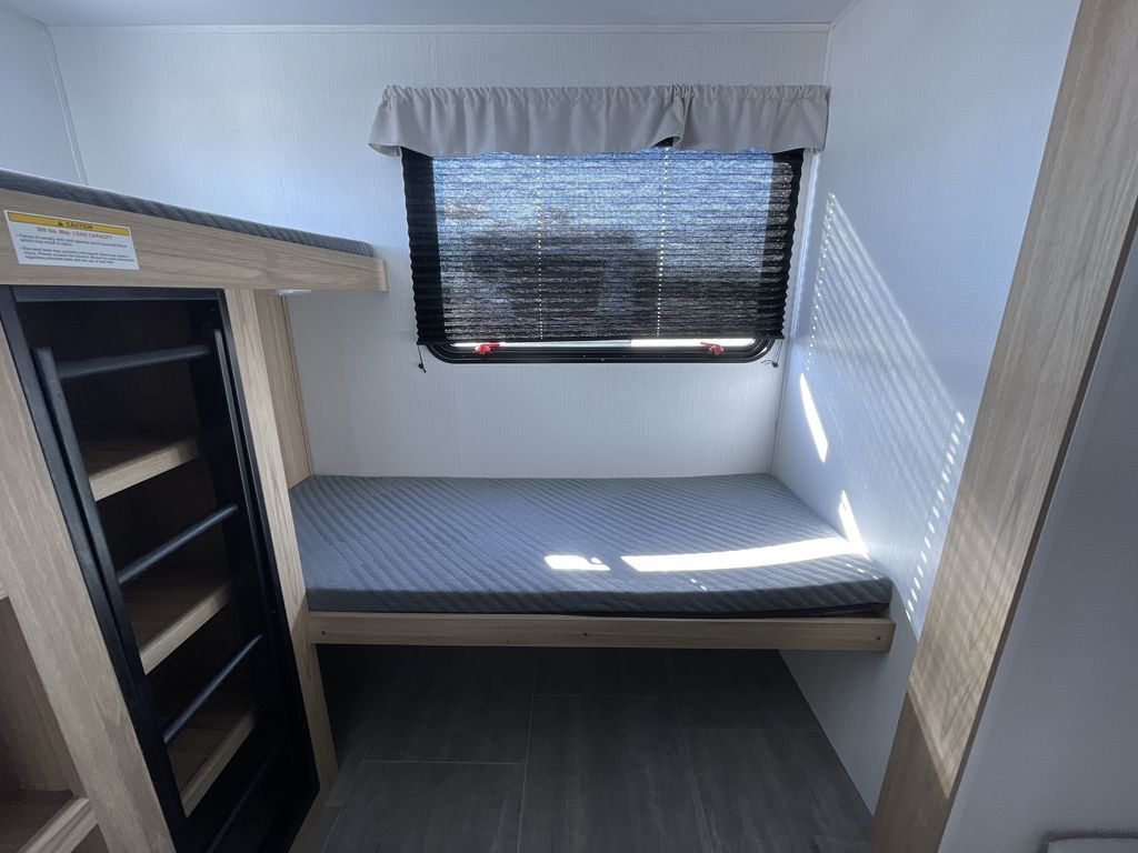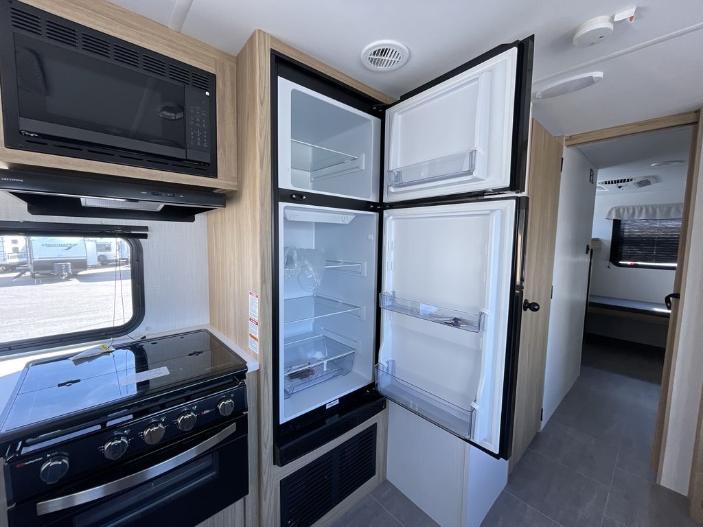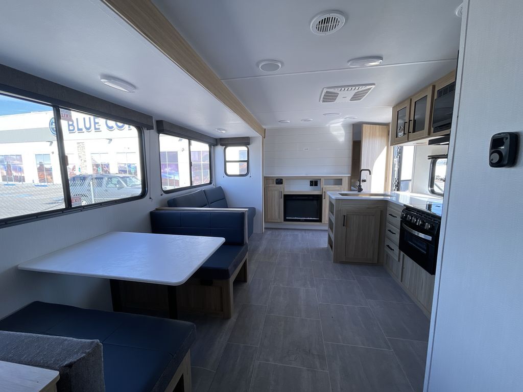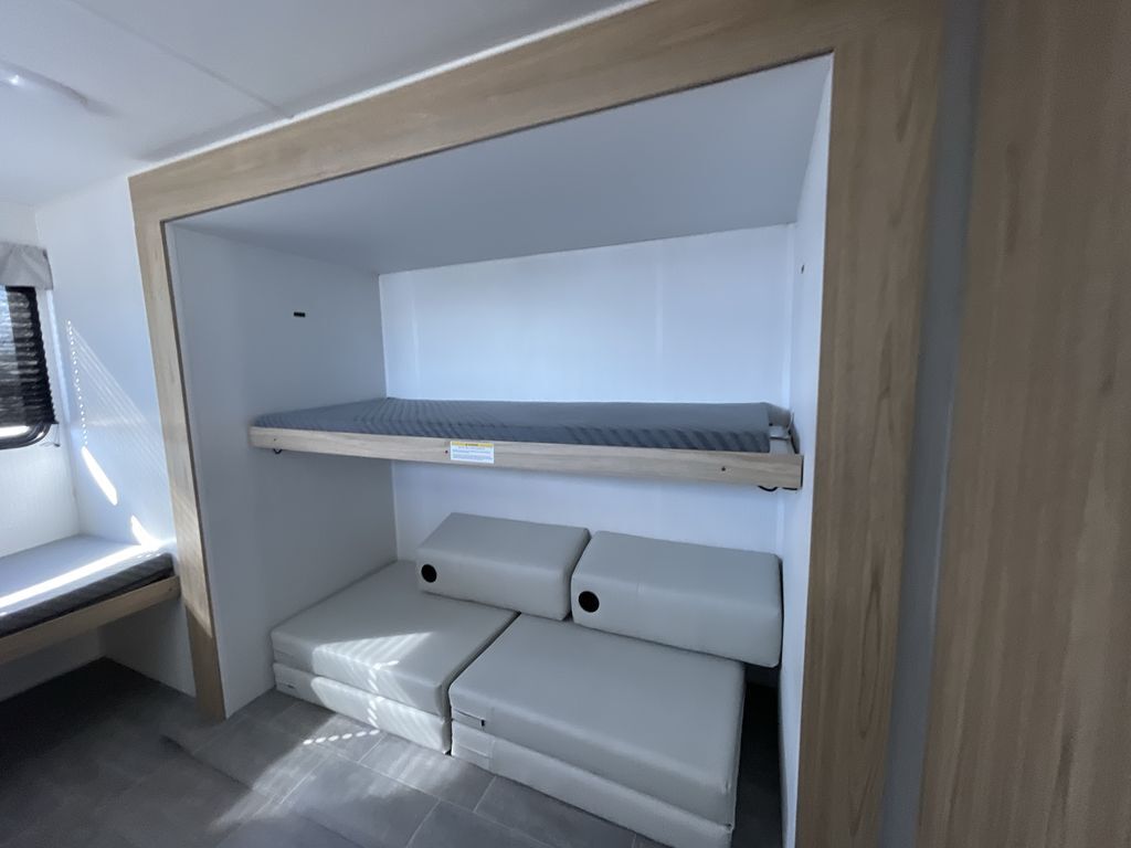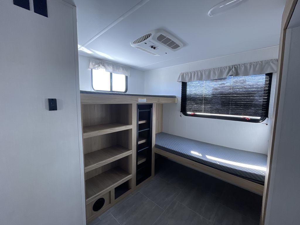 One look at this travel trailer and you'll be hooked! The front private bedroom with a queen bed provides a place for you to retreat to each night, and the full bath will let you freshen up in the morning. One of the dual entry doors is even found in the bath for added convenience! The little ones or your guests will have the bunkhouse to themselves with a total of four bunks and chairs below the flip-up bunk so they can relax. A full kitchen, complete with a three burner cooktop, microwave oven, and farmhouse sink will be perfect for meal times, or you can head outdoors to cook at the outdoor kitchen. In the evening, you can relax on the sofa or play a game at the booth dinette!