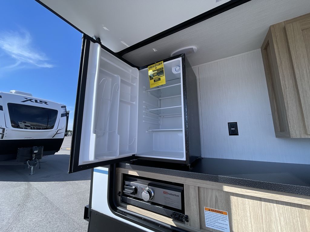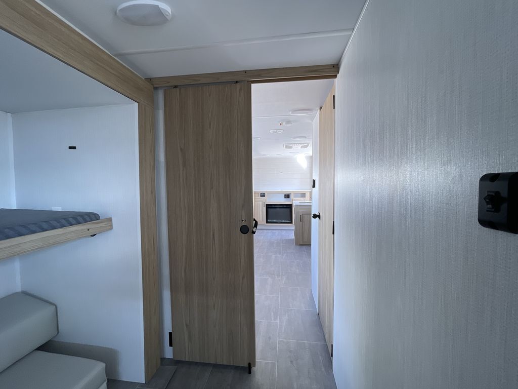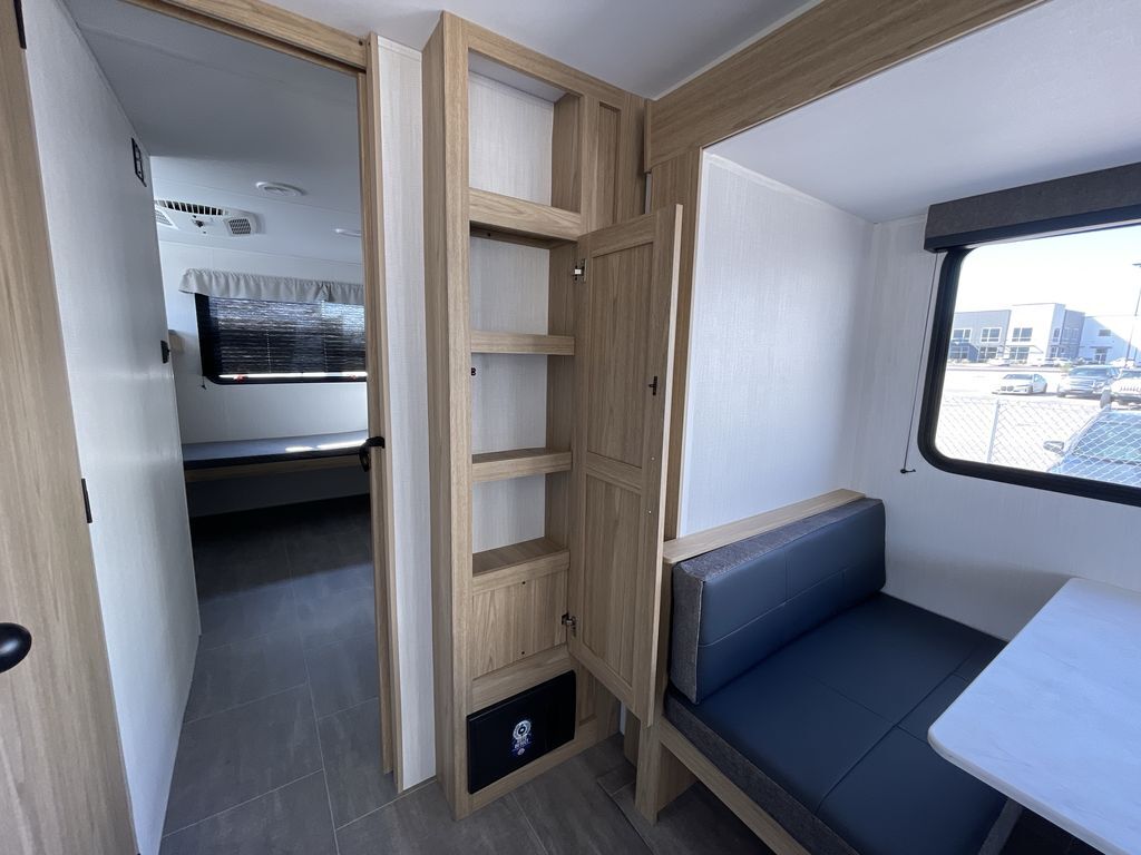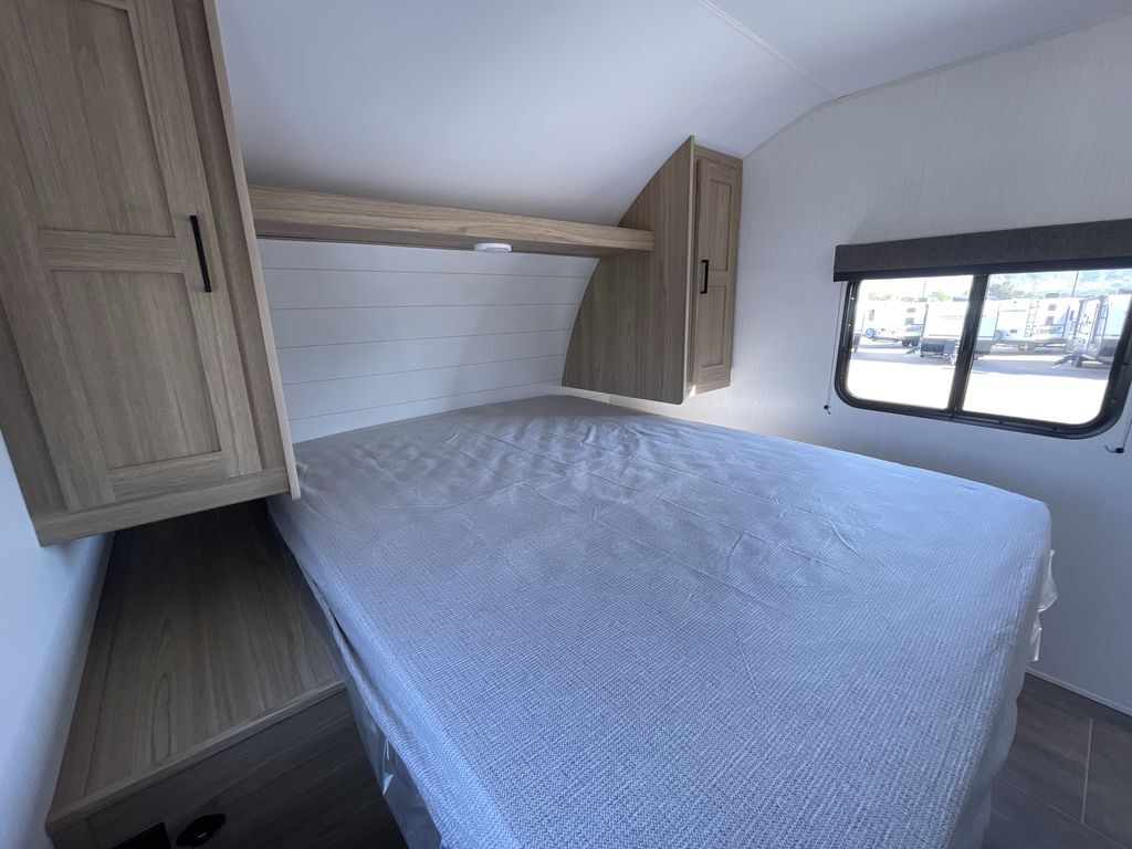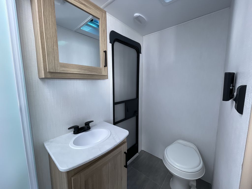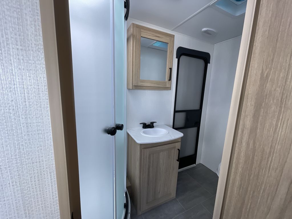 One look at this travel trailer and you'll be hooked! The front private bedroom with a queen bed provides a place for you to retreat to each night, and the full bath will let you freshen up in the morning. One of the dual entry doors is even found in the bath for added convenience! The little ones or your guests will have the bunkhouse to themselves with a total of four bunks and chairs below the flip-up bunk so they can relax. A full kitchen, complete with a three burner cooktop, microwave oven, and farmhouse sink will be perfect for meal times, or you can head outdoors to cook at the outdoor kitchen. In the evening, you can relax on the sofa or play a game at the booth dinette!