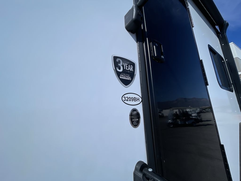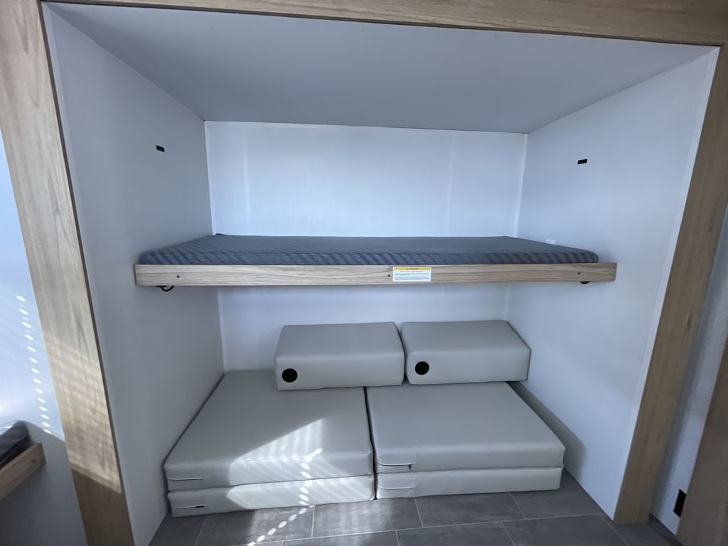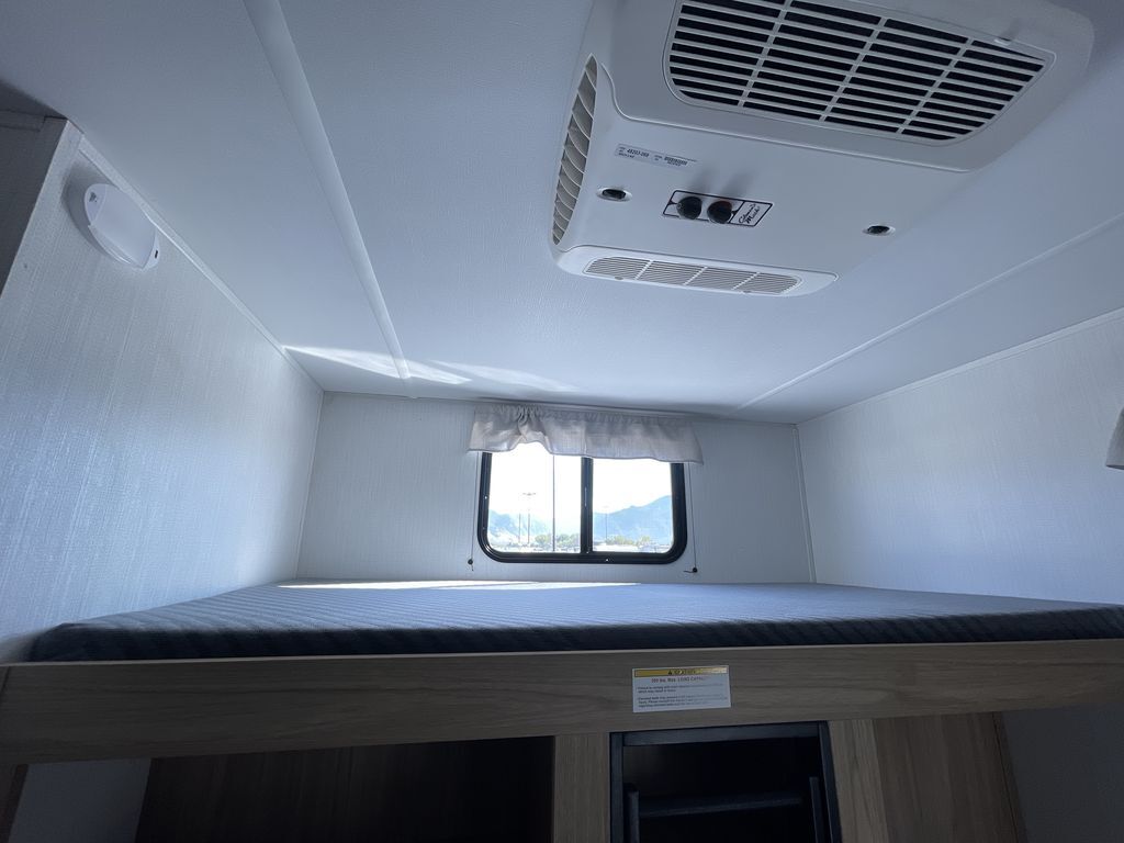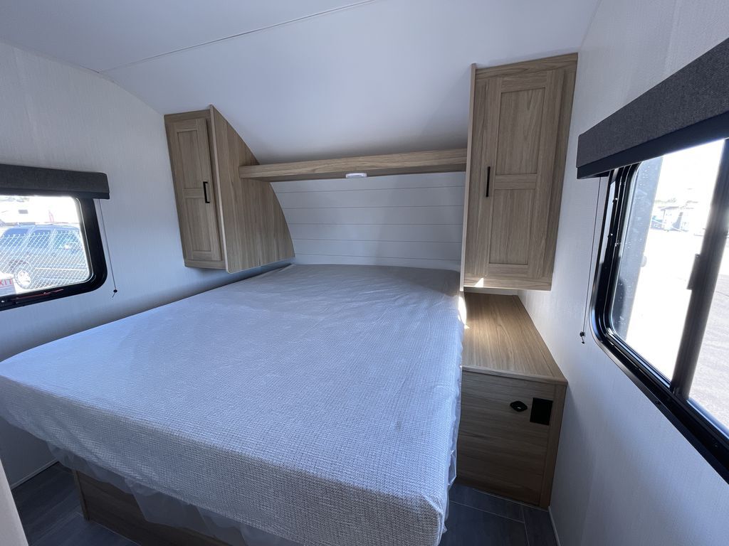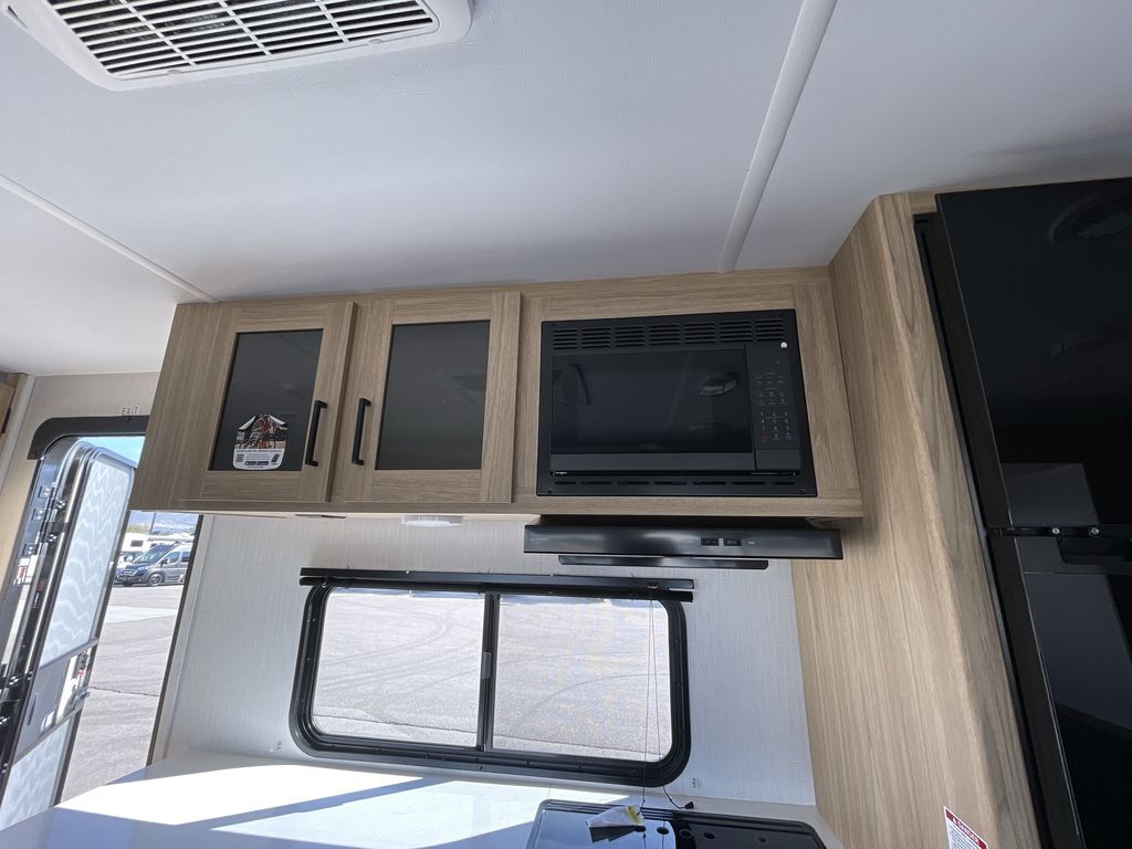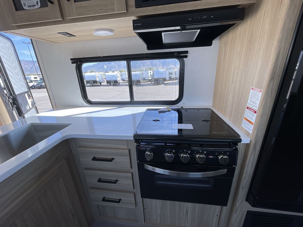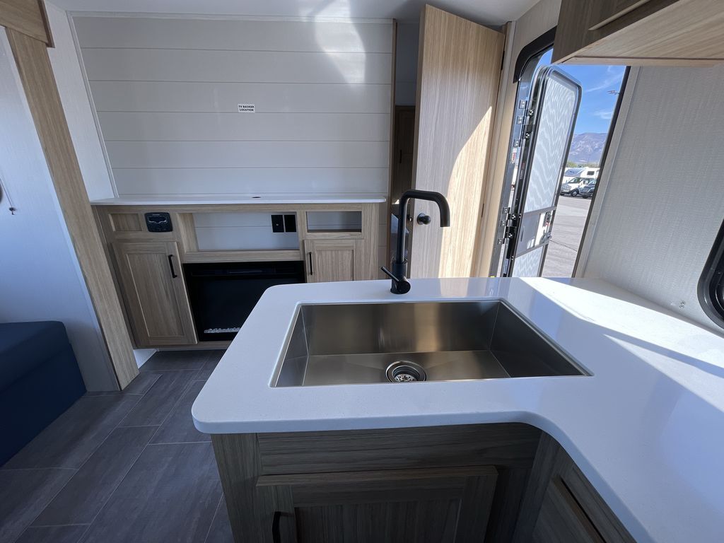 One look at this travel trailer and you'll be hooked! The front private bedroom with a queen bed provides a place for you to retreat to each night, and the full bath will let you freshen up in the morning. One of the dual entry doors is even found in the bath for added convenience! The little ones or your guests will have the bunkhouse to themselves with a total of four bunks and chairs below the flip-up bunk so they can relax. A full kitchen, complete with a three burner cooktop, microwave oven, and farmhouse sink will be perfect for meal times, or you can head outdoors to cook at the outdoor kitchen. In the evening, you can relax on the sofa or play a game at the booth dinette!