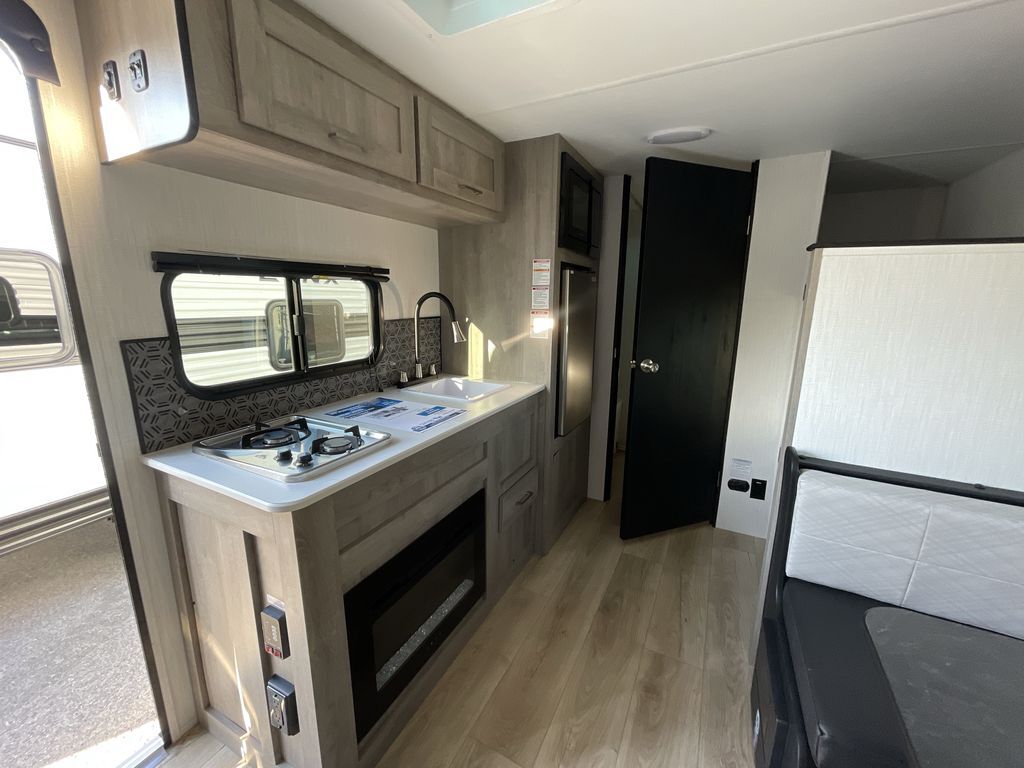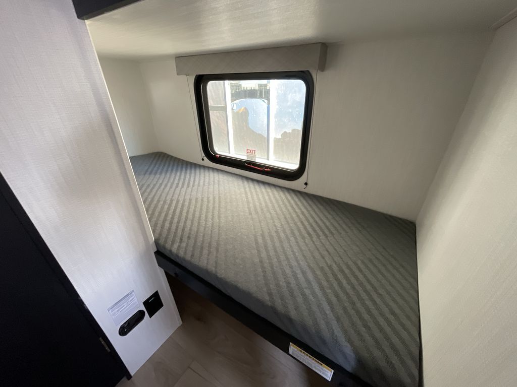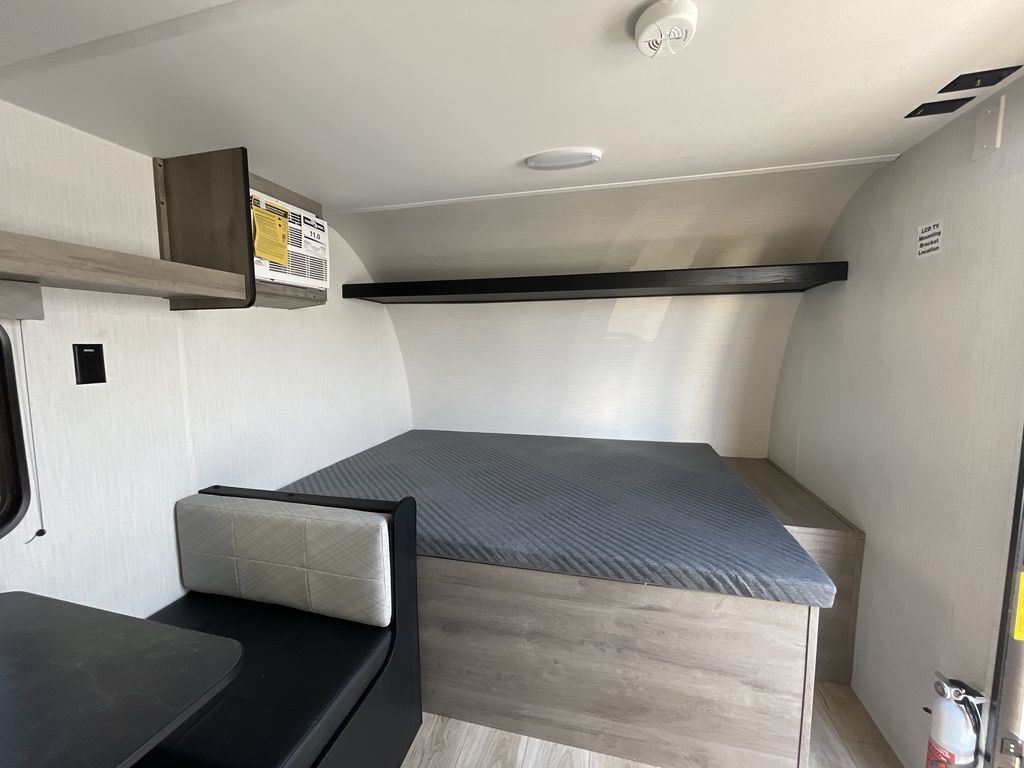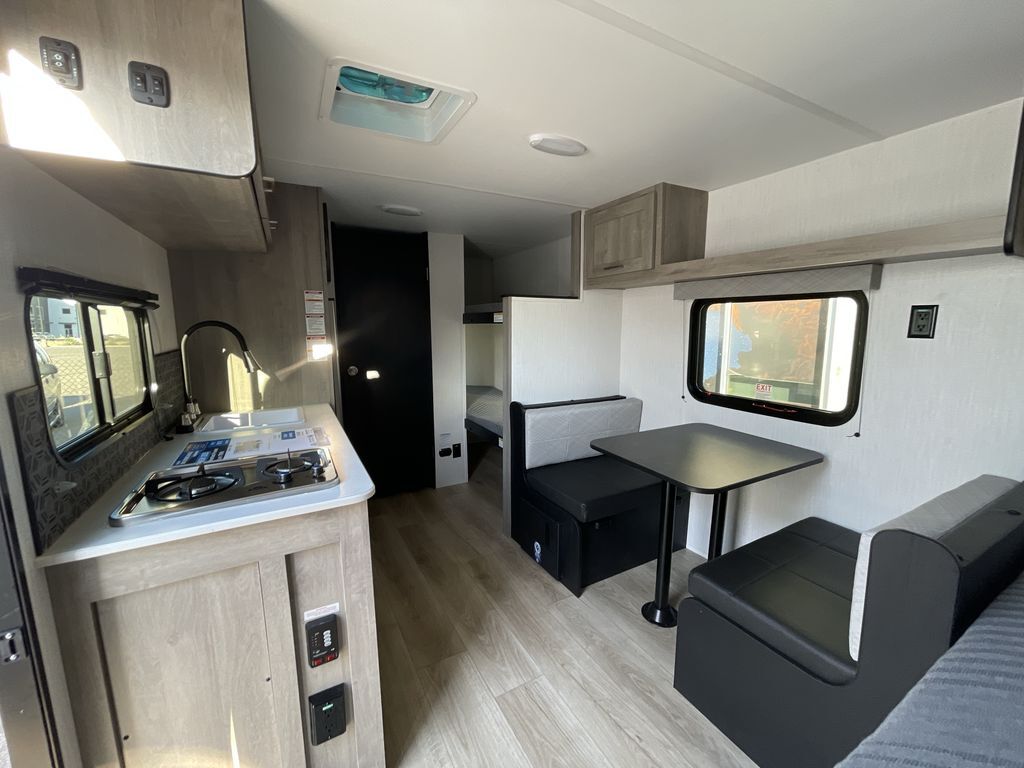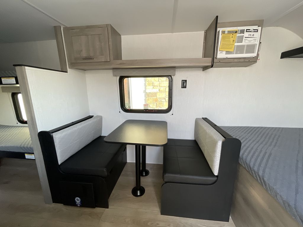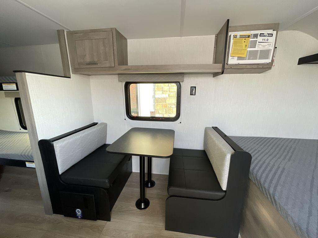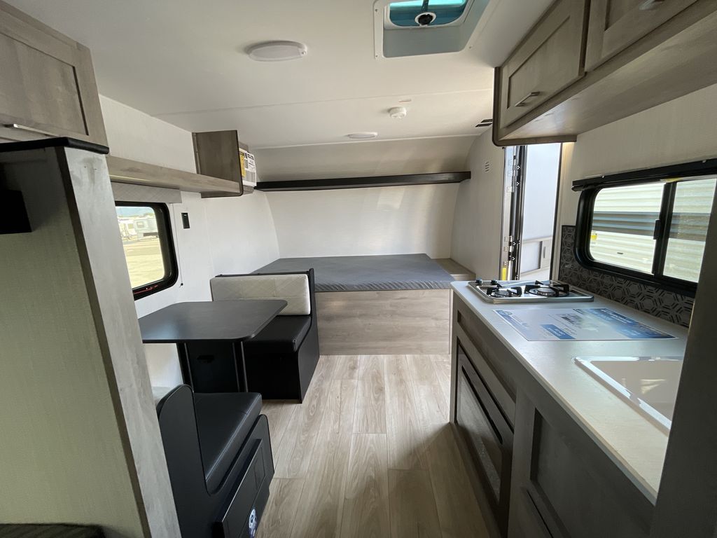 Lightweight towing and cozy camping is possible with this travel trailer! You will love having your own front queen bed to sleep on each night, and there are bunk beds in the rear corner for the little ones or your guests. A booth dinette provides a place to dine, play board games, and even sleep another guest if needed. The chef of your group can whip up meals on the two burner cooktop, and there is a 3.3 cu. ft. 12V residential refrigerator to keep food fresh. This model also includes a private bath with a shower and toilet so you don't have to use the camp's facilities at night!