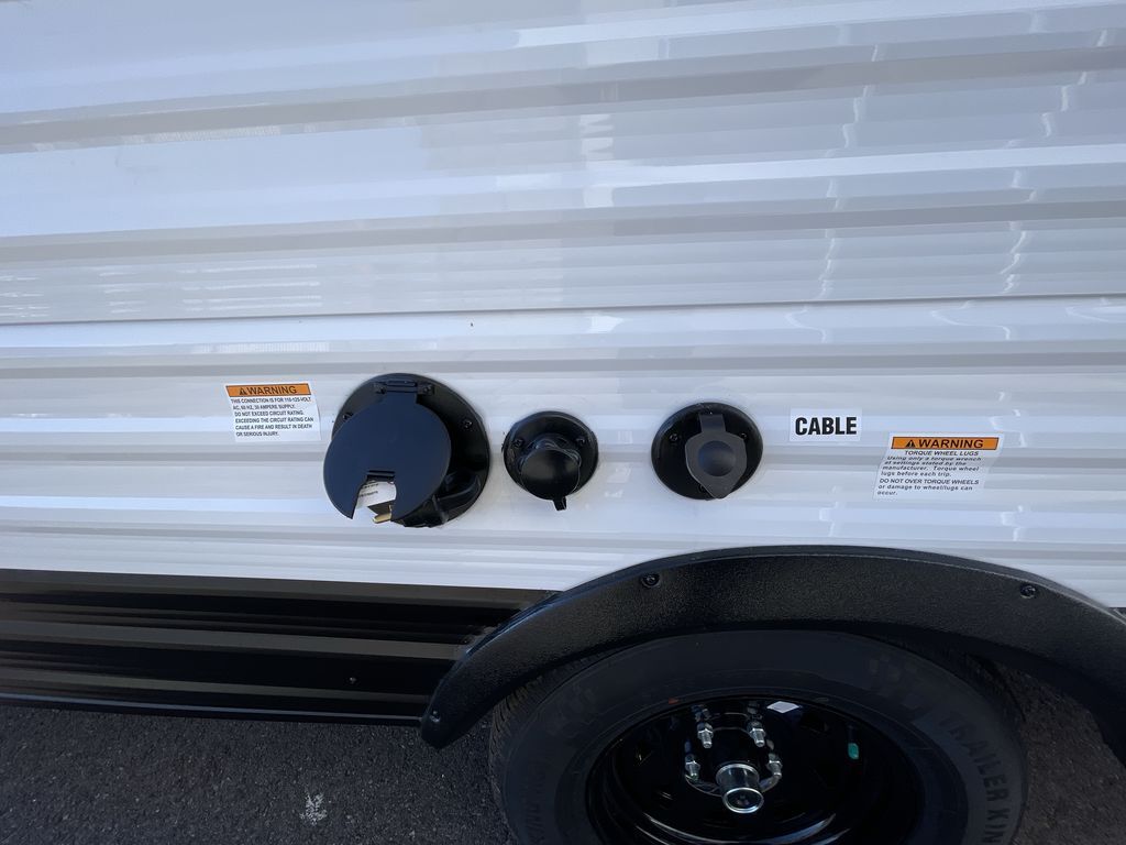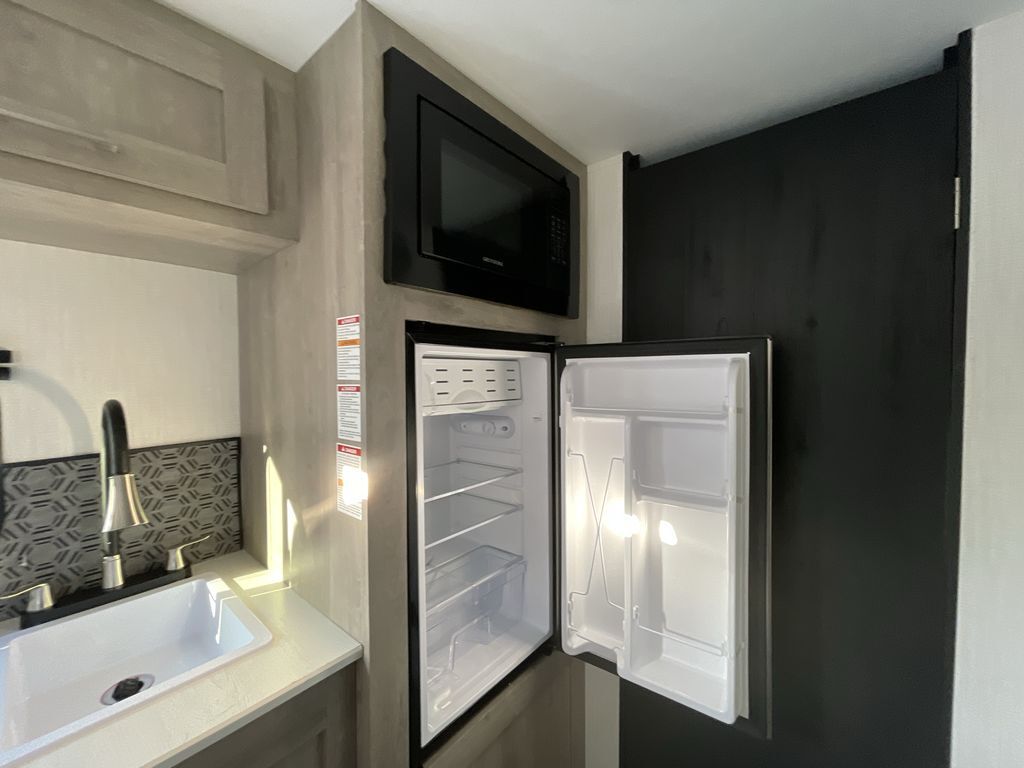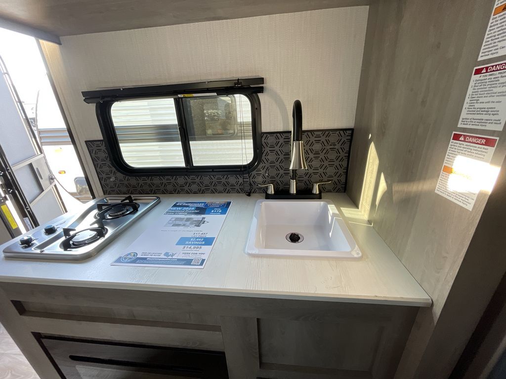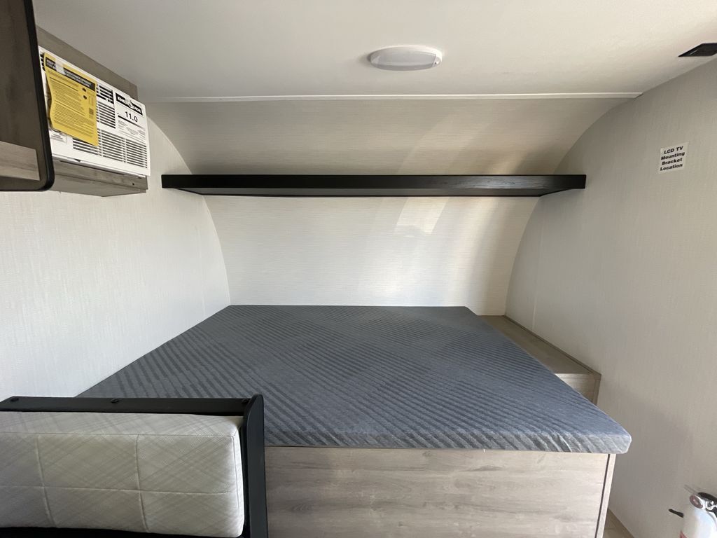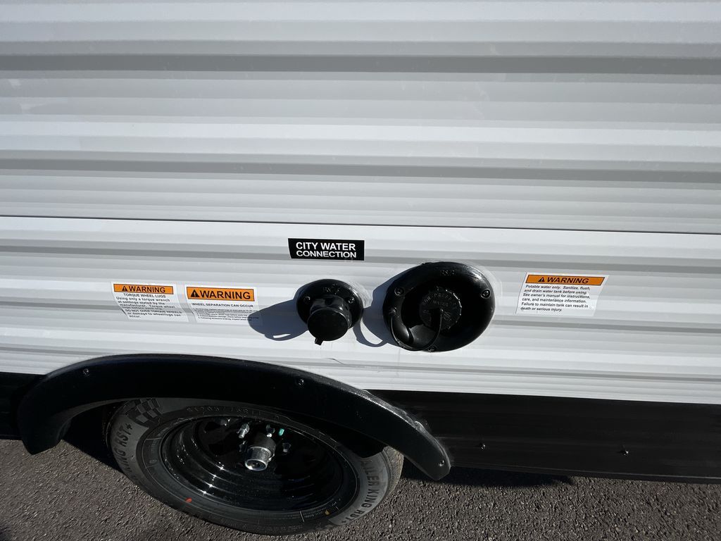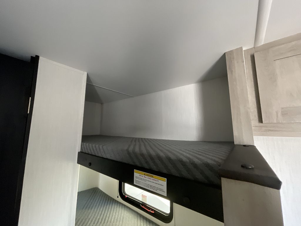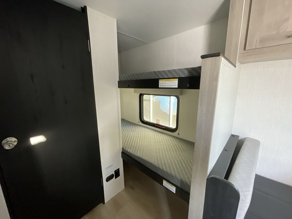 Lightweight towing and cozy camping is possible with this travel trailer! You will love having your own front queen bed to sleep on each night, and there are bunk beds in the rear corner for the little ones or your guests. A booth dinette provides a place to dine, play board games, and even sleep another guest if needed. The chef of your group can whip up meals on the two burner cooktop, and there is a 3.3 cu. ft. 12V residential refrigerator to keep food fresh. This model also includes a private bath with a shower and toilet so you don't have to use the camp's facilities at night!