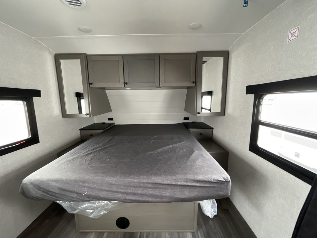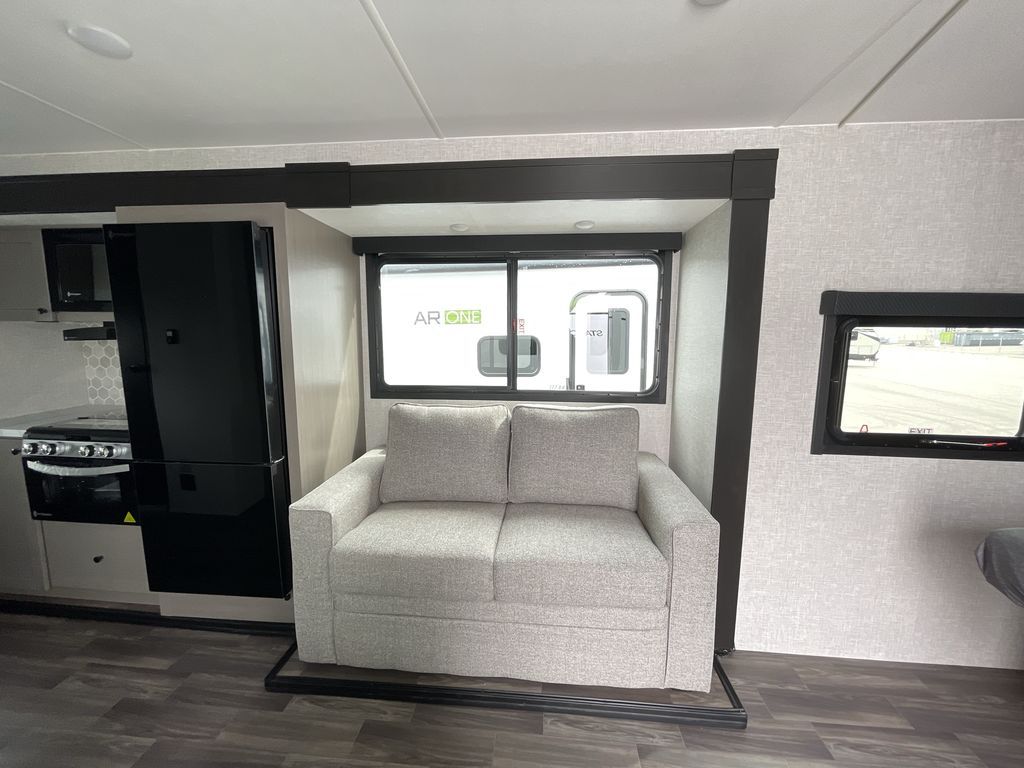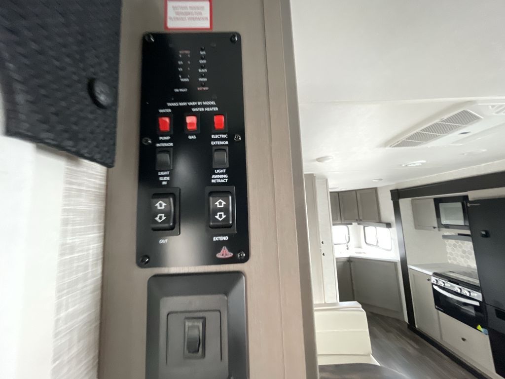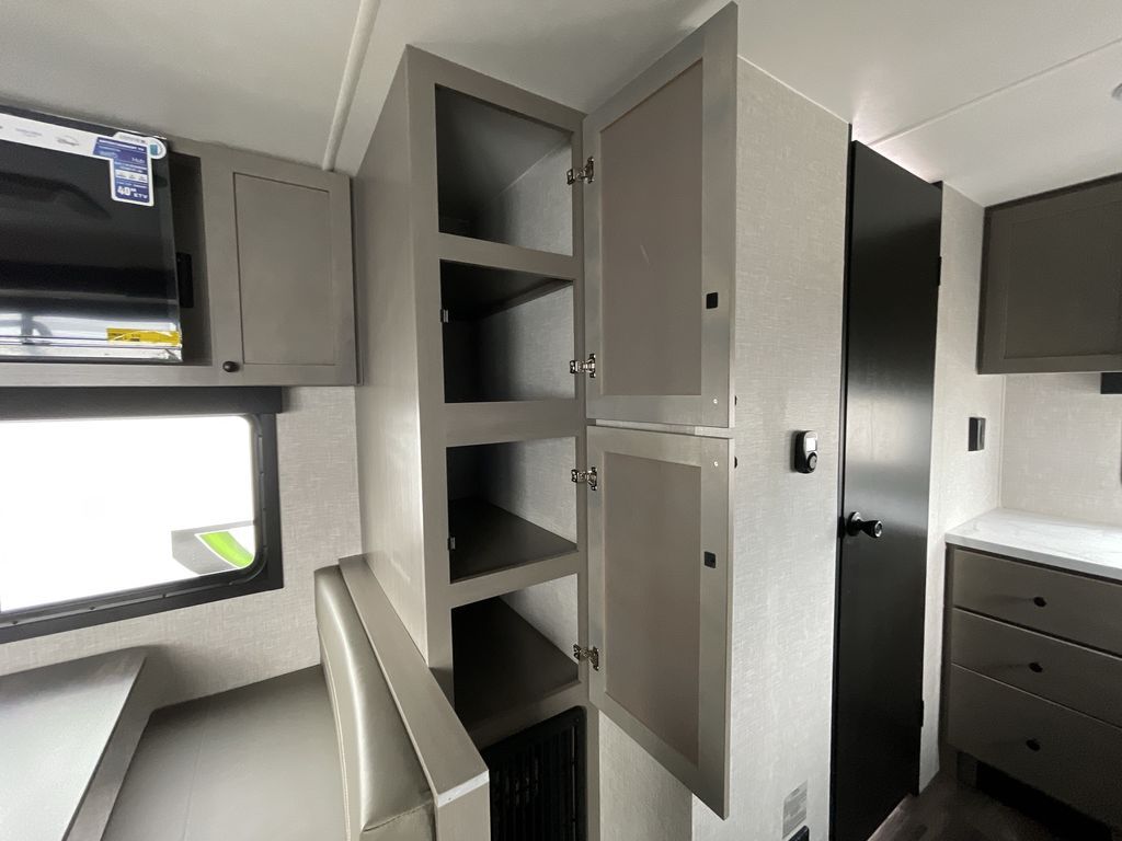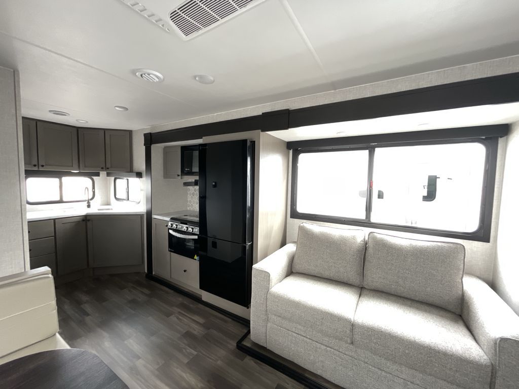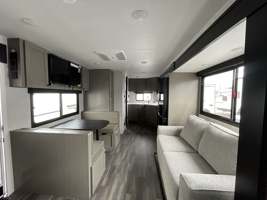 Time spent in this travel trailer will be time well spent! The large slide out provides more space to stretch out and relax, and you'll find seating space on the tri-fold sofa and booth dinette. These areas will also double as sleeping space for guests while you take the queen bed in the front bedroom. This model includes a rear corner kitchen with plenty of counter space, a 10 cu. ft. 12V refrigerator, plus a three burner range with a 17" oven. You will find a grill hookup LP quick connect outdoors plus an exterior docking station and a sprayer hose, and a pass-through storage for hiking and fishing gear!