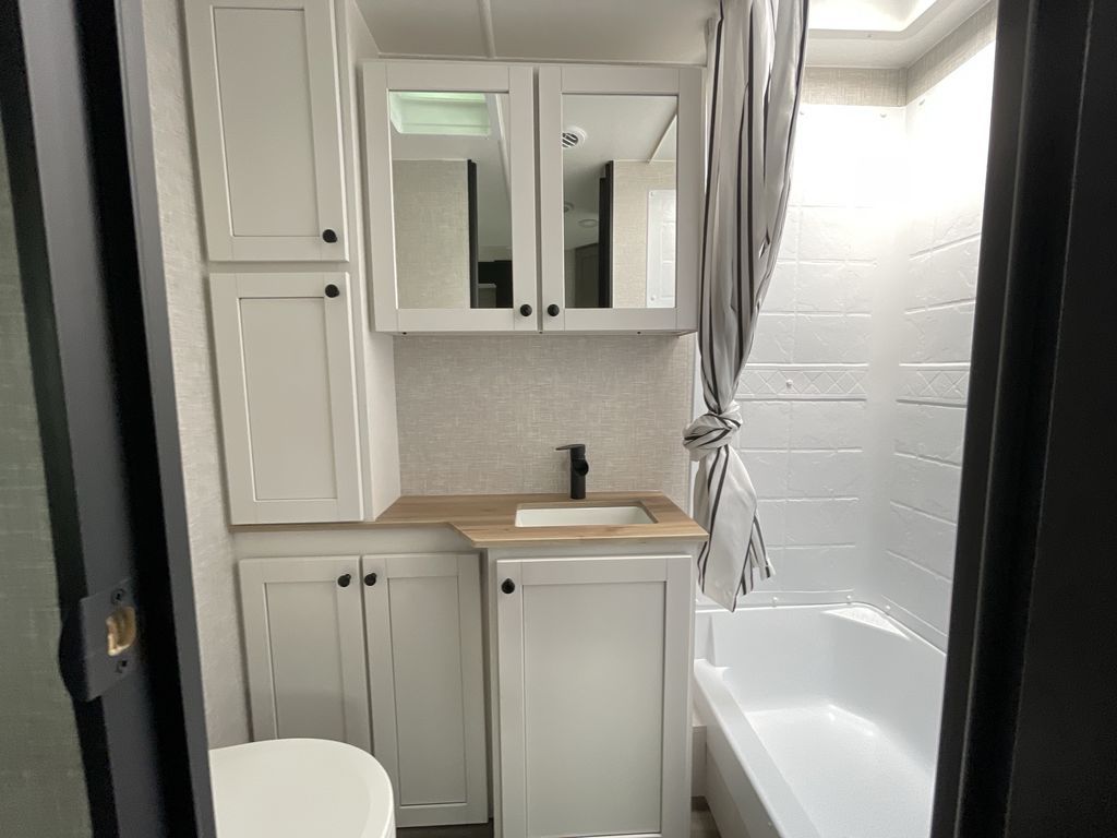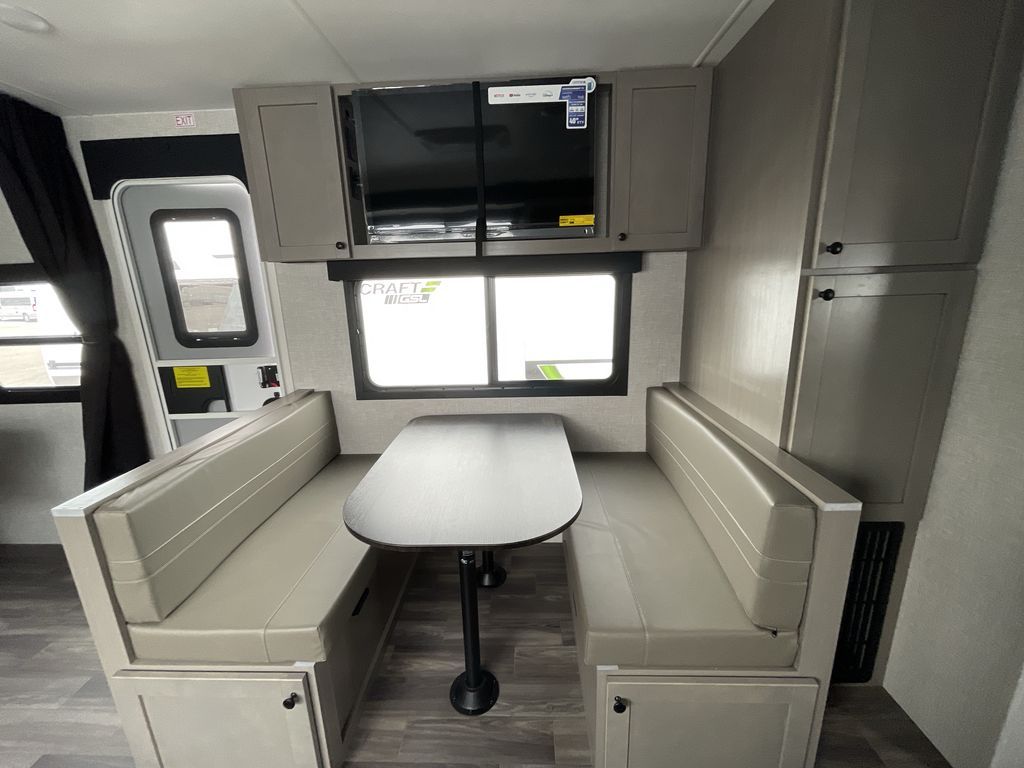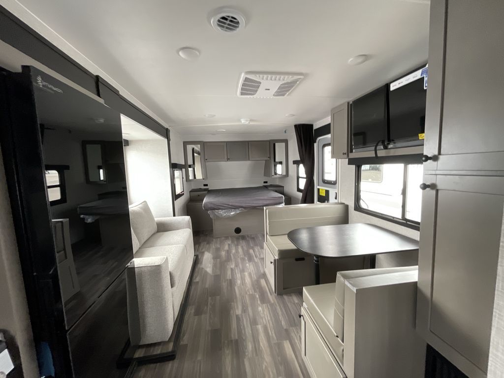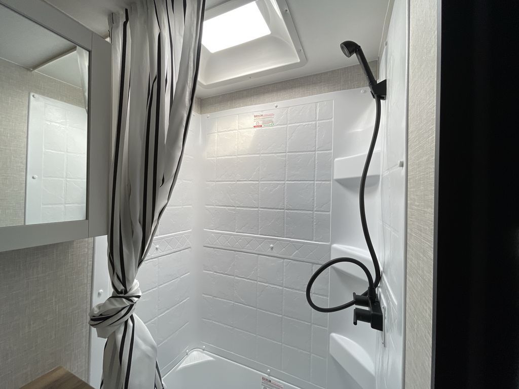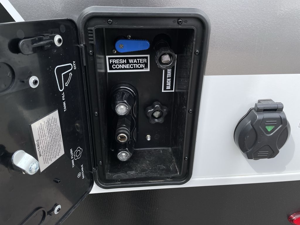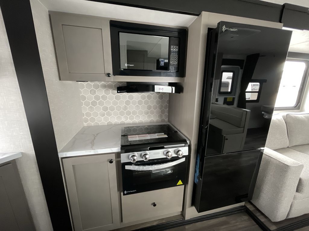 Time spent in this travel trailer will be time well spent! The large slide out provides more space to stretch out and relax, and you'll find seating space on the tri-fold sofa and booth dinette. These areas will also double as sleeping space for guests while you take the queen bed in the front bedroom. This model includes a rear corner kitchen with plenty of counter space, a 10 cu. ft. 12V refrigerator, plus a three burner range with a 17" oven. You will find a grill hookup LP quick connect outdoors plus an exterior docking station and a sprayer hose, and a pass-through storage for hiking and fishing gear!