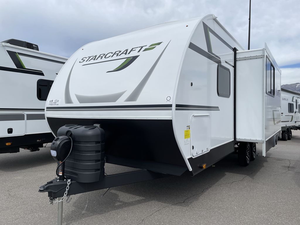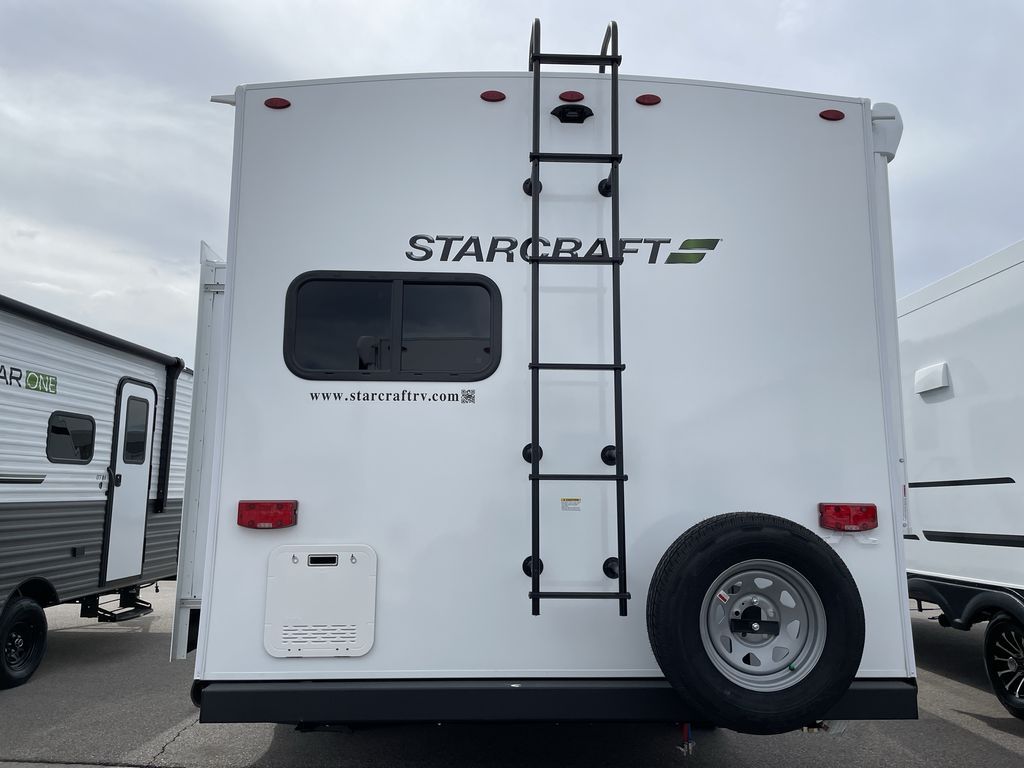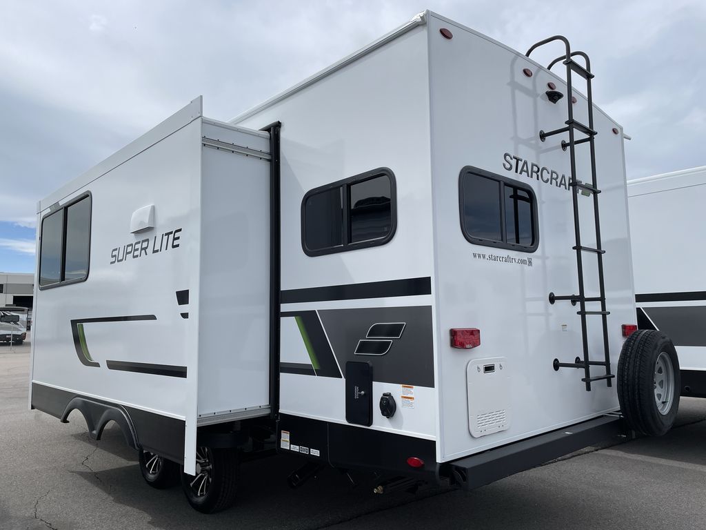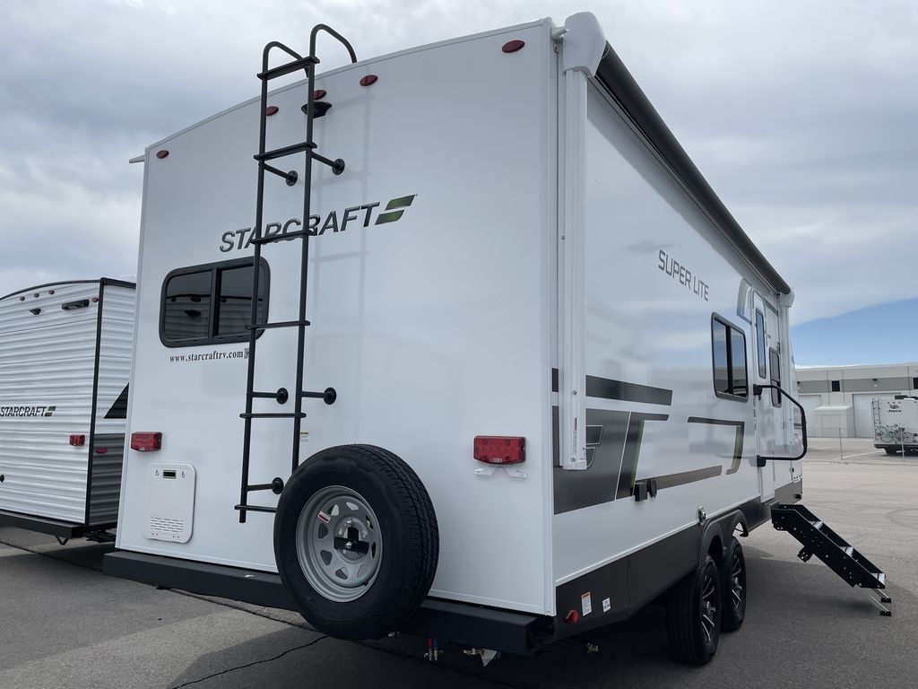 With any Starcraft Super Lite travel trailer, the solid and lightweight construction includes a fully walkable roof with a PVC roofing membrane that easily reflects solar heat and UV rays and TuffShell vacuum bonded laminated construction, reinforced with heavy-duty fiberglass and welded aluminum frames. There is also a molded front cap with LED lighting to protect against elements, a power tongue jack for easy towing, plus a power awning with LED lighting. The interior is spacious with an 81" living room ceiling height, hardwood cabinet doors, and flush floor slides with residential vinyl flooring and pressed membrane countertops for easy cleanup. Don't wait for your next adventure, take a Super Lite with you today!