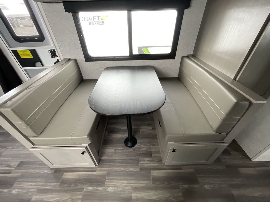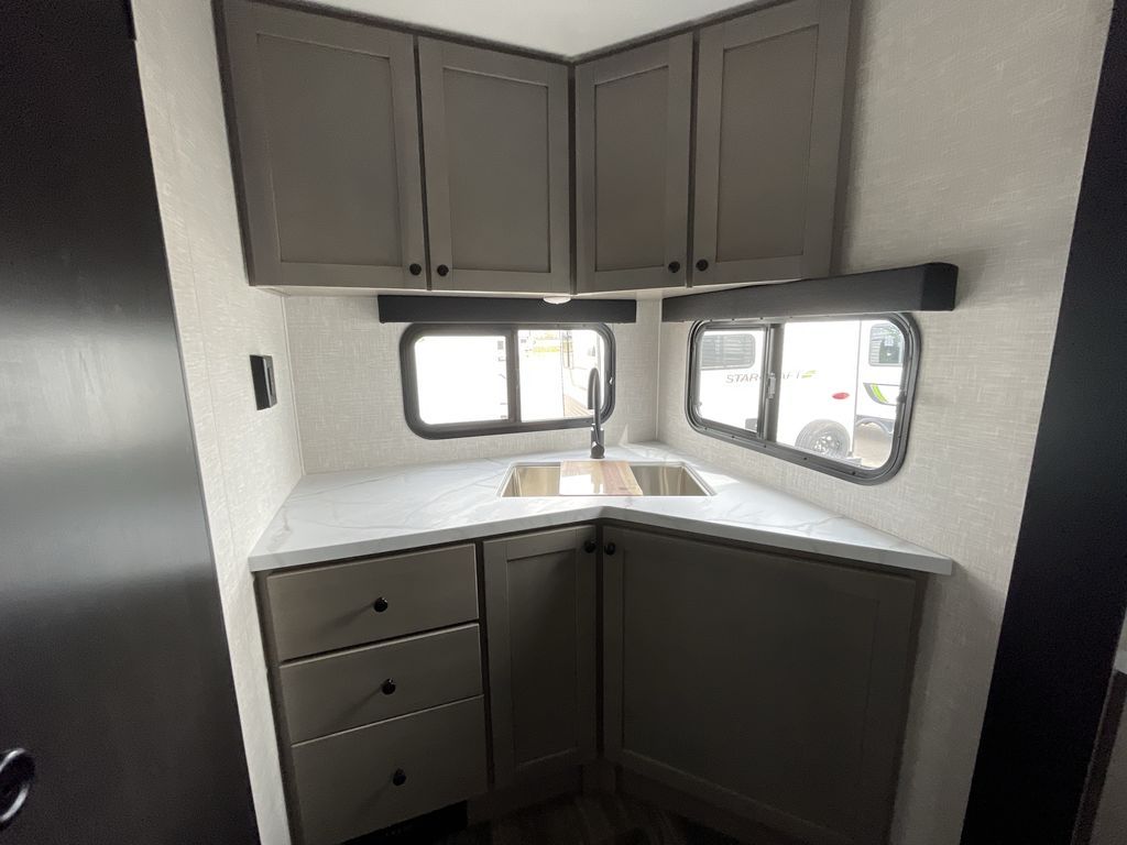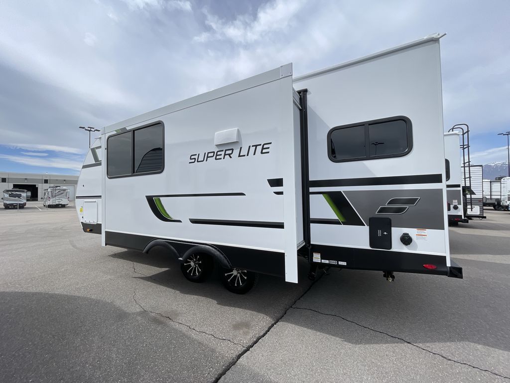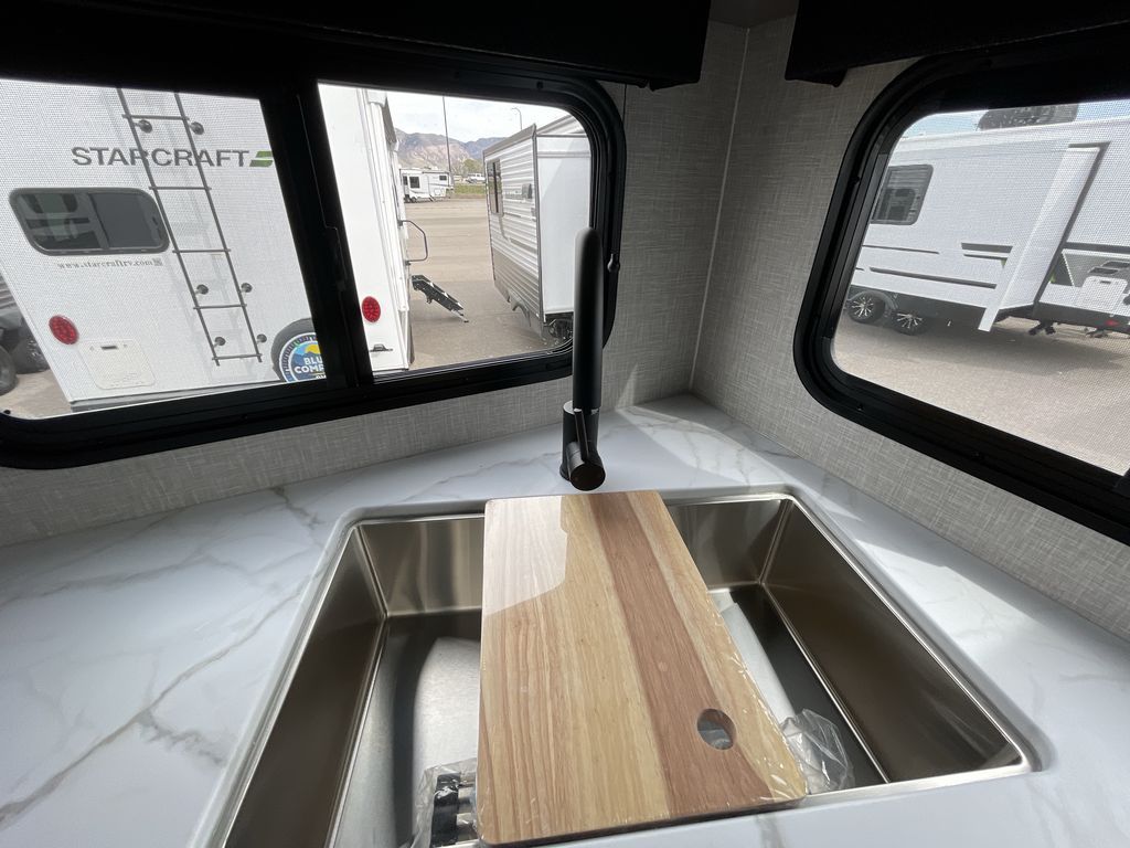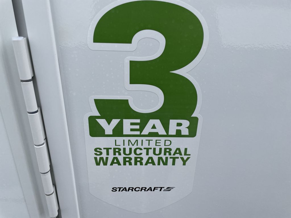 With any Starcraft Super Lite travel trailer, the solid and lightweight construction includes a fully walkable roof with a PVC roofing membrane that easily reflects solar heat and UV rays and TuffShell vacuum bonded laminated construction, reinforced with heavy-duty fiberglass and welded aluminum frames. There is also a molded front cap with LED lighting to protect against elements, a power tongue jack for easy towing, plus a power awning with LED lighting. The interior is spacious with an 81" living room ceiling height, hardwood cabinet doors, and flush floor slides with residential vinyl flooring and pressed membrane countertops for easy cleanup. Don't wait for your next adventure, take a Super Lite with you today!