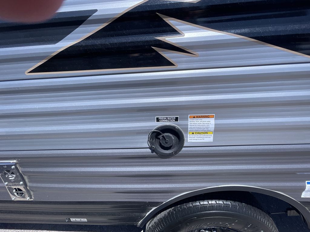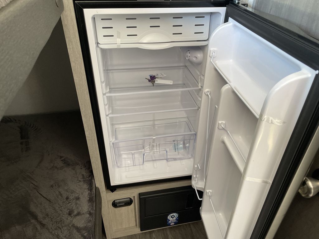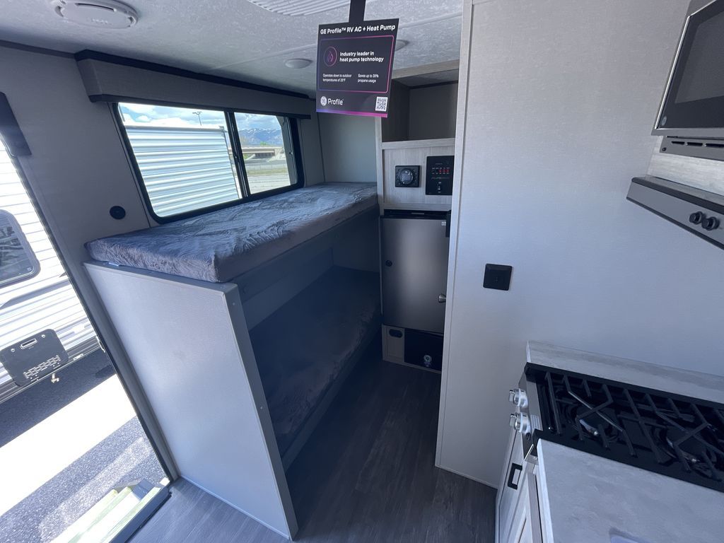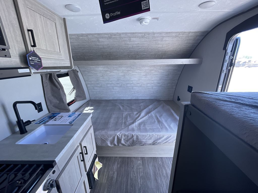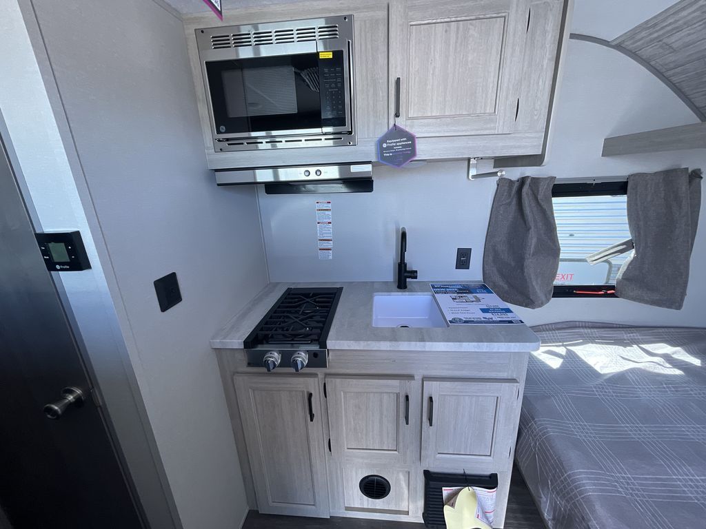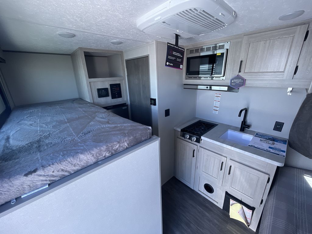 This lightweight travel trailer includes everything you need for comfortable camping trips at the lake. You can make your meals on the two burner cooktop or in the stainless steel microwave, and a 3.3 cu. ft. 12V refrigerator will keep leftovers fresh. A front queen bed provides a great night's rest, and there are 29" x 70" bunk beds for your guests or little ones. And a private bath with a 24" x 32" shower and toilet will let you easily freshen up without having to use the camp's facilities!