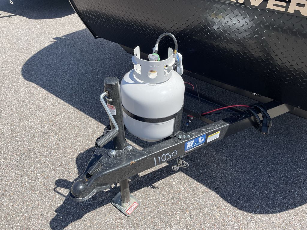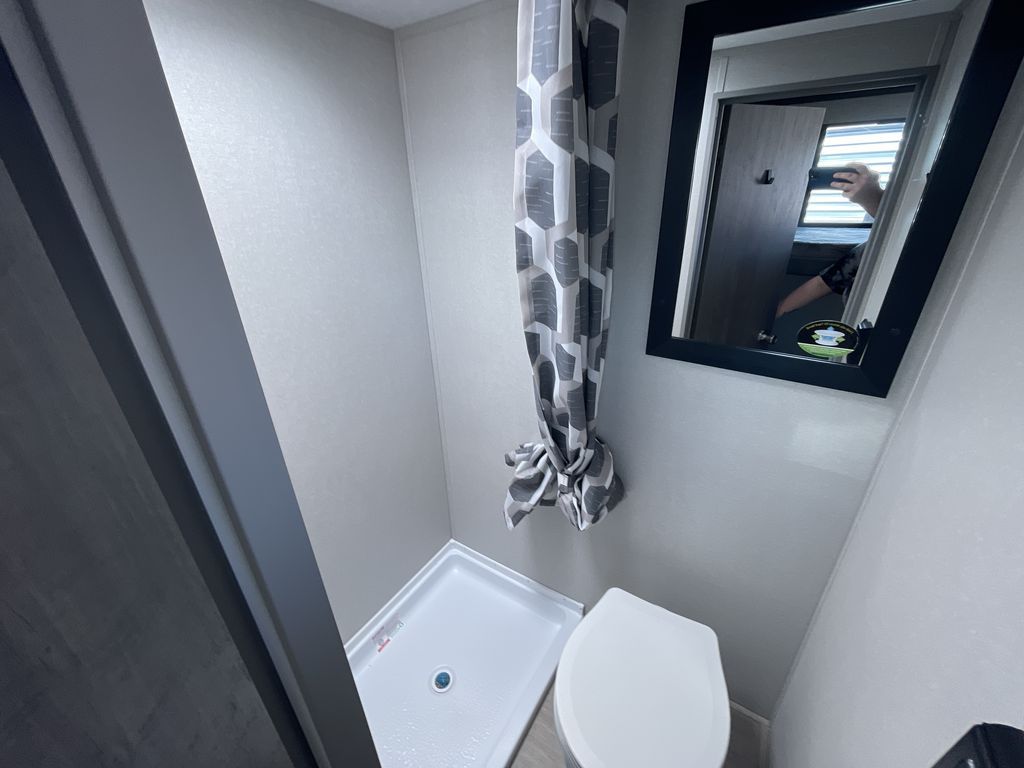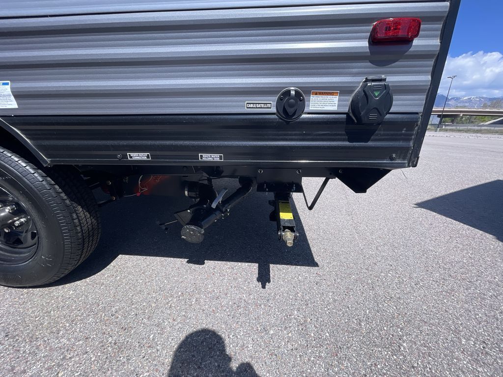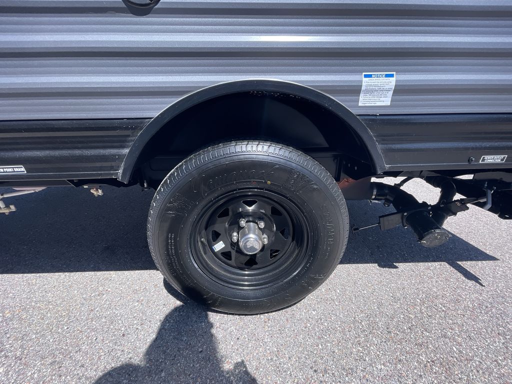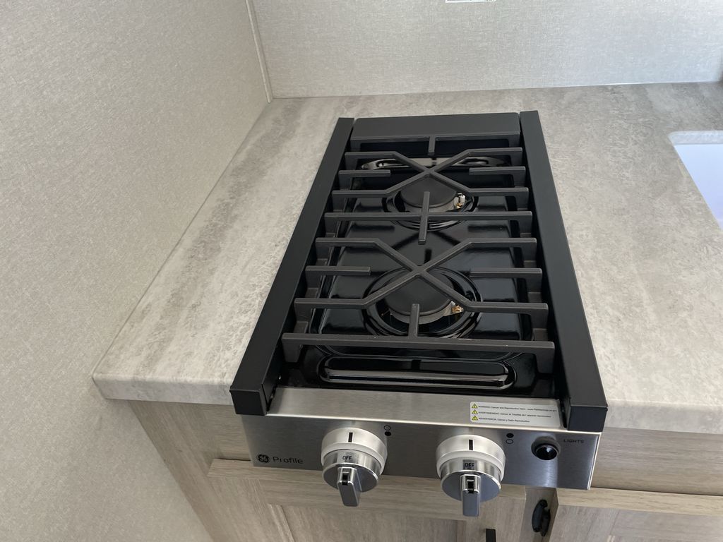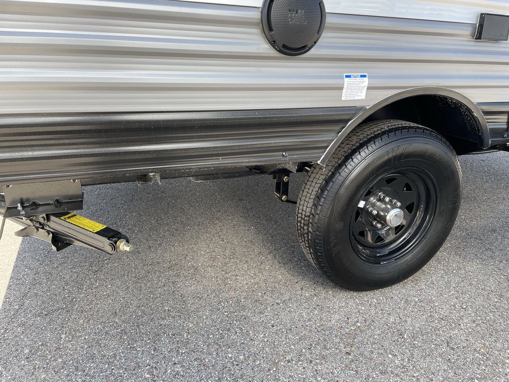 This lightweight travel trailer includes everything you need for comfortable camping trips at the lake. You can make your meals on the two burner cooktop or in the stainless steel microwave, and a 3.3 cu. ft. 12V refrigerator will keep leftovers fresh. A front queen bed provides a great night's rest, and there are 29" x 70" bunk beds for your guests or little ones. And a private bath with a 24" x 32" shower and toilet will let you easily freshen up without having to use the camp's facilities!