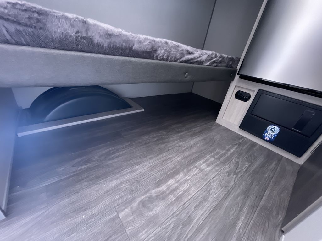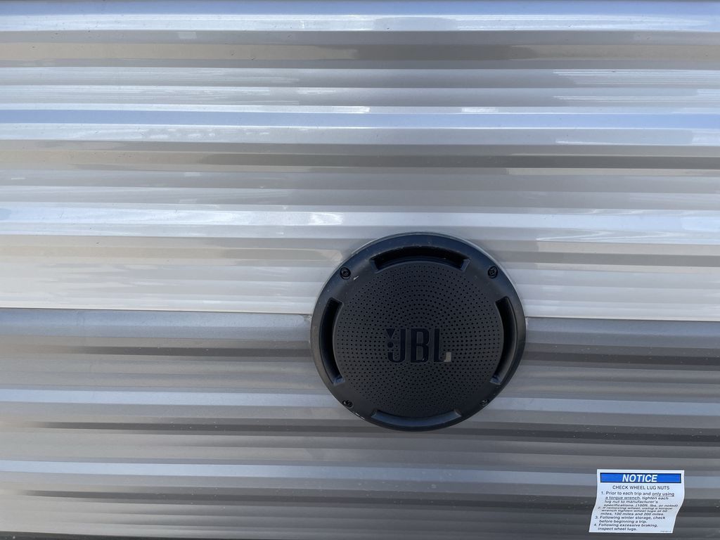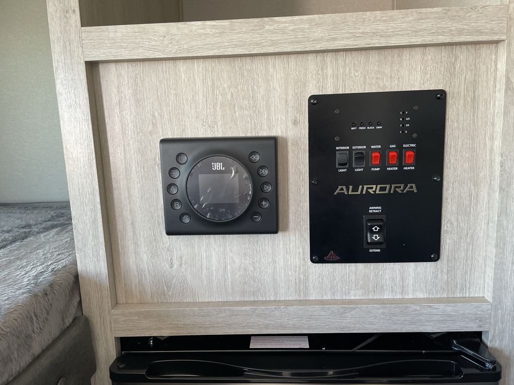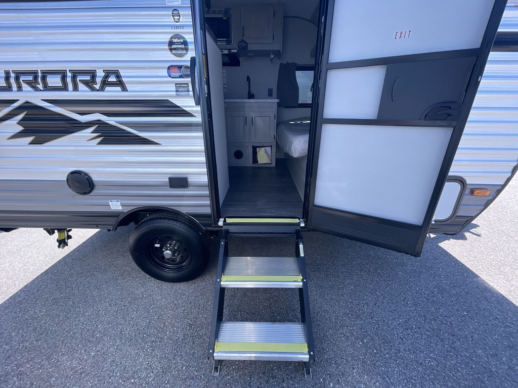 Comfortability, usability, and quality is what you will find in each one of these Forest River Aurora Light travel trailers! They are designed with a superior build and packed full with industry leading, functional, and distinctive standard features. SolidStep entrance steps and a Safe-T rail door assist on main entry door to help you safely enter and exit the unit. The diamond plate rock guard will protect your unit from road debris and the nitrogen filled radial tires, which keep their pressure longer, offer better fuel economy. You will also find upgraded JBL Elite exterior speaker outside, an electric awning with multicolor lights and remote, plus flush mount baggage doors for easy packing. The interiors are beautifully designed with matte black kitchen and bath faucets, black nightshades in the living room, and GE kitchen appliances!