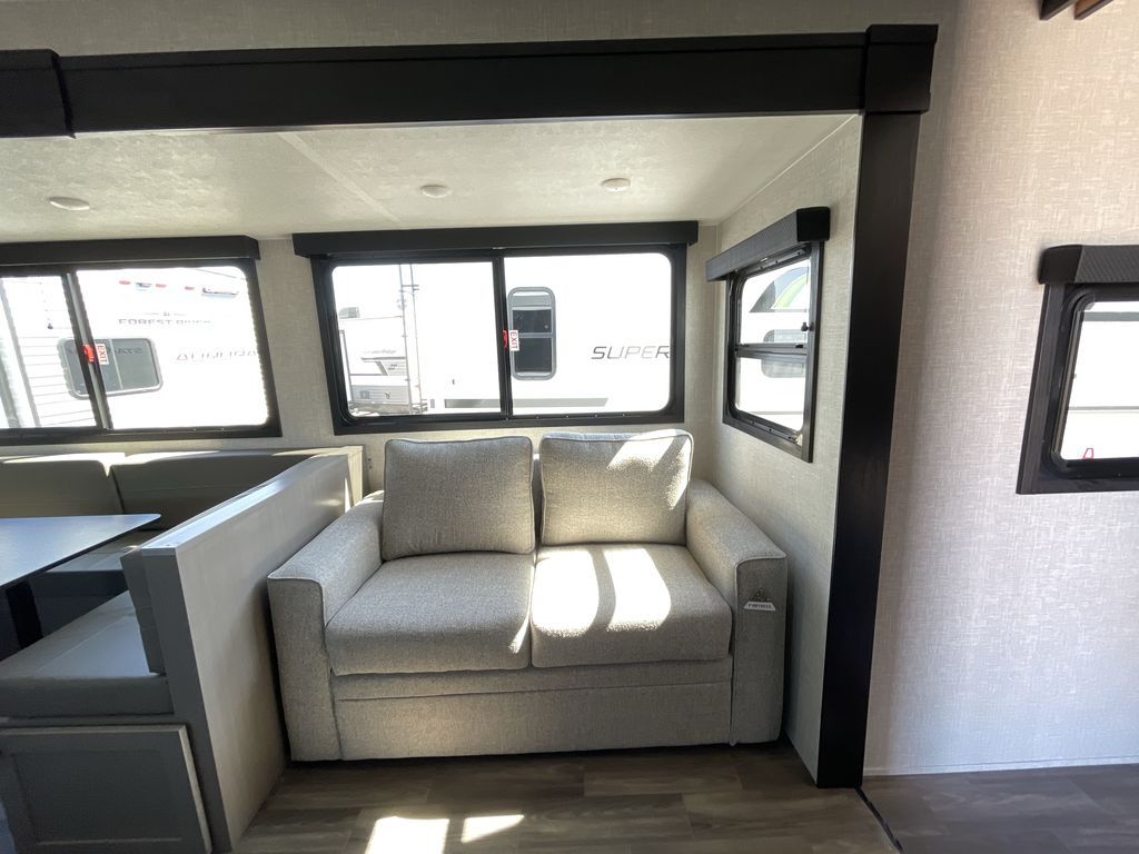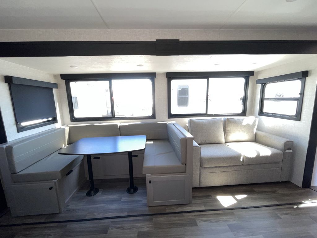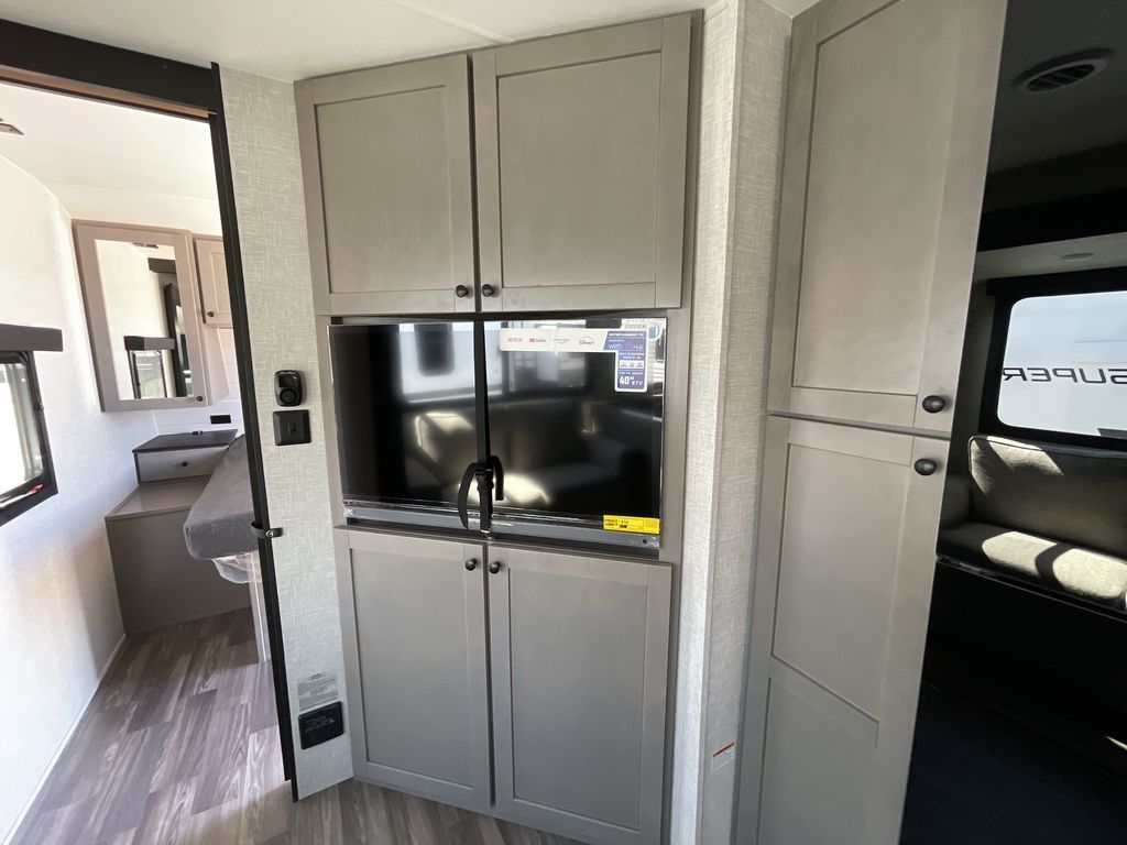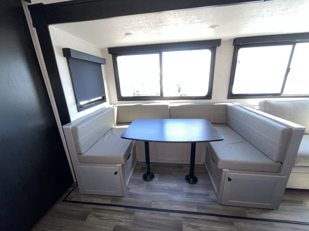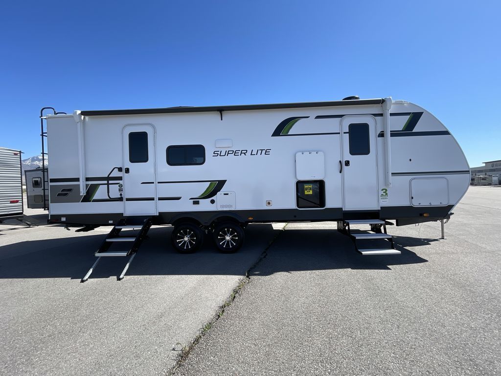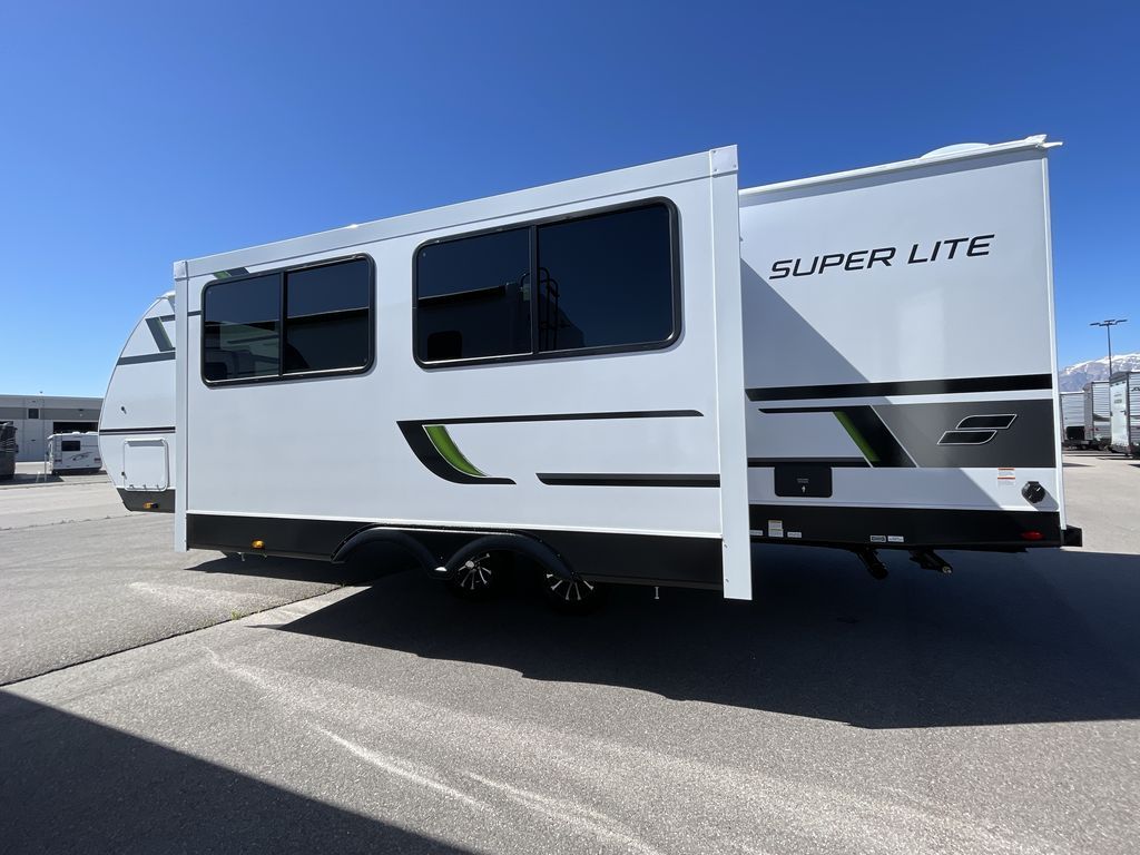 Convenience, space, and lots of camping amenities are wrapped up in this Super Lite so you can enjoy outdoor activities and inside comfort each day you are camping! There is a spacious rear bathroom that includes a walk-in closet, dual entry doors for a smooth flow of traffic in and out especially when your friends joined you, and a large slide with furniture giving you more interior floor space. The cook will have full amenities to feed everyone including a 10 cu. ft. 12V refrigerator to store the cold items, a single basin stainless steel under-mount kitchen sink, and everyone can play games at the U-shaped dinette or outside under the 20' power awning. And at night, you will have a queen bed with storage under the bed as well as beside wardrobes, USB ports and electrical outlets to keep everything charged, and a second entry into the trailer.