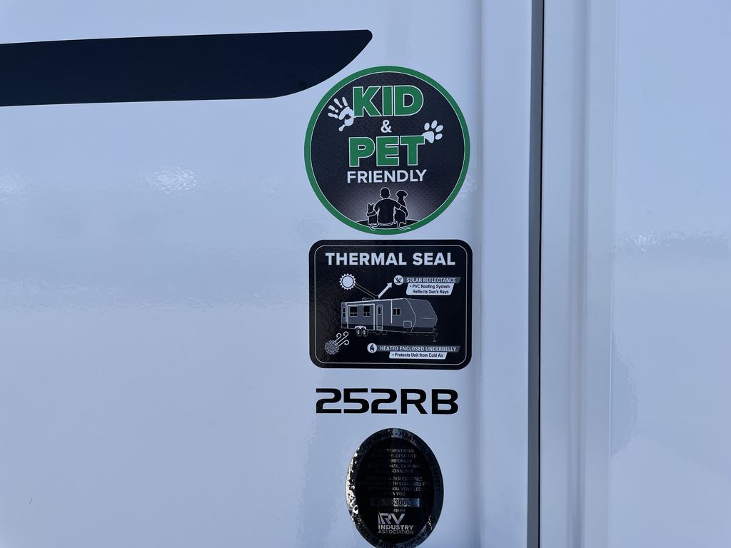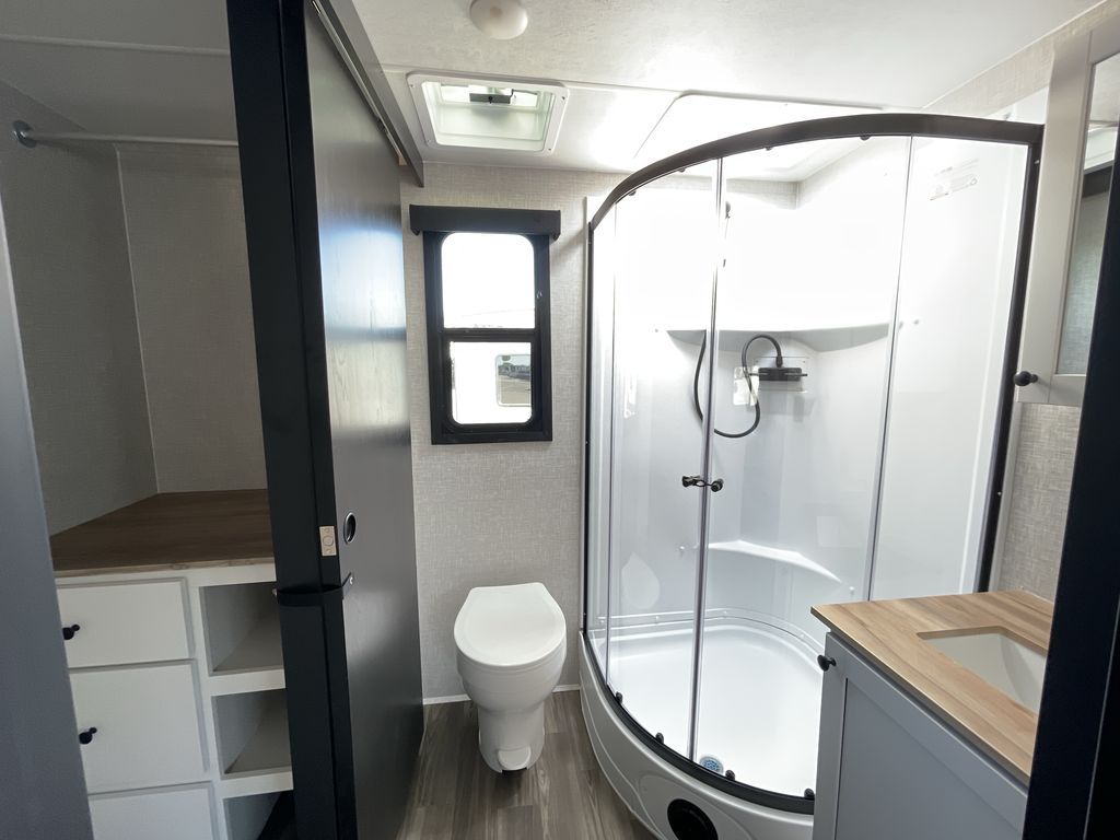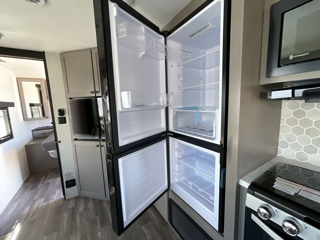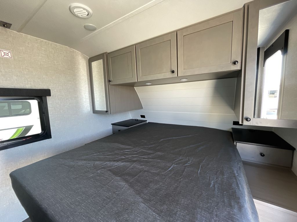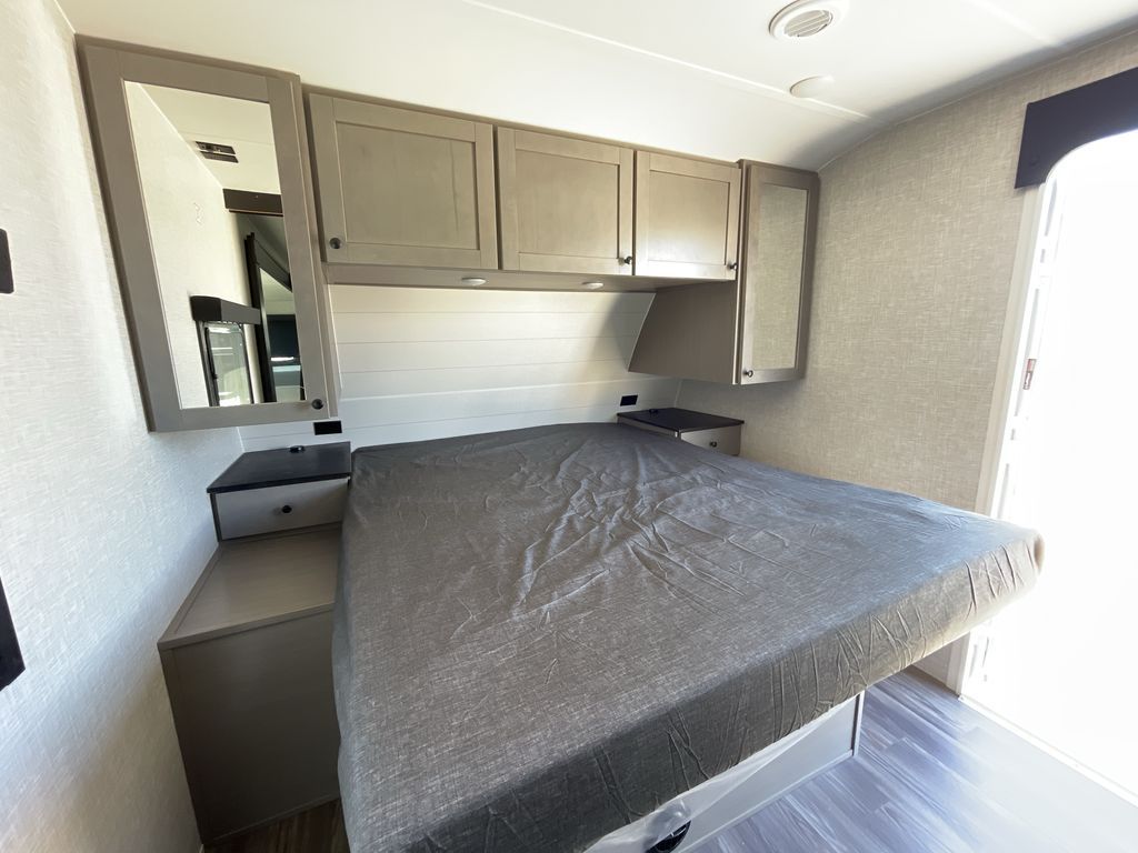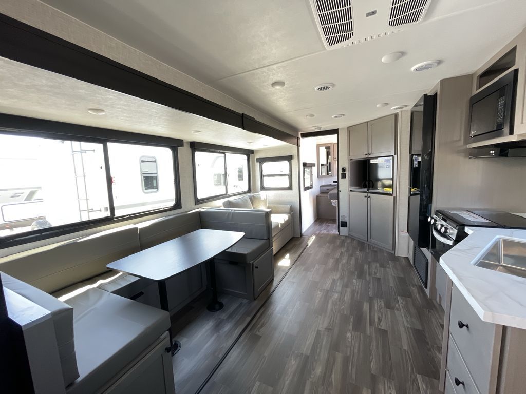 Convenience, space, and lots of camping amenities are wrapped up in this Super Lite so you can enjoy outdoor activities and inside comfort each day you are camping! There is a spacious rear bathroom that includes a walk-in closet, dual entry doors for a smooth flow of traffic in and out especially when your friends joined you, and a large slide with furniture giving you more interior floor space. The cook will have full amenities to feed everyone including a 10 cu. ft. 12V refrigerator to store the cold items, a single basin stainless steel under-mount kitchen sink, and everyone can play games at the U-shaped dinette or outside under the 20' power awning. And at night, you will have a queen bed with storage under the bed as well as beside wardrobes, USB ports and electrical outlets to keep everything charged, and a second entry into the trailer.
