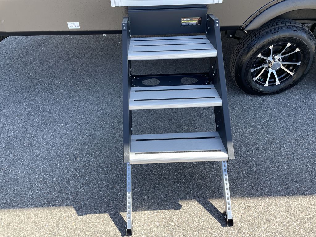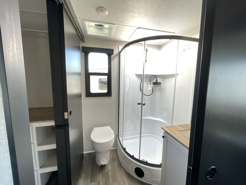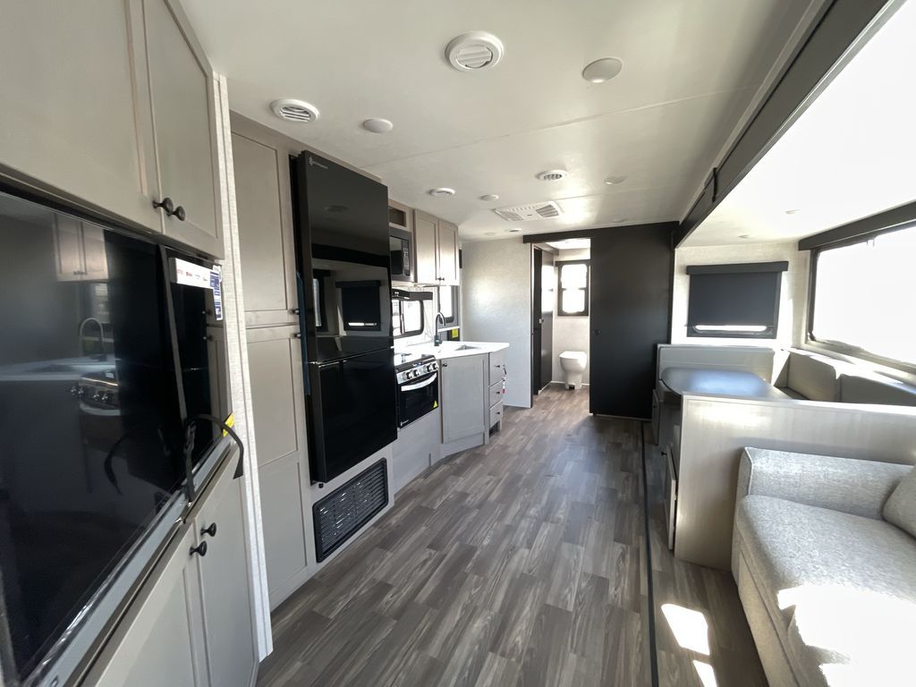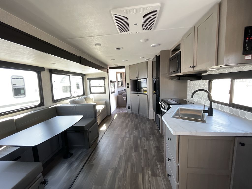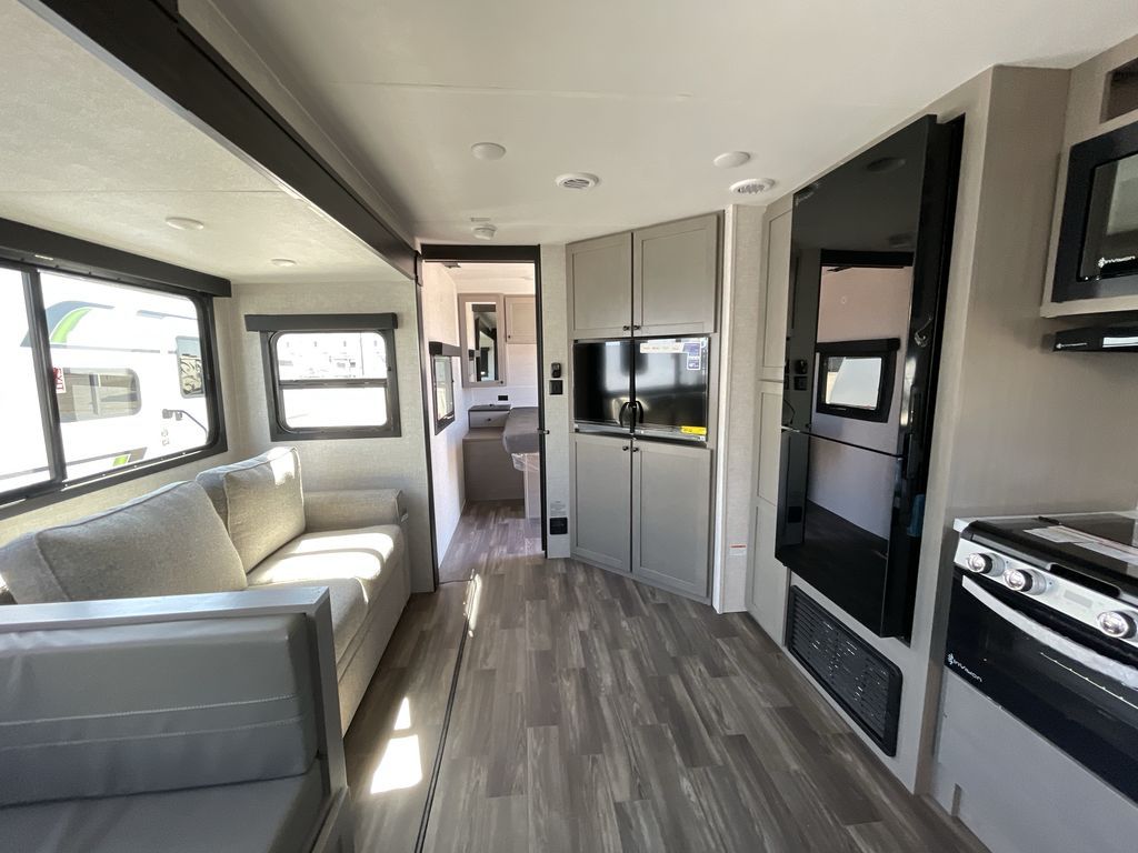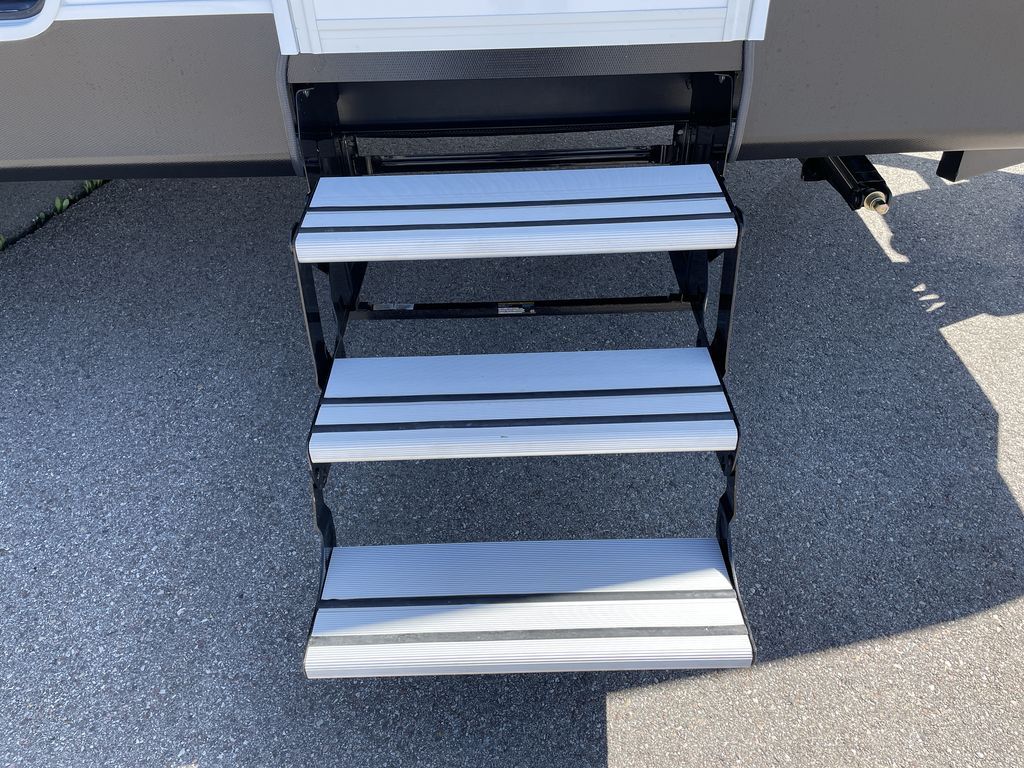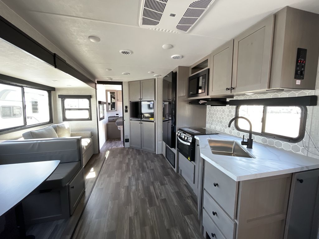 Convenience, space, and lots of camping amenities are wrapped up in this Super Lite so you can enjoy outdoor activities and inside comfort each day you are camping! There is a spacious rear bathroom that includes a walk-in closet, dual entry doors for a smooth flow of traffic in and out especially when your friends joined you, and a large slide with furniture giving you more interior floor space. The cook will have full amenities to feed everyone including a 10 cu. ft. 12V refrigerator to store the cold items, a single basin stainless steel under-mount kitchen sink, and everyone can play games at the U-shaped dinette or outside under the 20' power awning. And at night, you will have a queen bed with storage under the bed as well as beside wardrobes, USB ports and electrical outlets to keep everything charged, and a second entry into the trailer.