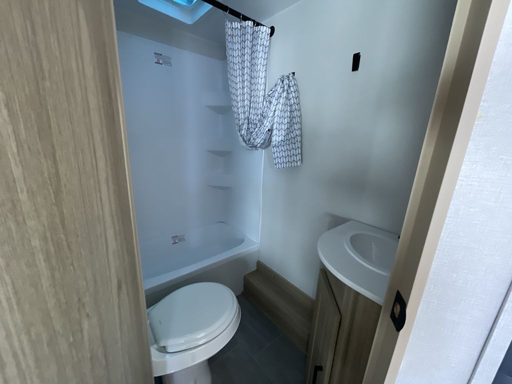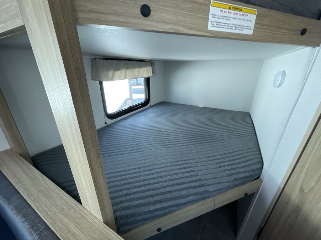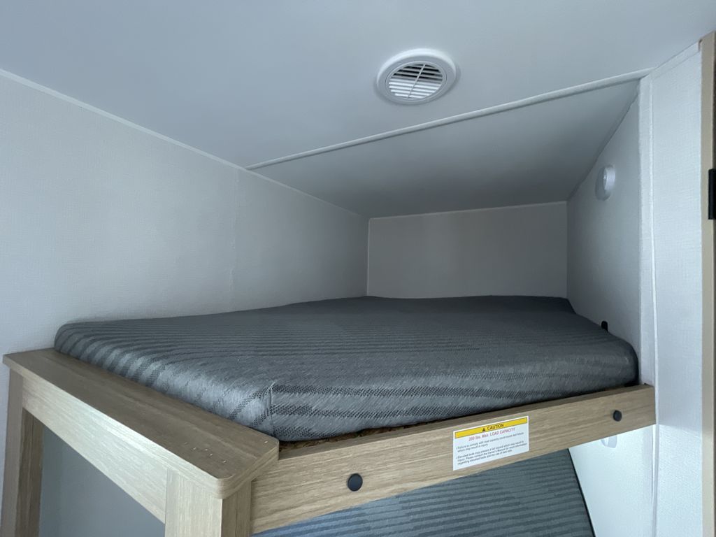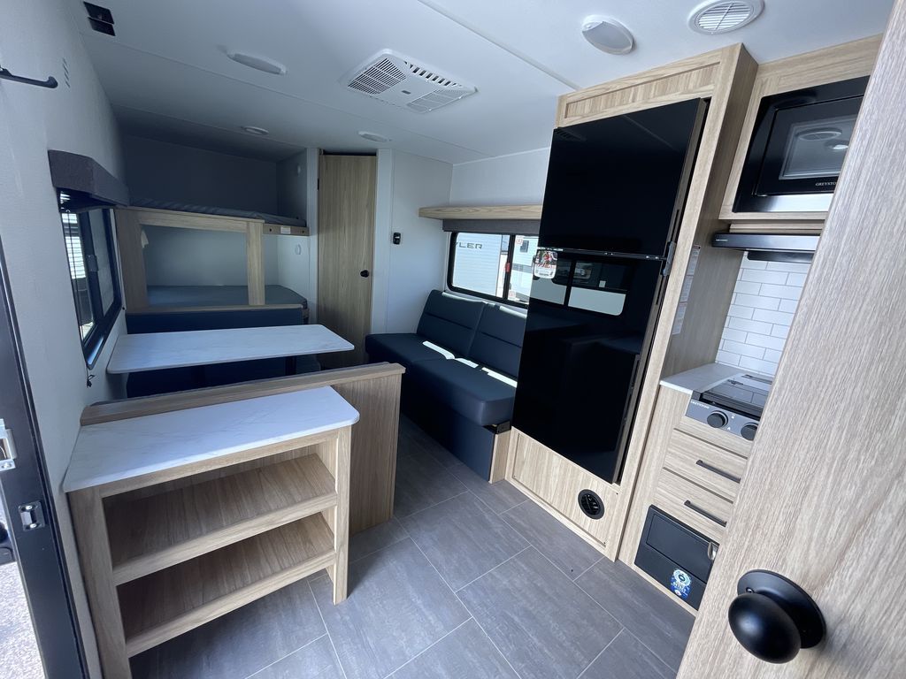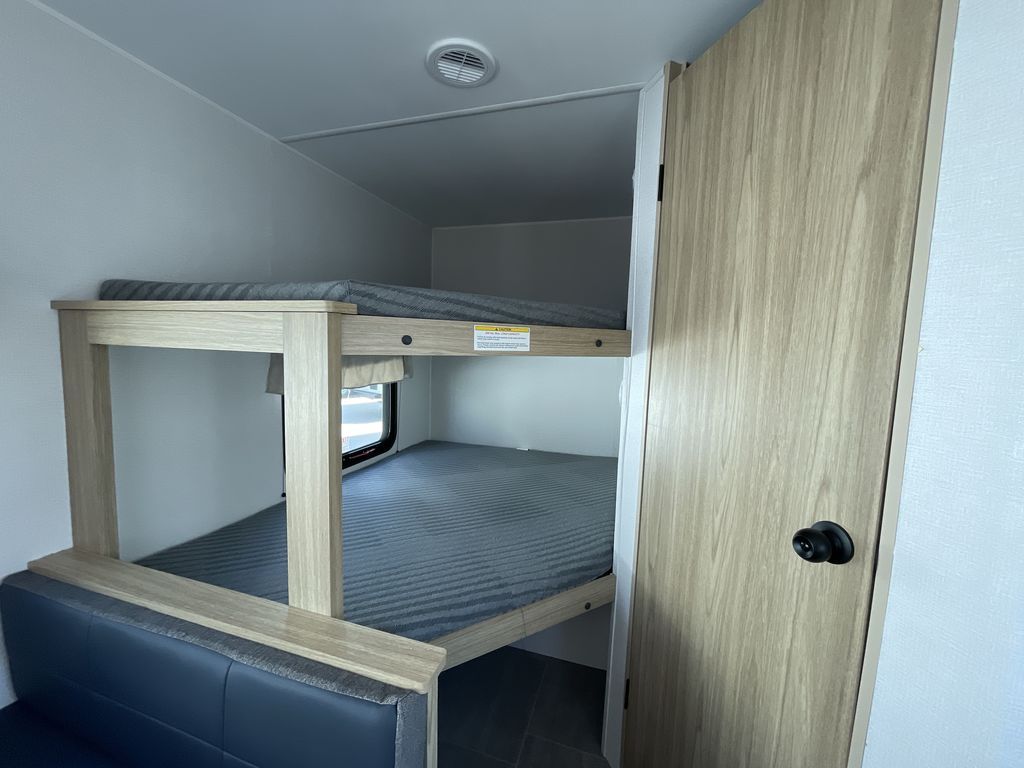 If you enjoy camping with a larger group of friends or family, this travel trailer is the one! You will love having your own front queen bed to sleep on each night, and there are double-size bunks in the rear corner for the little ones or your guests. A booth dinette provides a place to dine, play board games, and even sleep another guest if needed, and there is also a sofa to relax on. The chef of your group can whip up meals on the two burner cooktop, and there is a 12V residential refrigerator to keep food fresh. This model also includes a private bath with a shower and toilet so you don't have to use the camp's facilities at night!
