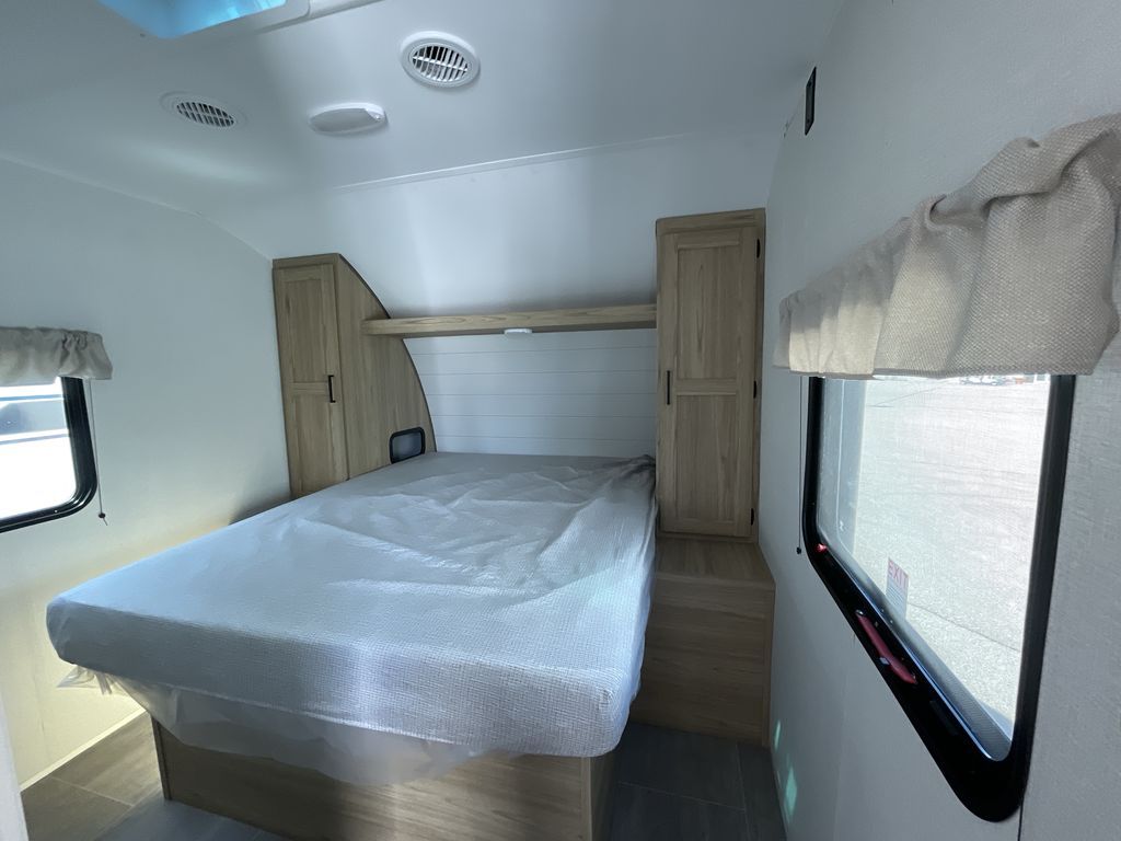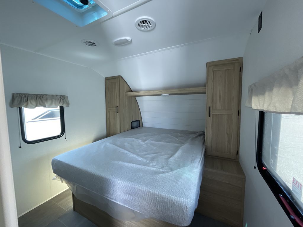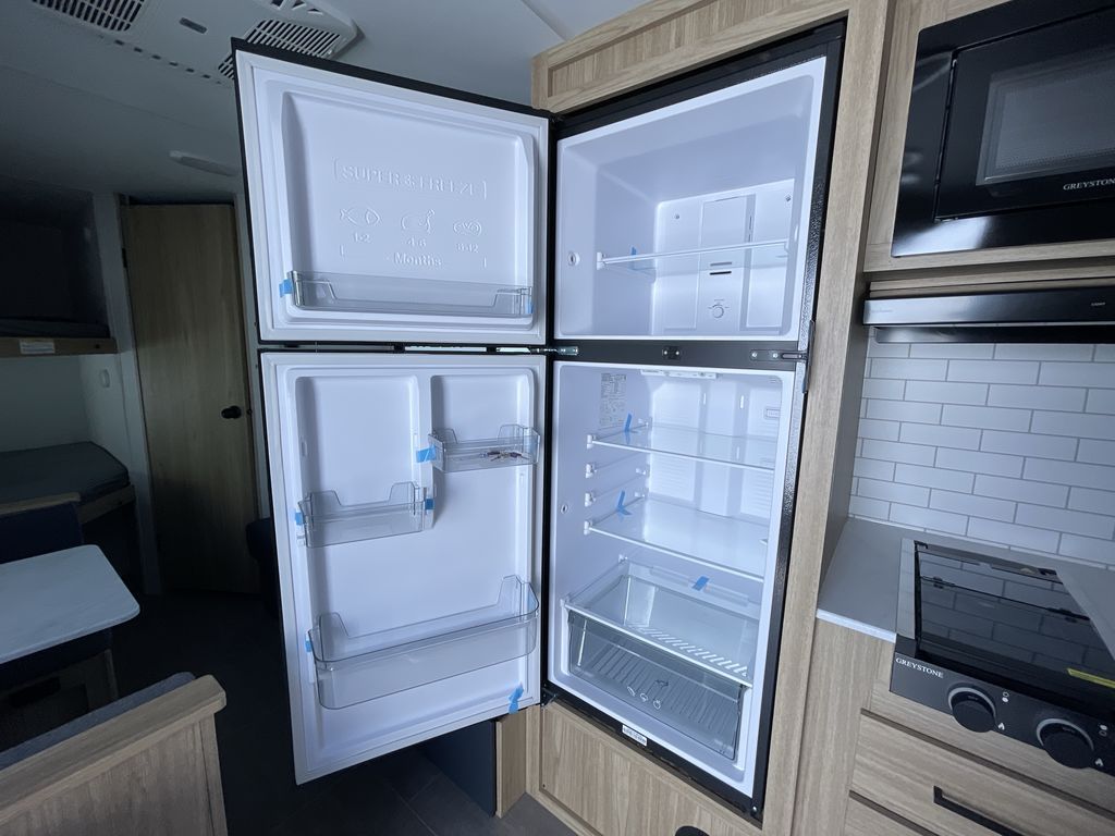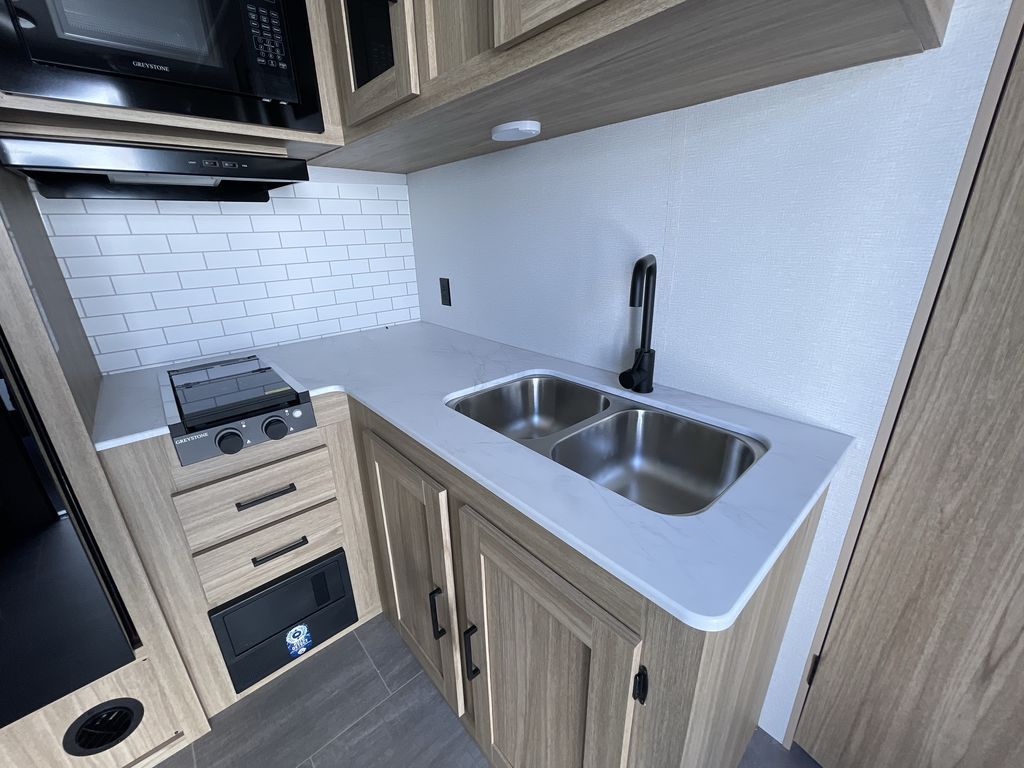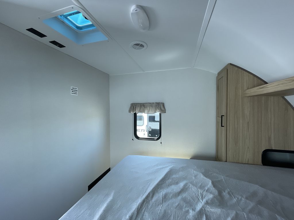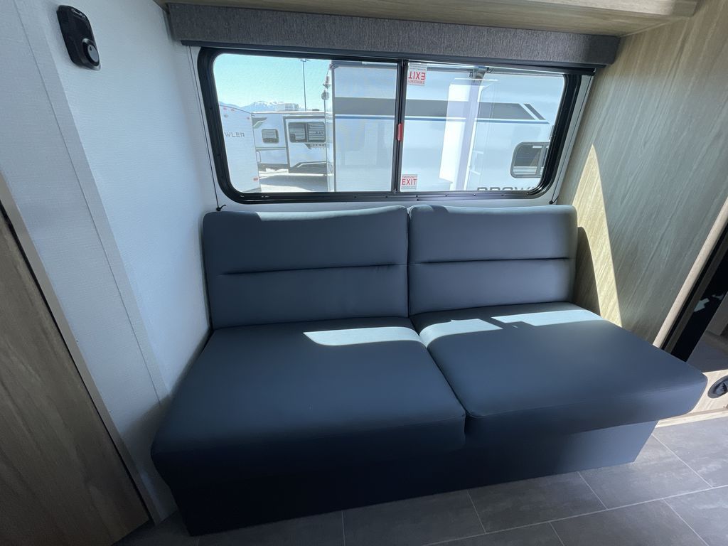 If you enjoy camping with a larger group of friends or family, this travel trailer is the one! You will love having your own front queen bed to sleep on each night, and there are double-size bunks in the rear corner for the little ones or your guests. A booth dinette provides a place to dine, play board games, and even sleep another guest if needed, and there is also a sofa to relax on. The chef of your group can whip up meals on the two burner cooktop, and there is a 12V residential refrigerator to keep food fresh. This model also includes a private bath with a shower and toilet so you don't have to use the camp's facilities at night!