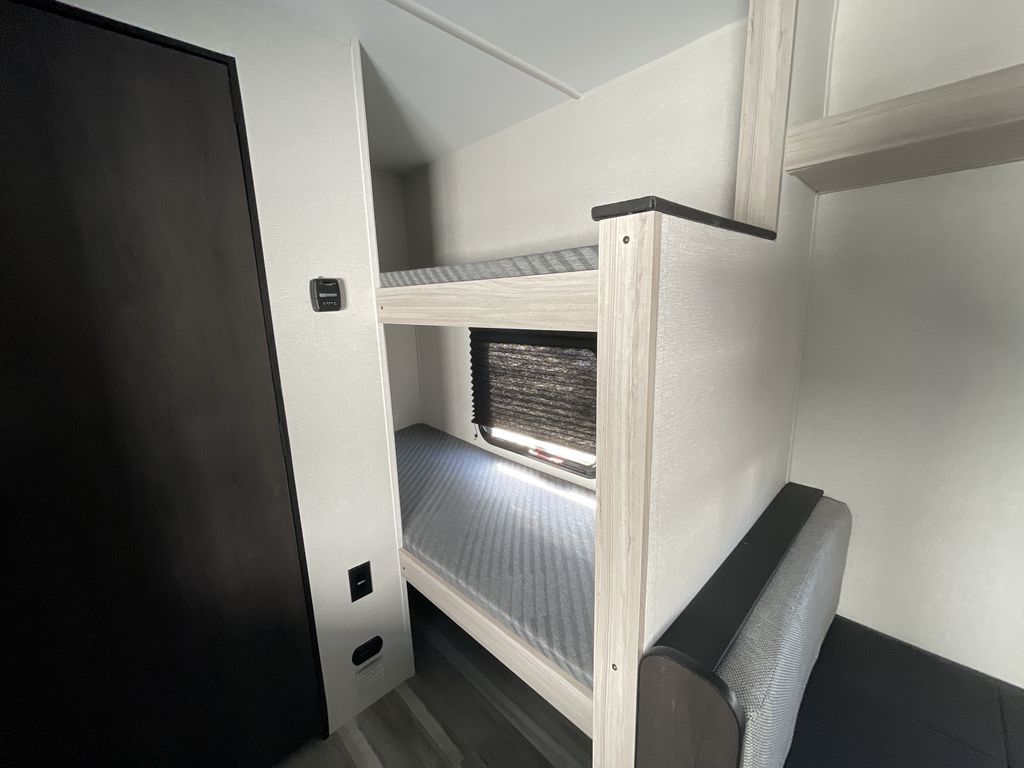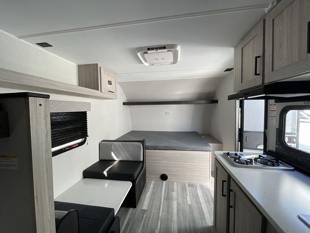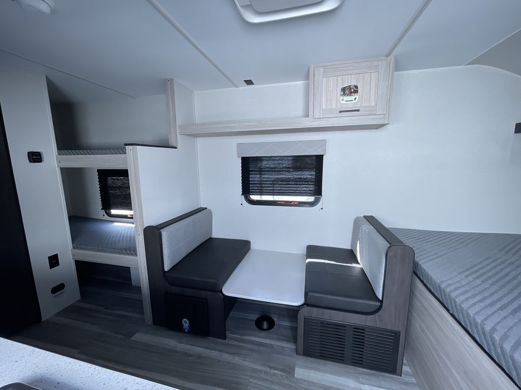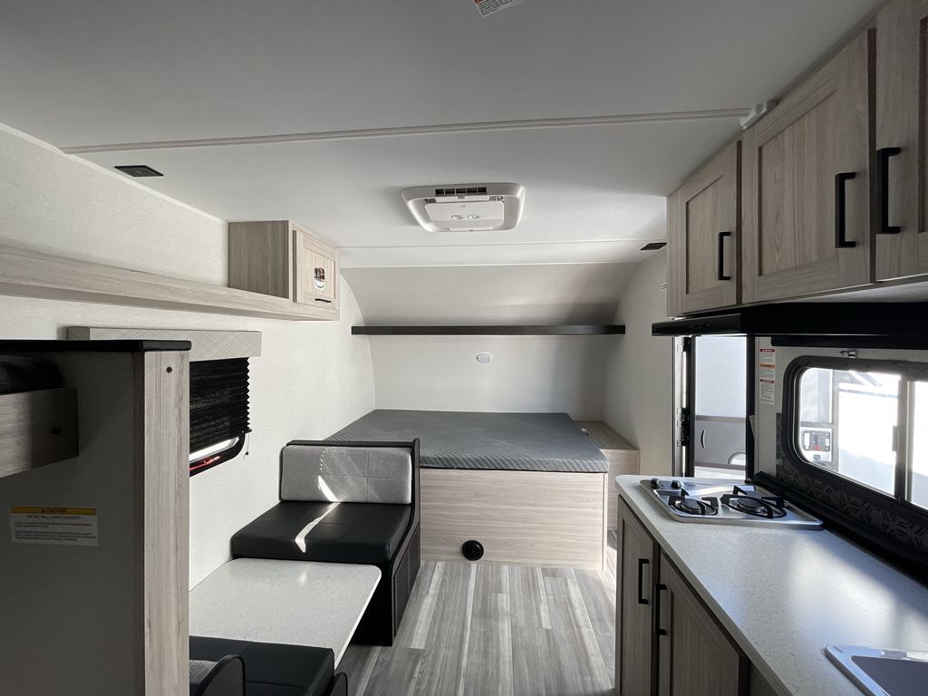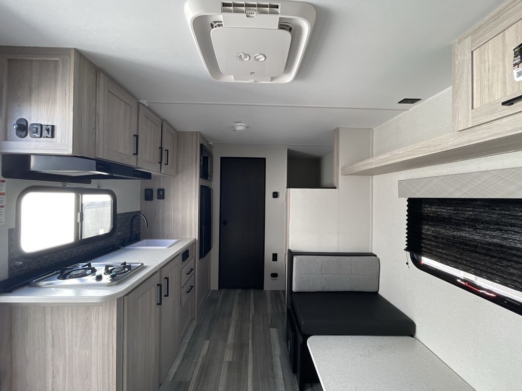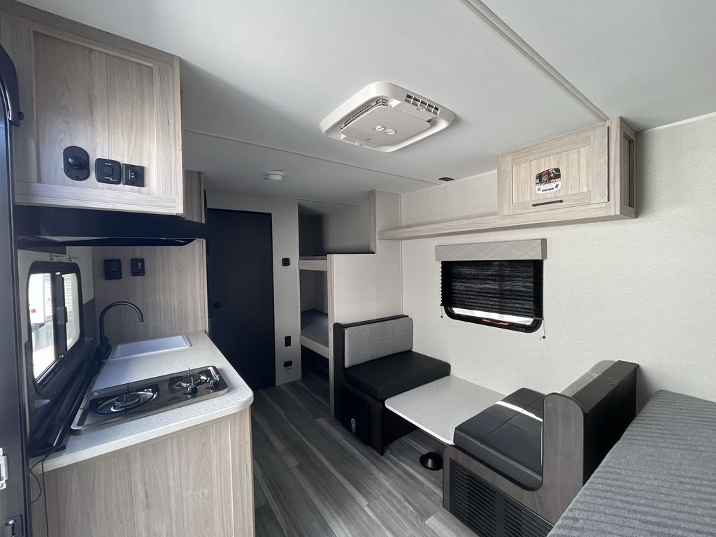 You'll love every minute spent in this travel trailer that can sleep five each night. There are bunk beds towards the back right beside the private bath for easy nighttime use. The queen bed up front will provide a great night's rest, and the booth dinette can double as dining and sleeping space. A two burner cooktop will let you cook meals each day, and there is a 3.3 cu. ft. 12V refrigerator for perishables.