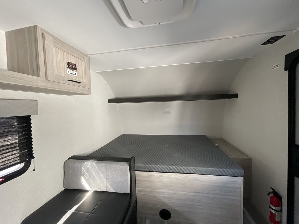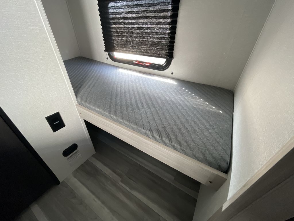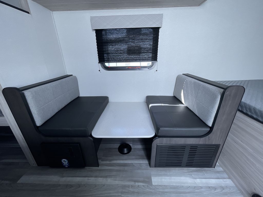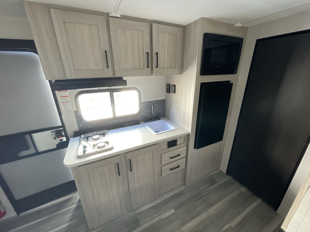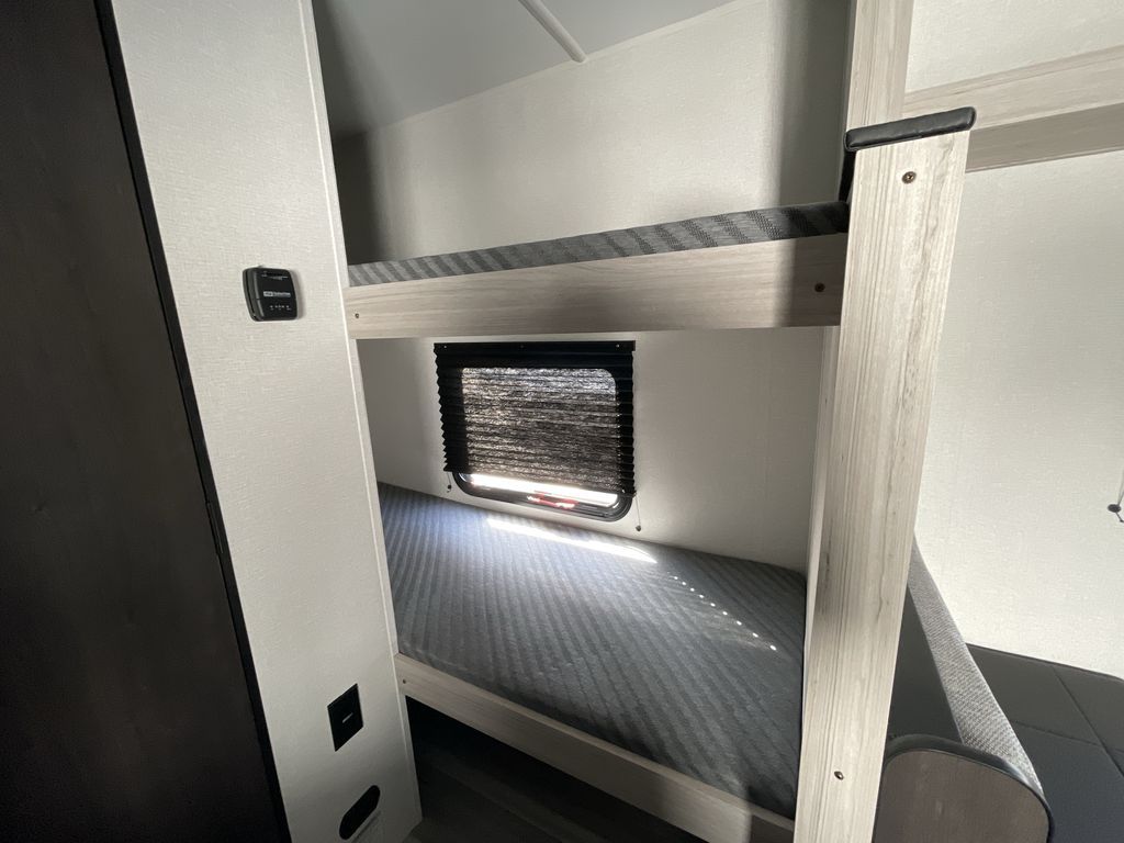 You'll love every minute spent in this travel trailer that can sleep five each night. There are bunk beds towards the back right beside the private bath for easy nighttime use. The queen bed up front will provide a great night's rest, and the booth dinette can double as dining and sleeping space. A two burner cooktop will let you cook meals each day, and there is a 3.3 cu. ft. 12V refrigerator for perishables.