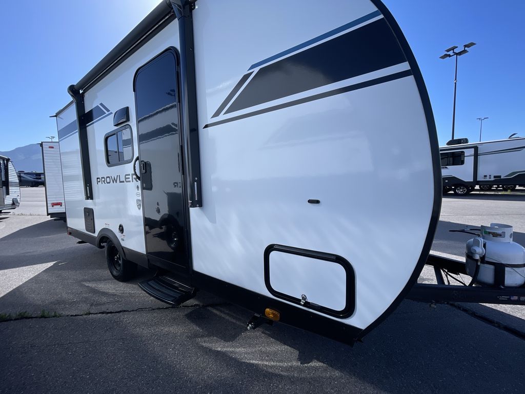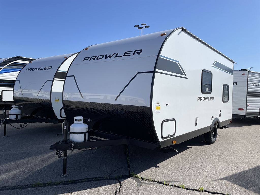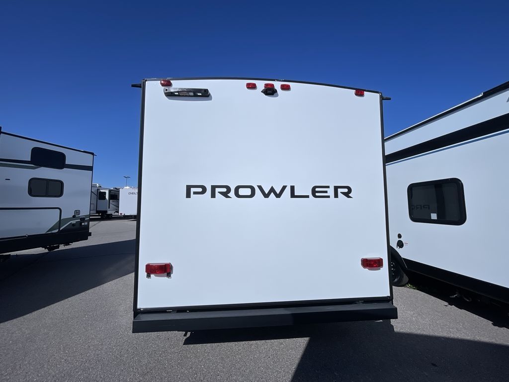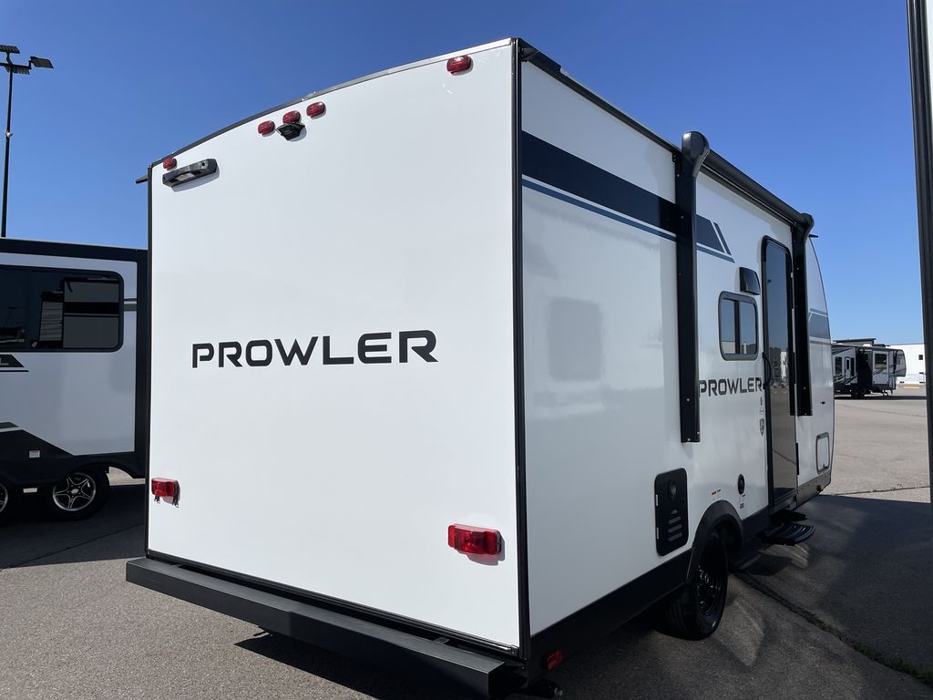 Get ready for comfortable and easy camping with the Prowler travel trailers by Heartland. The exterior features a power awning with LED lighting, stabilizer jacks, and diamond plate rock guard to help protect against rock and debris on the way to the campground. There is also a ladder and rear camera prep, an 8K roof mounted A/C, and a 20 lb. LP tank. Inside, you'll enjoy the dimmable LED ceiling lighting to keep your space well lit, and the on-demand water heater will provide endless hot showers.