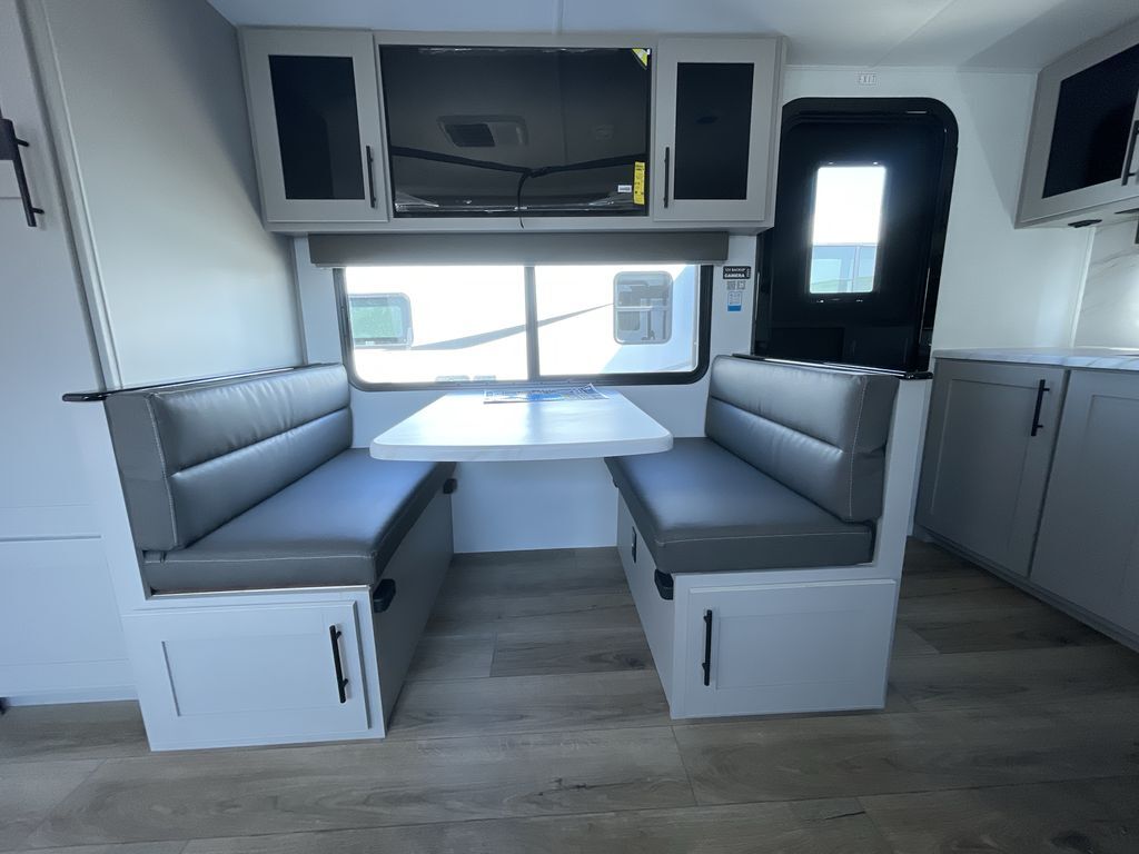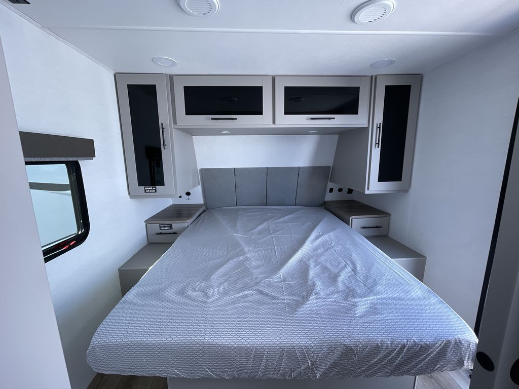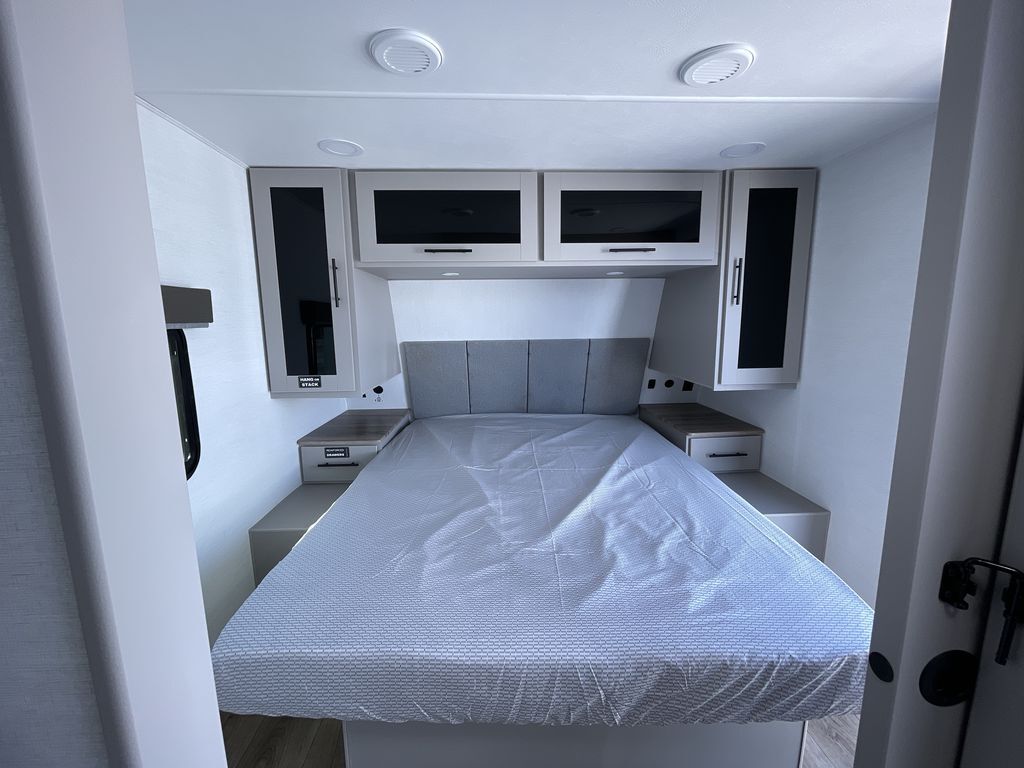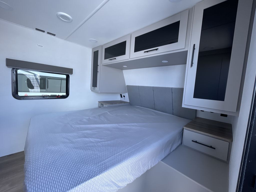 Grab your hiking boots and your sense of adventure for fun camping trips in this single slide out travel trailer. The rear booth dinette includes overhead storage for your things and the sofa slide out is in great view of the 40" HDTV. There is also a fireplace here that will make your space feel more like home plus more storage space, including an entryway pantry and storage above the 10 cu. ft. 12V refrigerator. A walk-through bath will take you to the front master bedroom with a queen bed, wardrobe nightstands, plus its own exterior entry door!