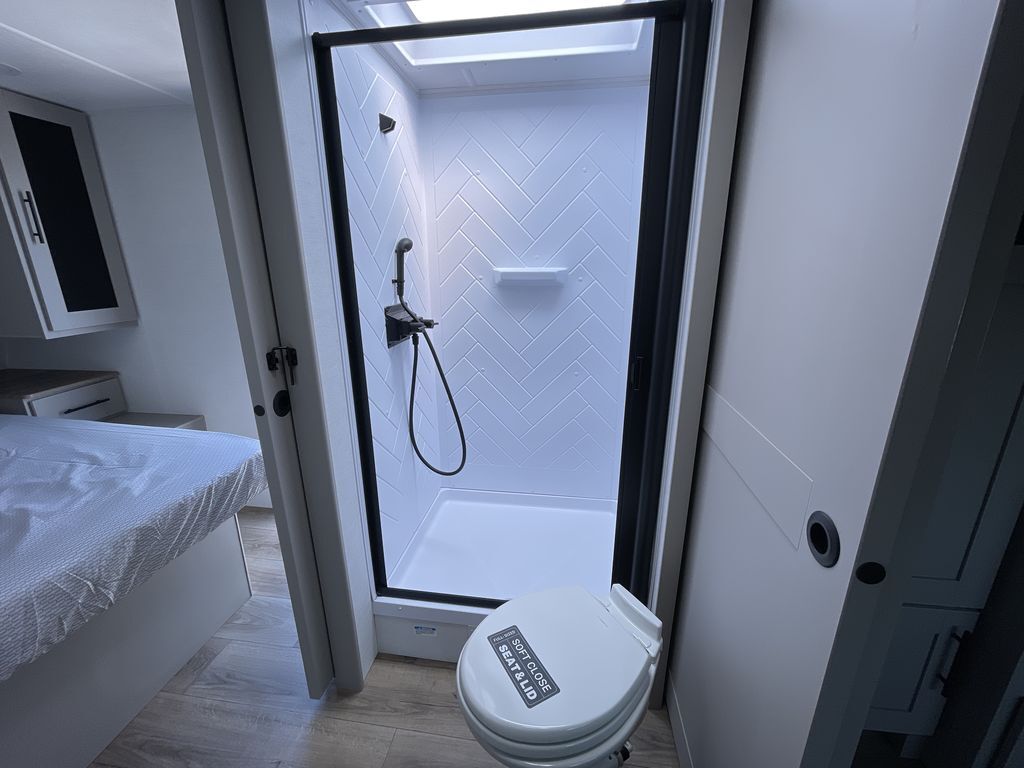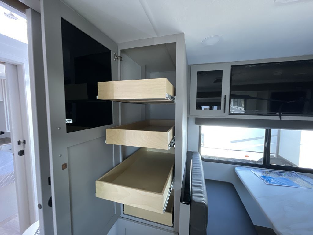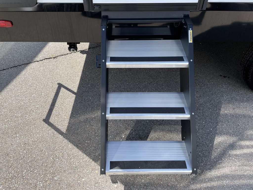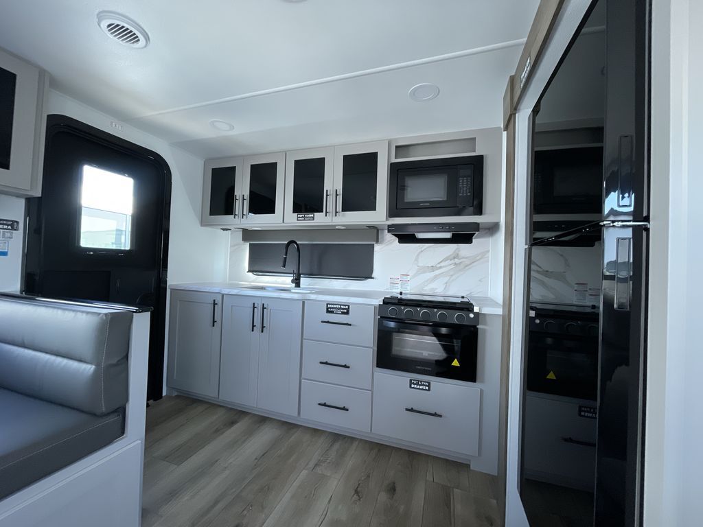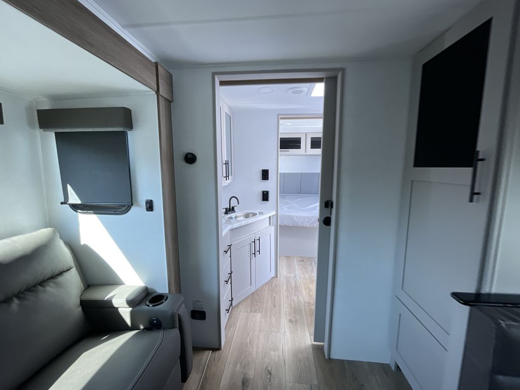 Grab your hiking boots and your sense of adventure for fun camping trips in this single slide out travel trailer. The rear booth dinette includes overhead storage for your things and the sofa slide out is in great view of the 40" HDTV. There is also a fireplace here that will make your space feel more like home plus more storage space, including an entryway pantry and storage above the 10 cu. ft. 12V refrigerator. A walk-through bath will take you to the front master bedroom with a queen bed, wardrobe nightstands, plus its own exterior entry door!