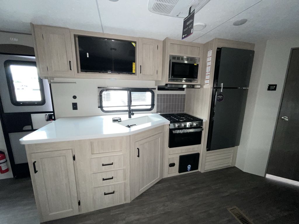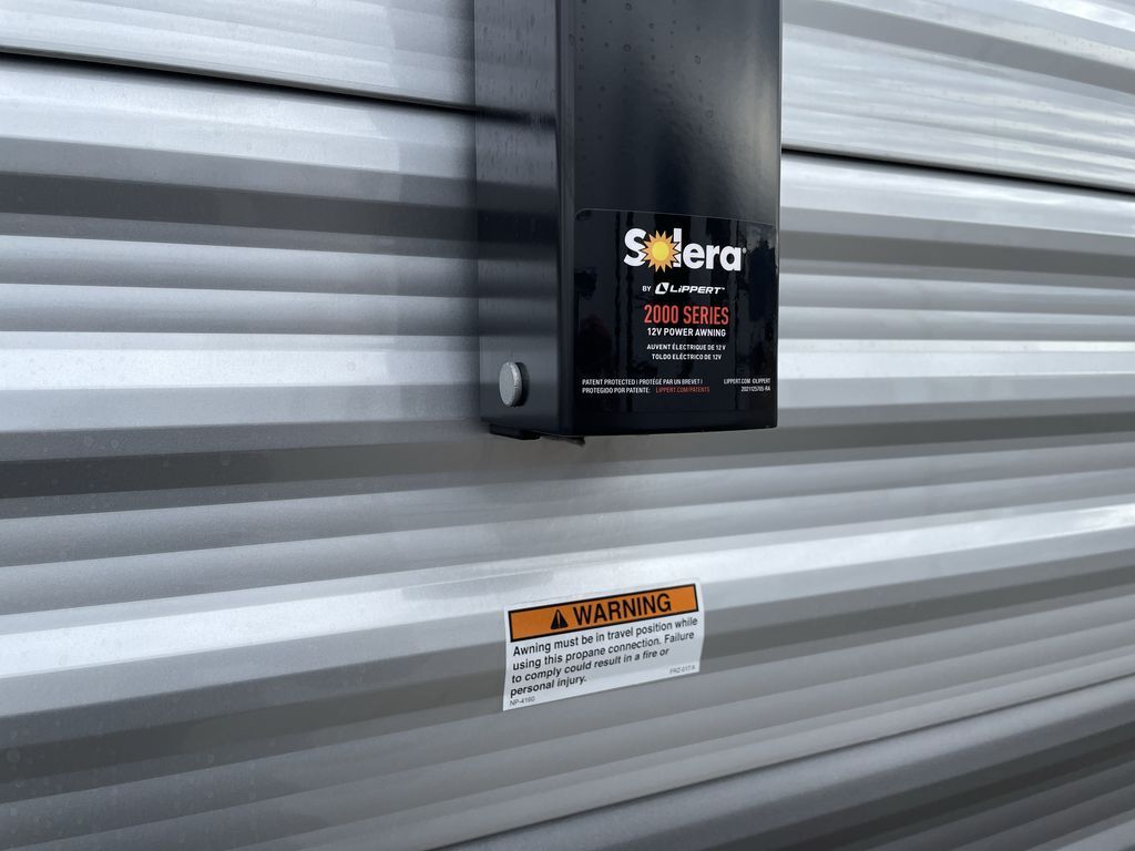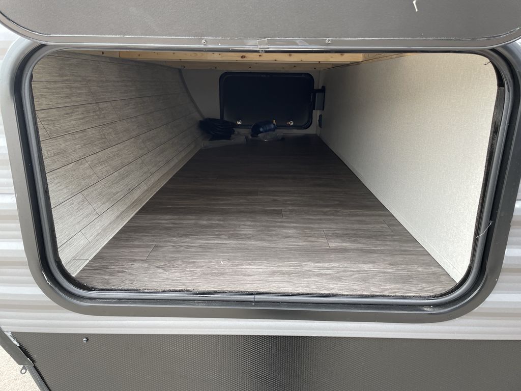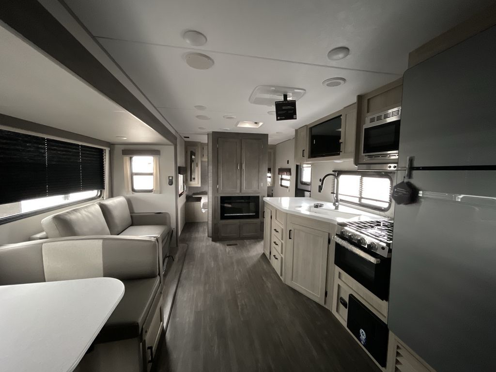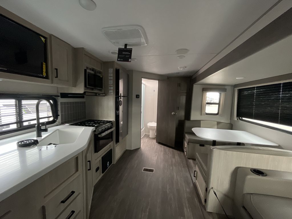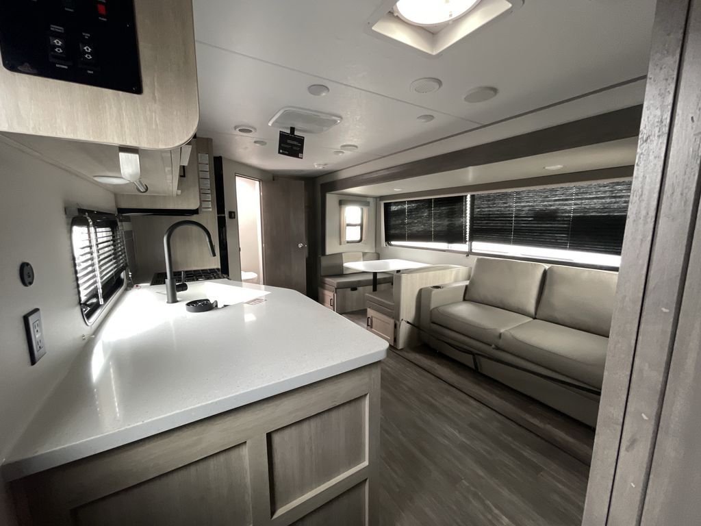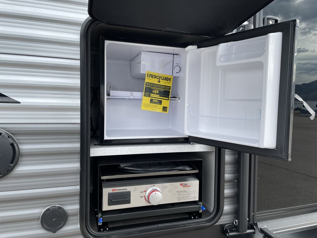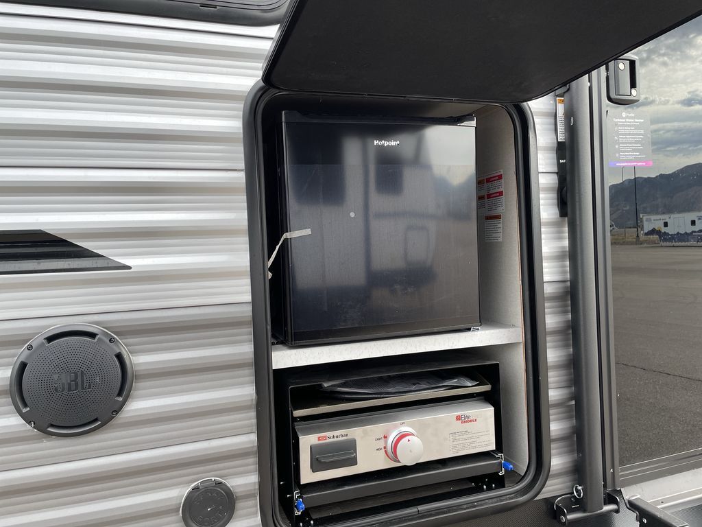 When you are ready to camp with your favorite person, this trailer offers the perfect couples trailer with space for an overnight guest on the booth dinette. You will have a front bedroom with a walk-around queen bed, dual wardrobes and overhead cabinets for your belongings. The main living and kitchen area is spacious with a slide out dinette and sofa giving you more floor space, dining and relaxing seating, and extra sleeping space for friends once the furniture is easily setup. There is a wardrobe/pantry next to the rear corner bathroom complete with a radius shower. The galley kitchen includes full amenities, plus there is an outside kitchen with a griddle and mini refrigerator. Everyone will enjoy the entertainment center when inside, and the 18' awning offers a covered outdoor living area, just grab your chairs from the pass-through compartment.