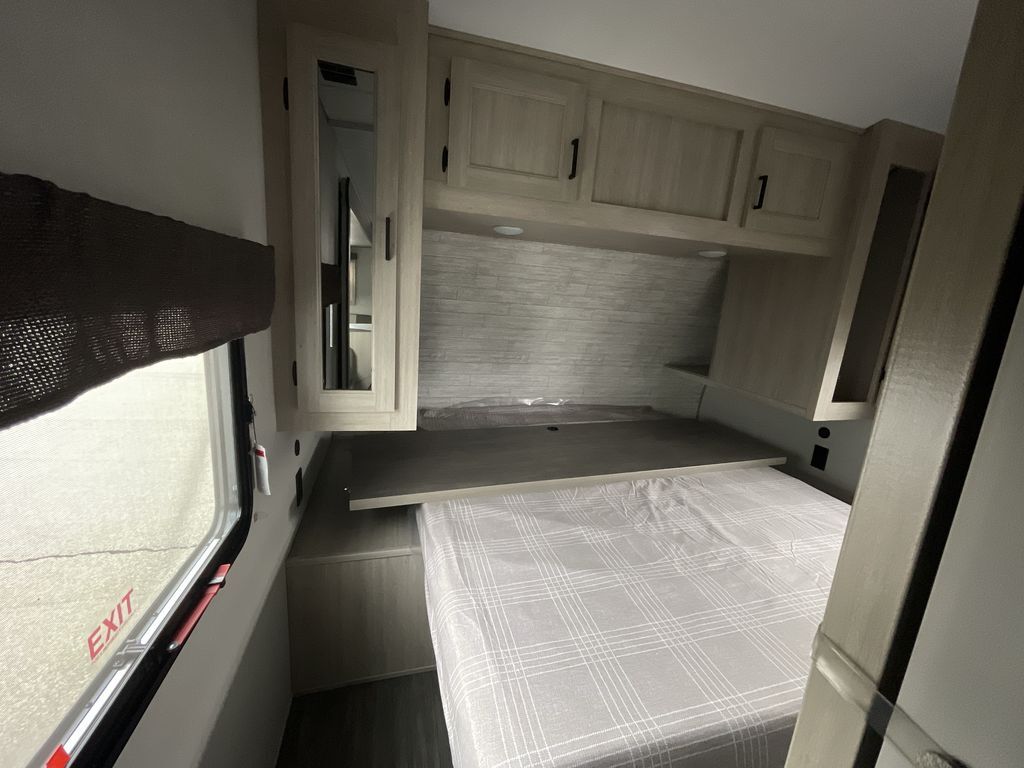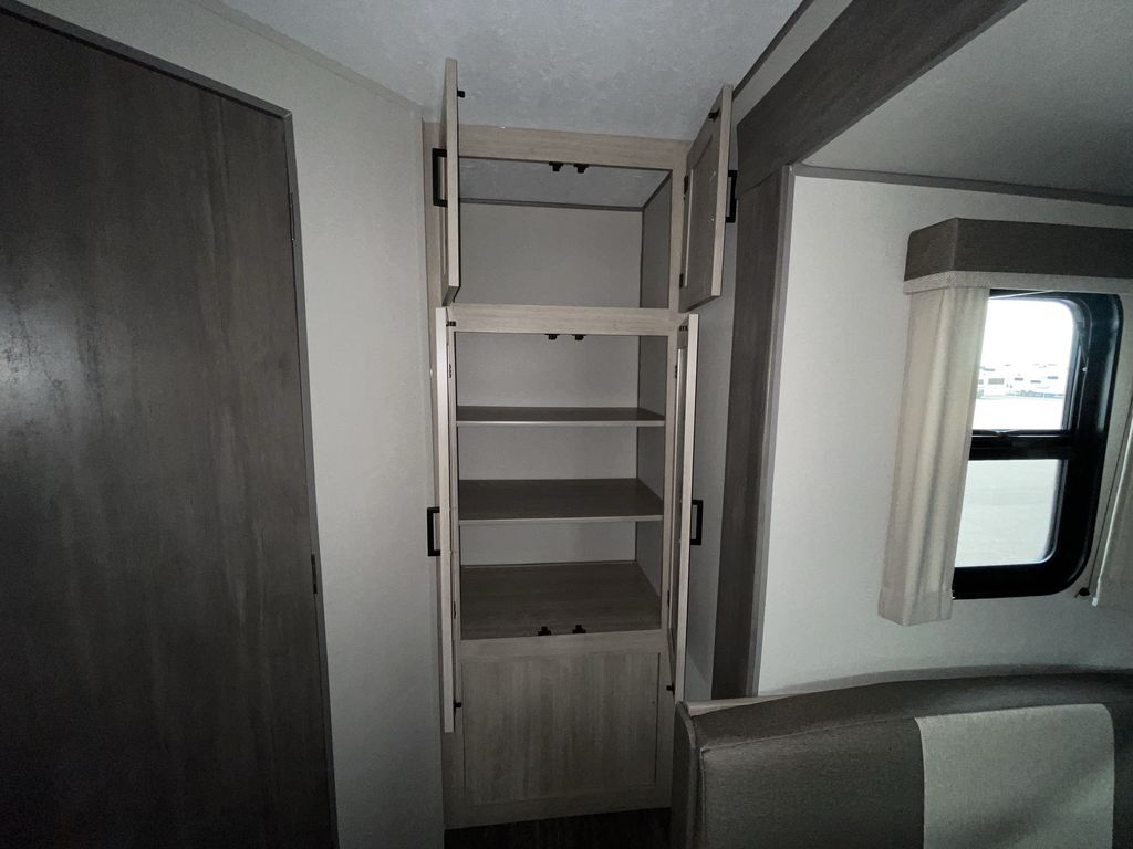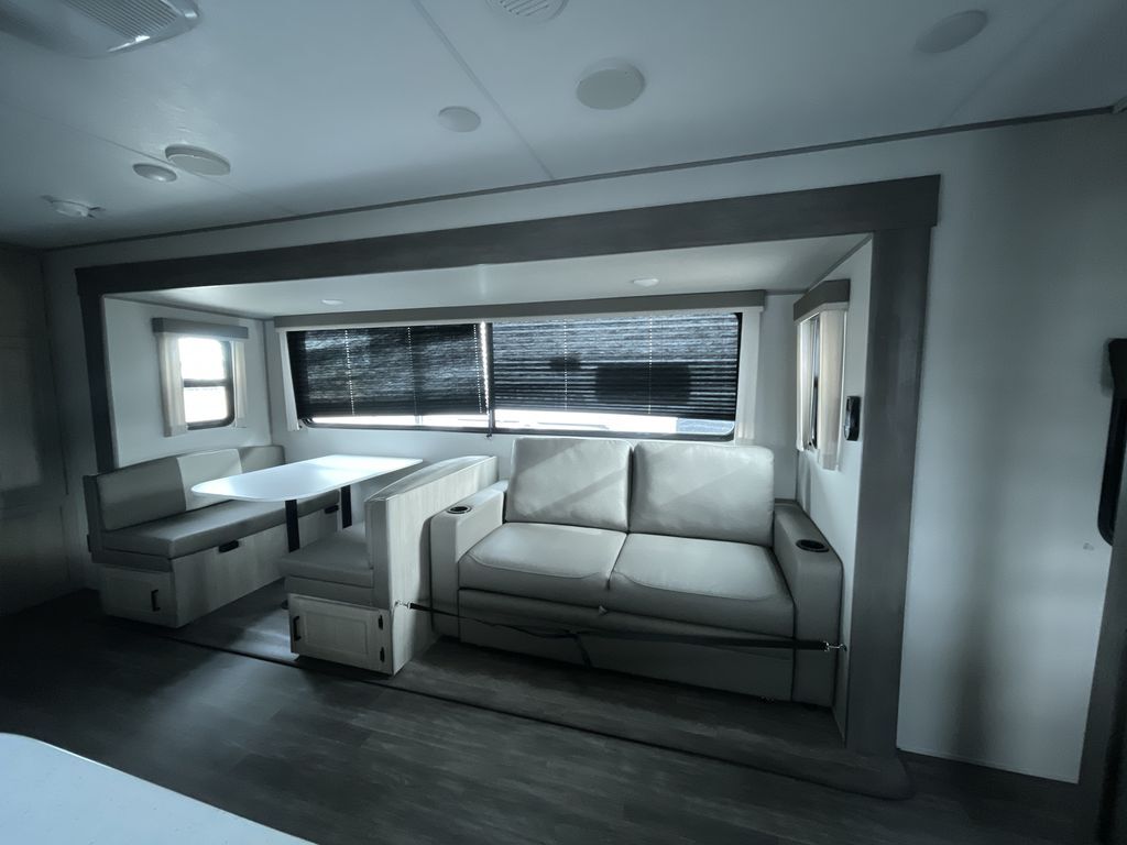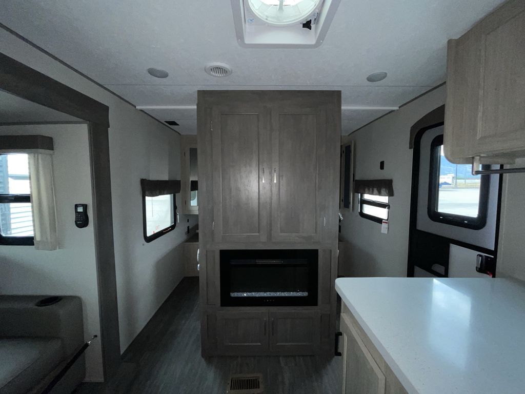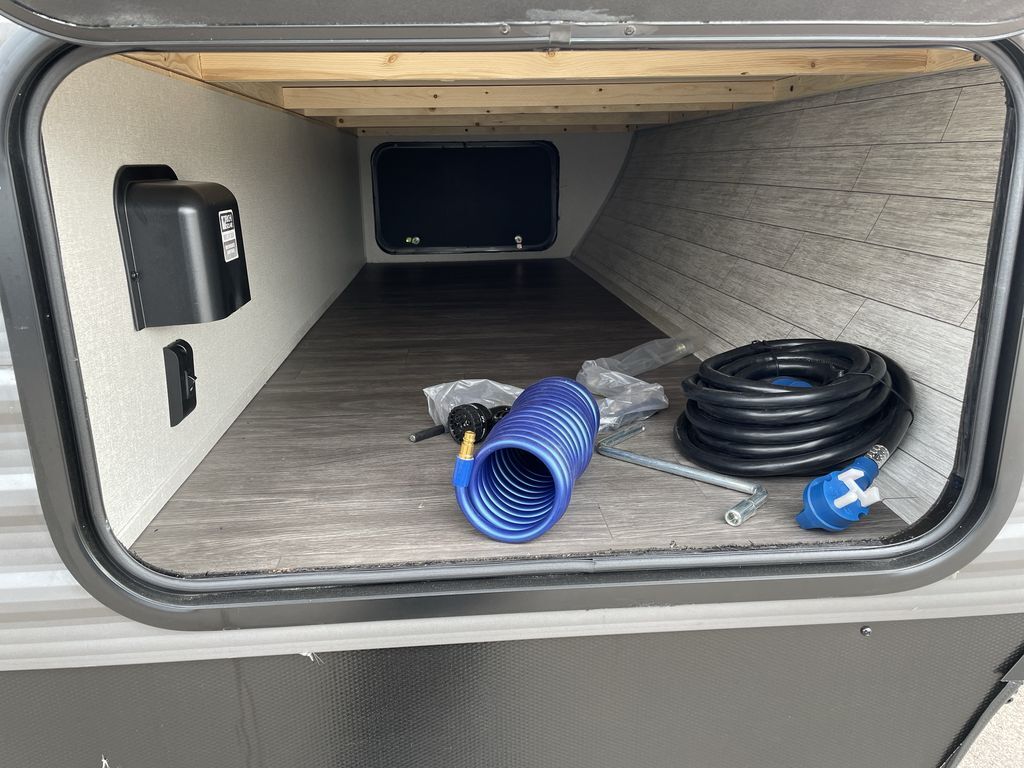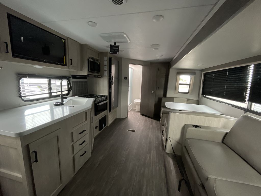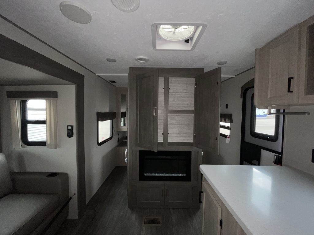 When you are ready to camp with your favorite person, this trailer offers the perfect couples trailer with space for an overnight guest on the booth dinette. You will have a front bedroom with a walk-around queen bed, dual wardrobes and overhead cabinets for your belongings. The main living and kitchen area is spacious with a slide out dinette and sofa giving you more floor space, dining and relaxing seating, and extra sleeping space for friends once the furniture is easily setup. There is a wardrobe/pantry next to the rear corner bathroom complete with a radius shower. The galley kitchen includes full amenities, plus there is an outside kitchen with a griddle and mini refrigerator. Everyone will enjoy the entertainment center when inside, and the 18' awning offers a covered outdoor living area, just grab your chairs from the pass-through compartment.
