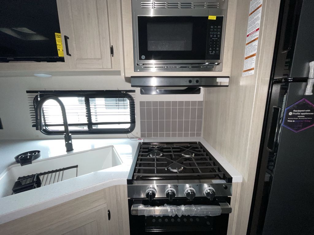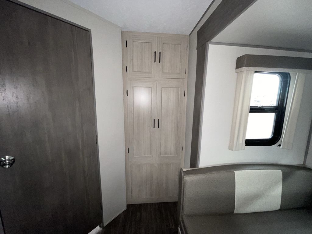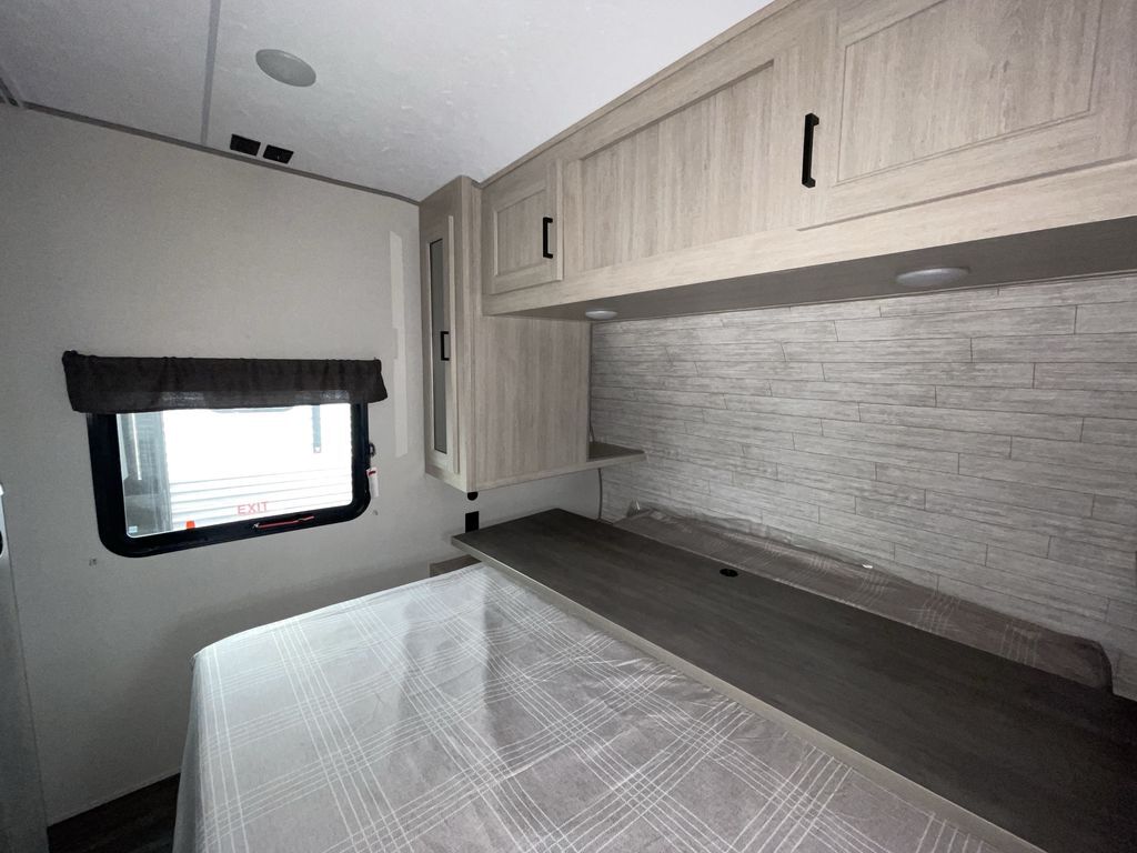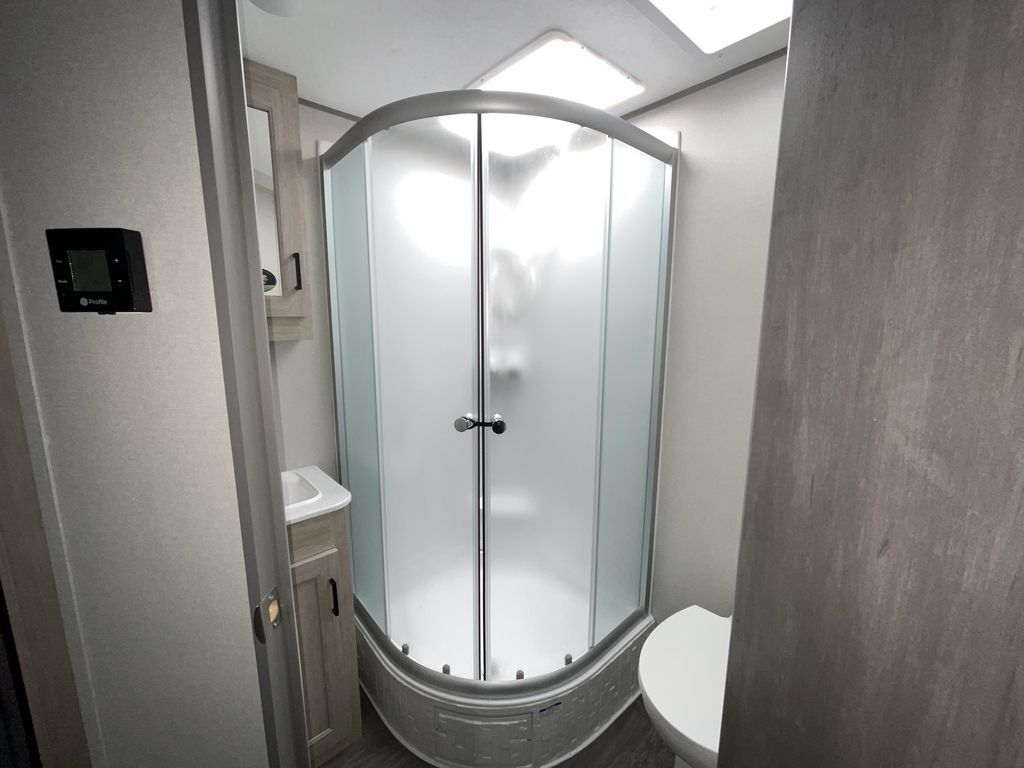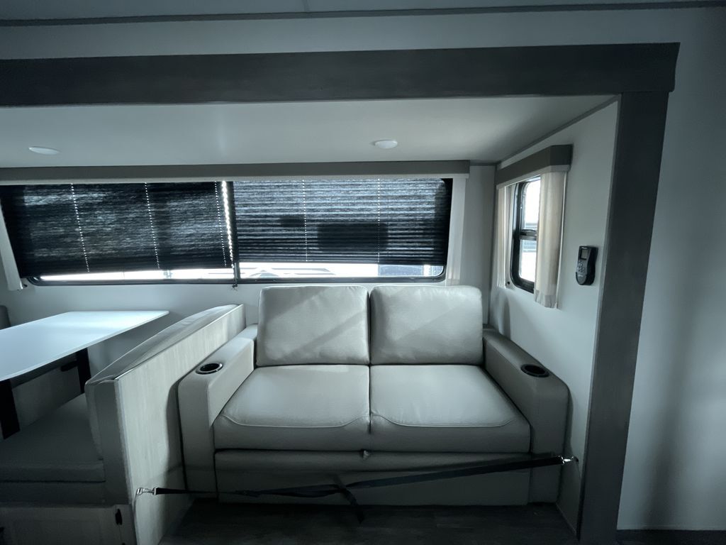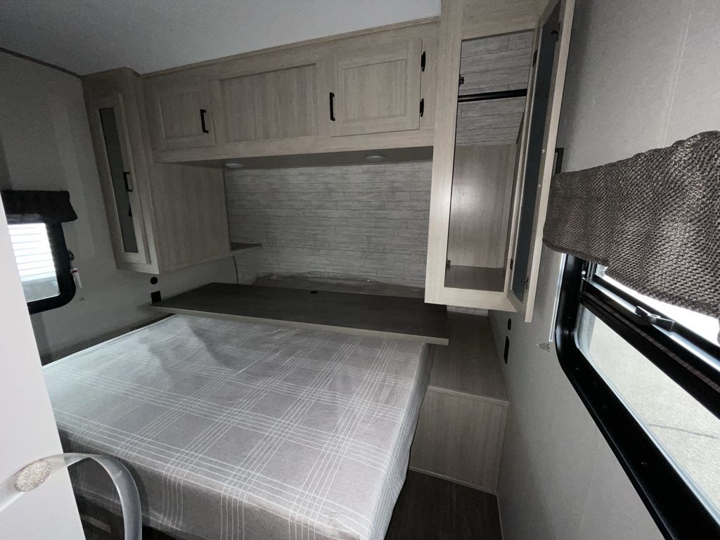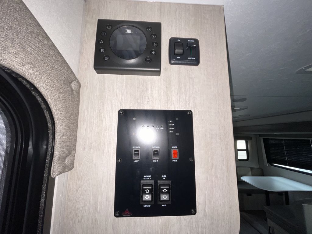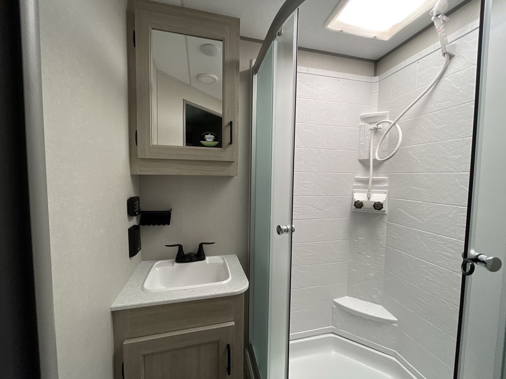 When you are ready to camp with your favorite person, this trailer offers the perfect couples trailer with space for an overnight guest on the booth dinette. You will have a front bedroom with a walk-around queen bed, dual wardrobes and overhead cabinets for your belongings. The main living and kitchen area is spacious with a slide out dinette and sofa giving you more floor space, dining and relaxing seating, and extra sleeping space for friends once the furniture is easily setup. There is a wardrobe/pantry next to the rear corner bathroom complete with a radius shower. The galley kitchen includes full amenities, plus there is an outside kitchen with a griddle and mini refrigerator. Everyone will enjoy the entertainment center when inside, and the 18' awning offers a covered outdoor living area, just grab your chairs from the pass-through compartment.