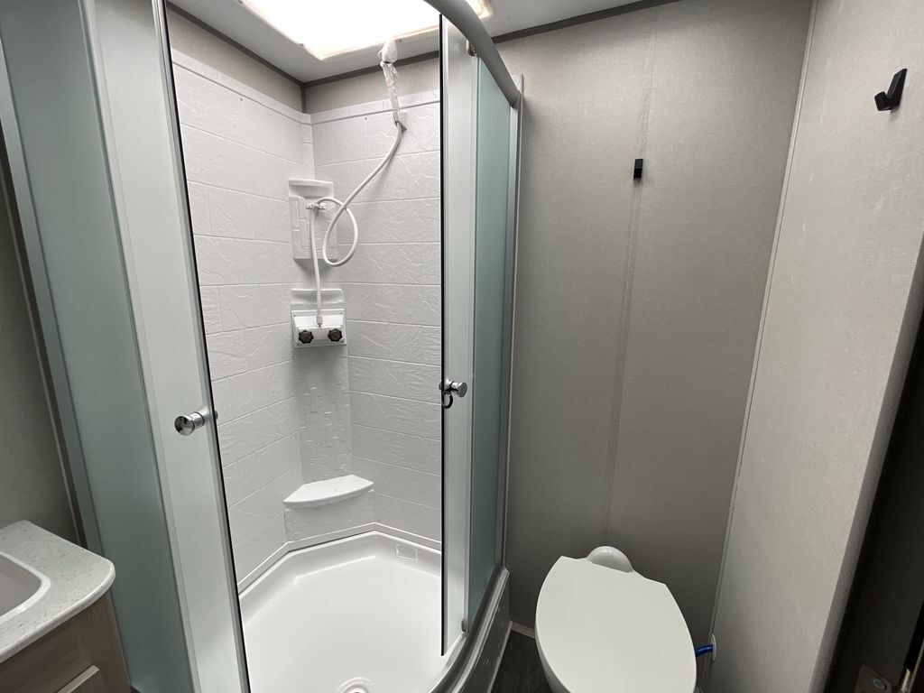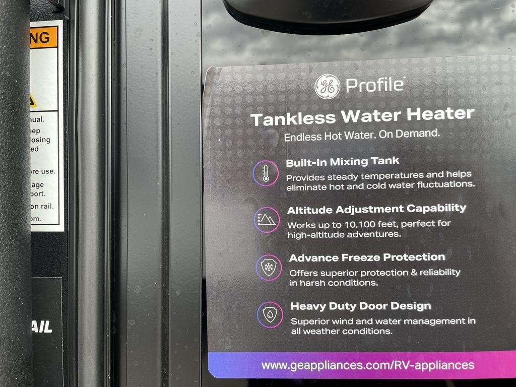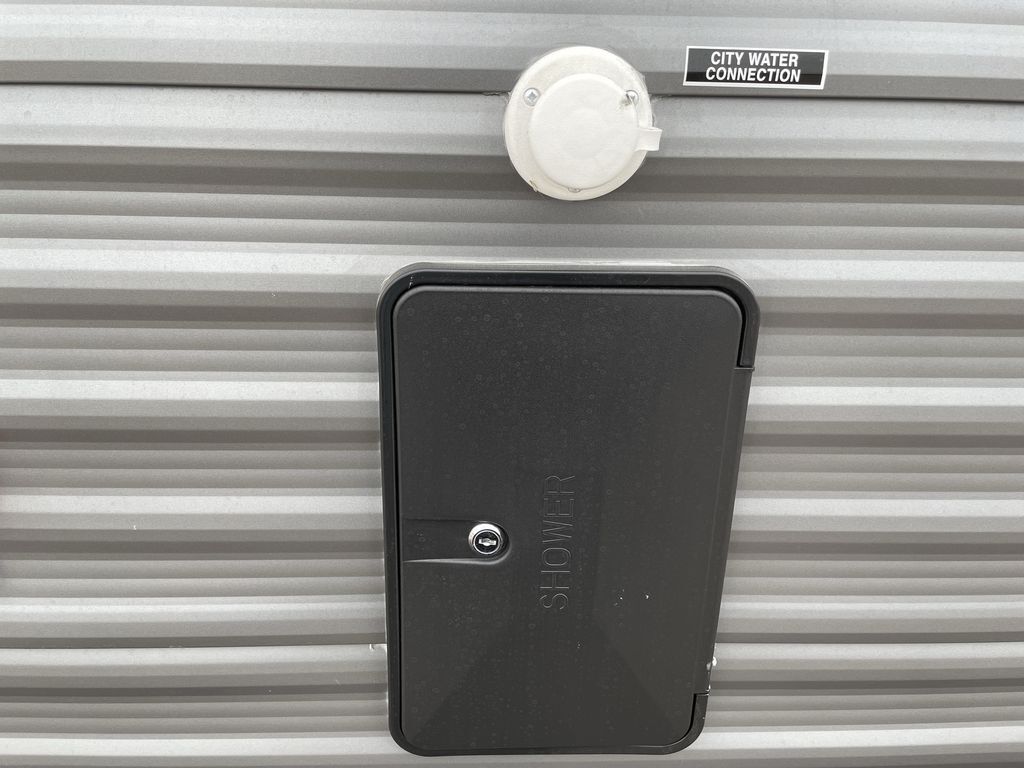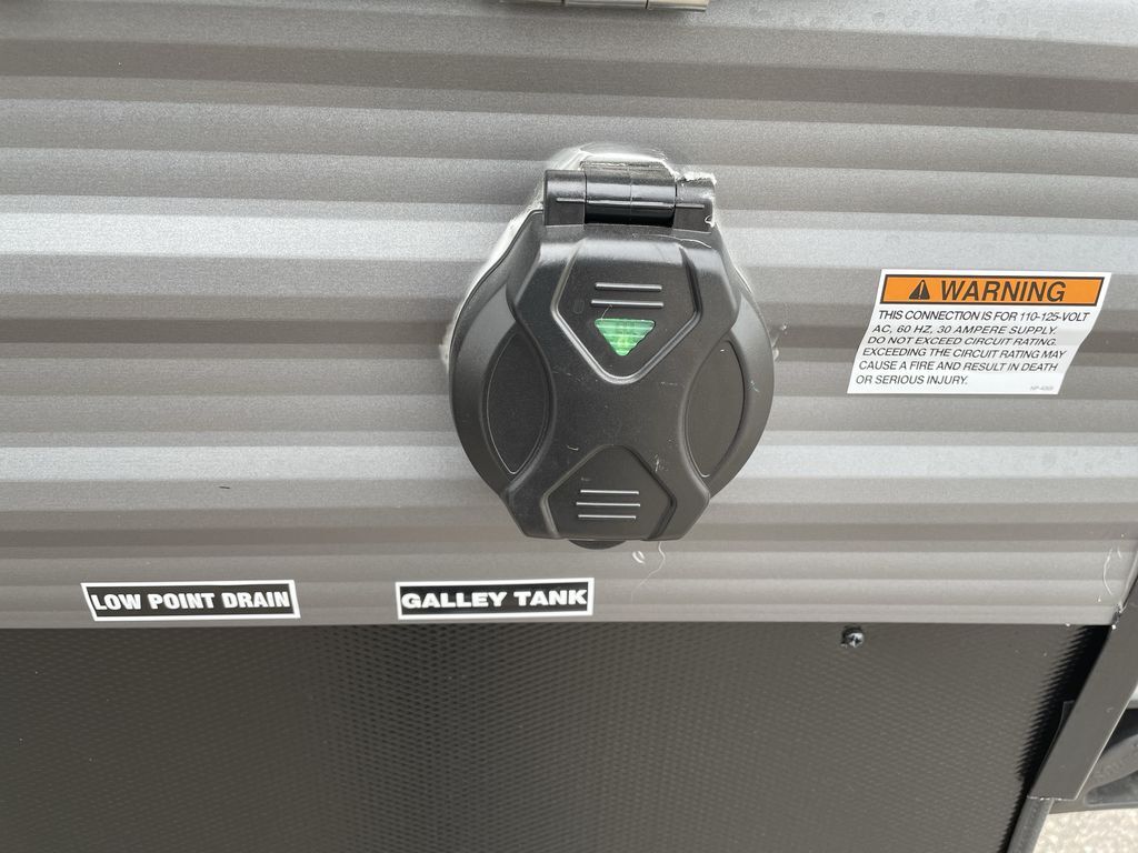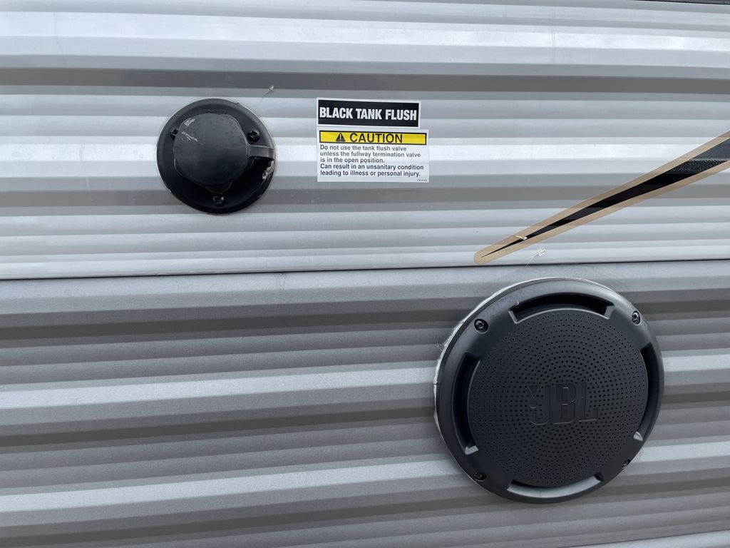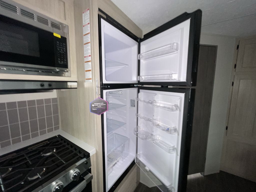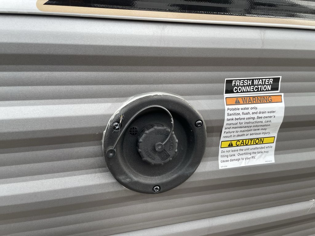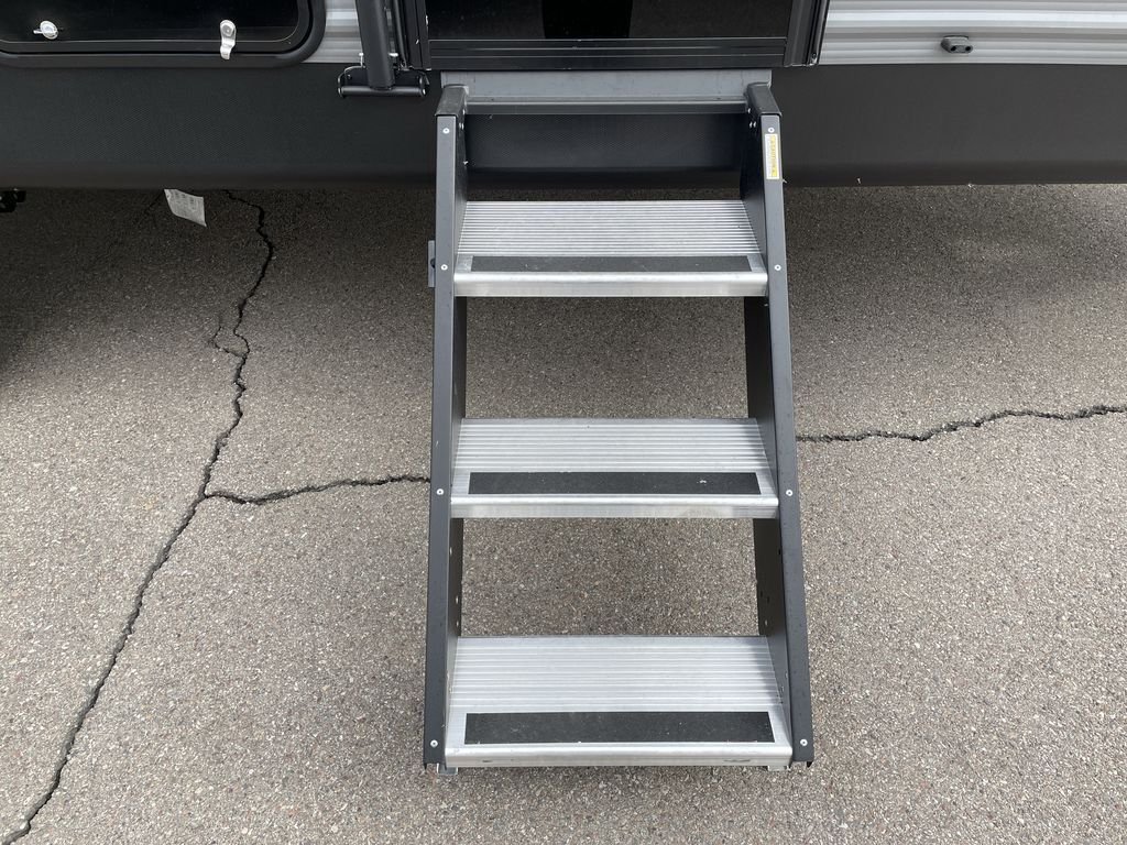 When you are ready to camp with your favorite person, this trailer offers the perfect couples trailer with space for an overnight guest on the booth dinette. You will have a front bedroom with a walk-around queen bed, dual wardrobes and overhead cabinets for your belongings. The main living and kitchen area is spacious with a slide out dinette and sofa giving you more floor space, dining and relaxing seating, and extra sleeping space for friends once the furniture is easily setup. There is a wardrobe/pantry next to the rear corner bathroom complete with a radius shower. The galley kitchen includes full amenities, plus there is an outside kitchen with a griddle and mini refrigerator. Everyone will enjoy the entertainment center when inside, and the 18' awning offers a covered outdoor living area, just grab your chairs from the pass-through compartment.