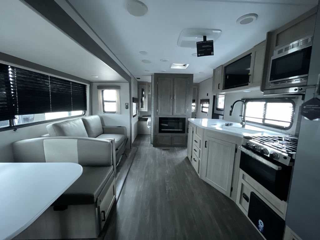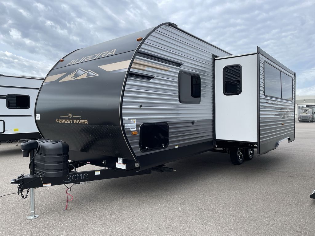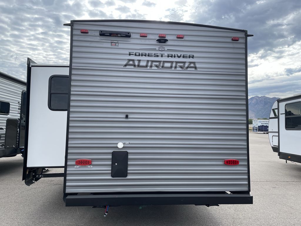 Comfortability, usability, and quality is what you will find in each one of these Forest River Aurora travel trailers, toy haulers or destination trailers! They are designed with a superior build and packed full with industry leading, functional, and distinctive standard features. SolidStep entrance steps and a Safe-T rail door assist on main entry door to help you safely enter and exit the unit. The diamond plate rock guard will protect your unit from road debris and the nitrogen filled radial tires, which keep their pressure longer, offer better fuel economy. You will also find upgraded JBL Elite exterior speakers outside, an electric awning with multicolor lights and remote, plus flush mount baggage doors for easy packing. The interiors are beautifully designed with a deep undermount farm style sink, stainless steel appliances, and linoleum flooring in the slide outs which will be easy to clean. Come find your favorite model today!