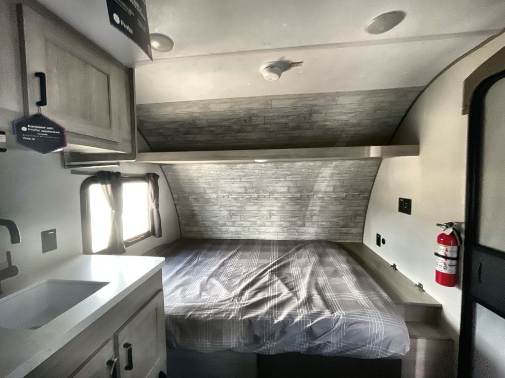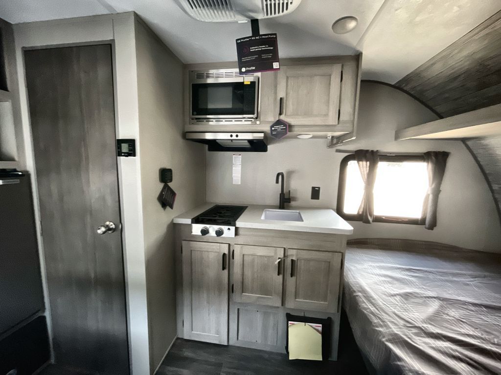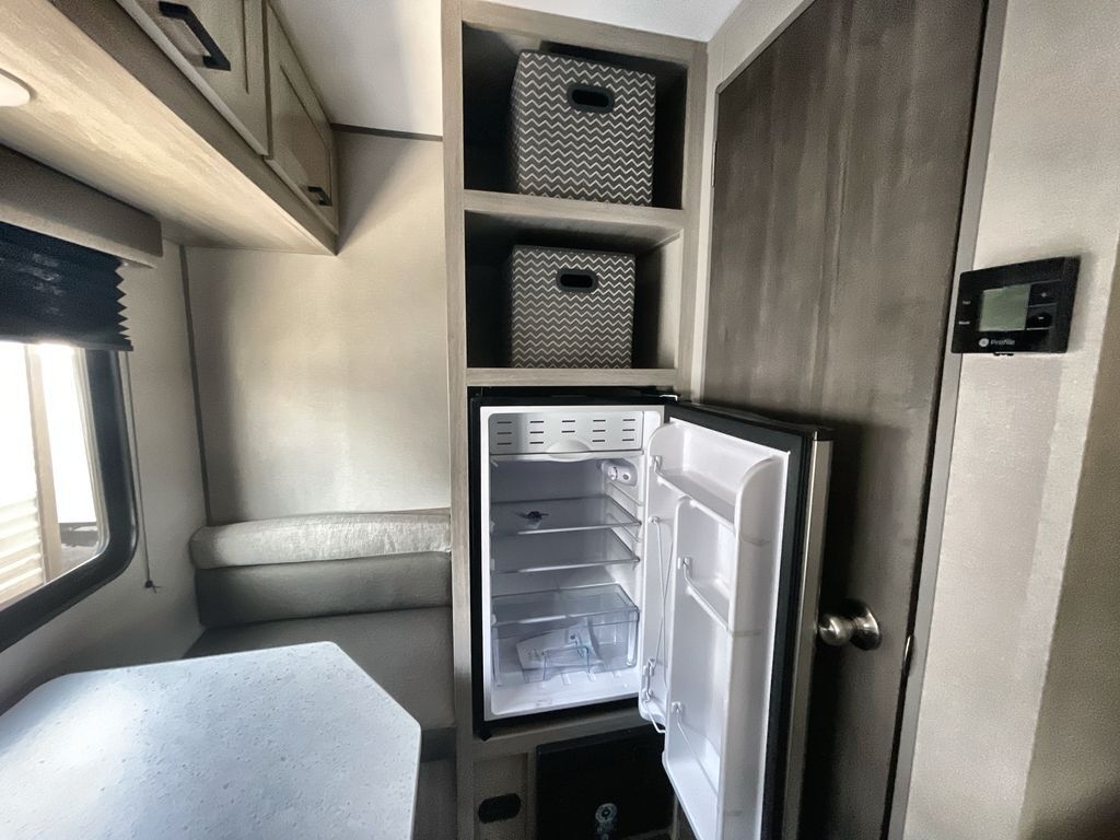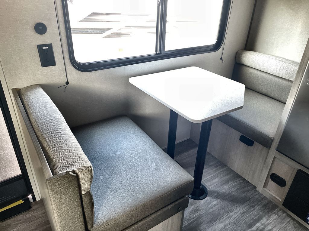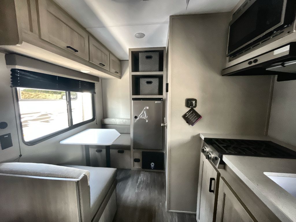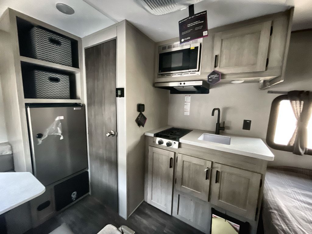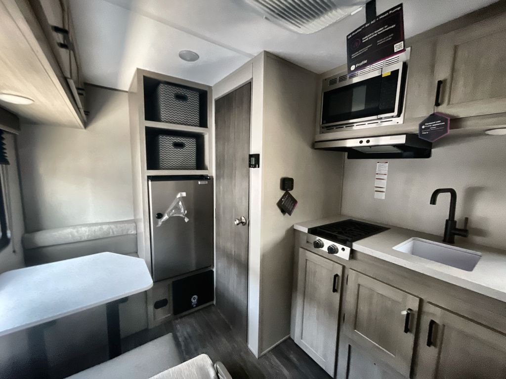 This lightweight travel trailer includes everything you need for comfortable camping trips at the lake. You can make your meals on the two burner cooktop or in the stainless steel microwave, and a 3.3 cu. ft. 12V refrigerator will keep leftovers fresh. A front queen bed provides a great night's rest, and there is a 29" booth dinette that will double as both dining and additional sleeping space. And a private bath with a 24" x 32" shower and toilet will let you easily freshen up without having to use the camp's facilities!