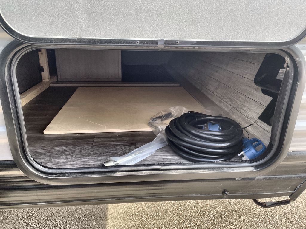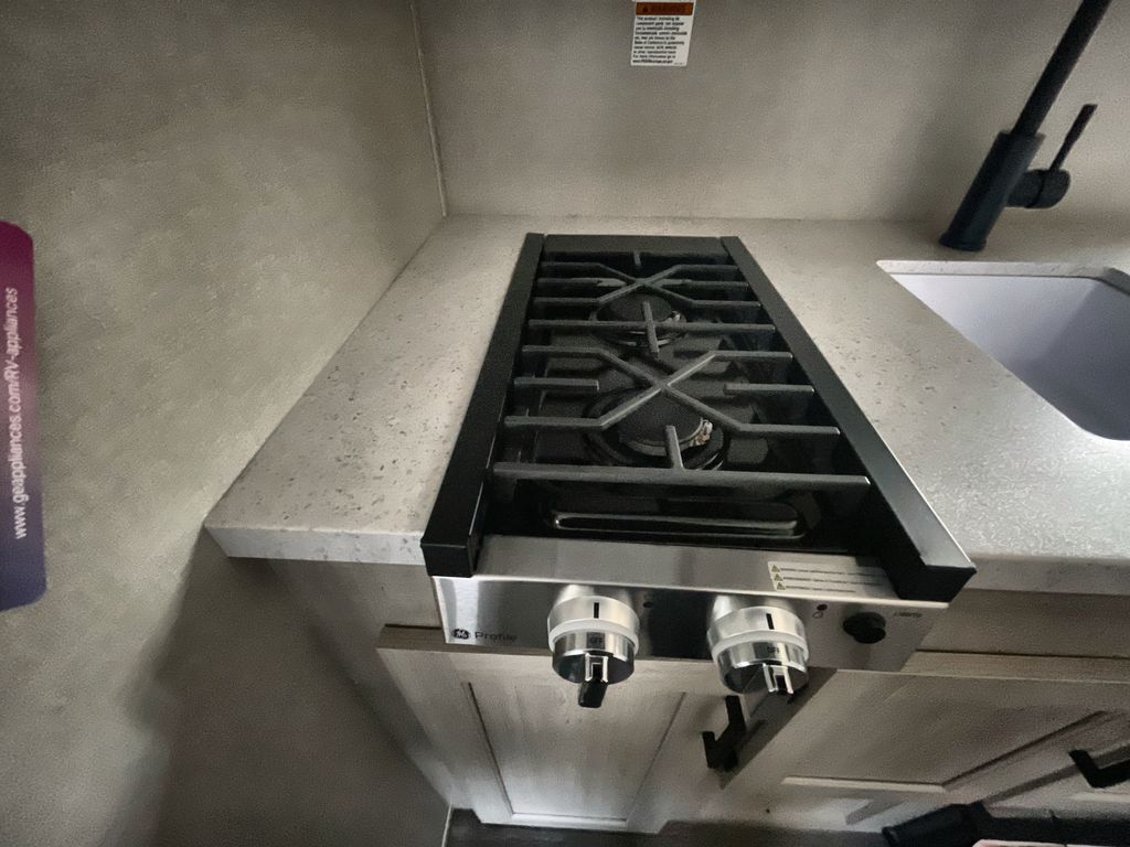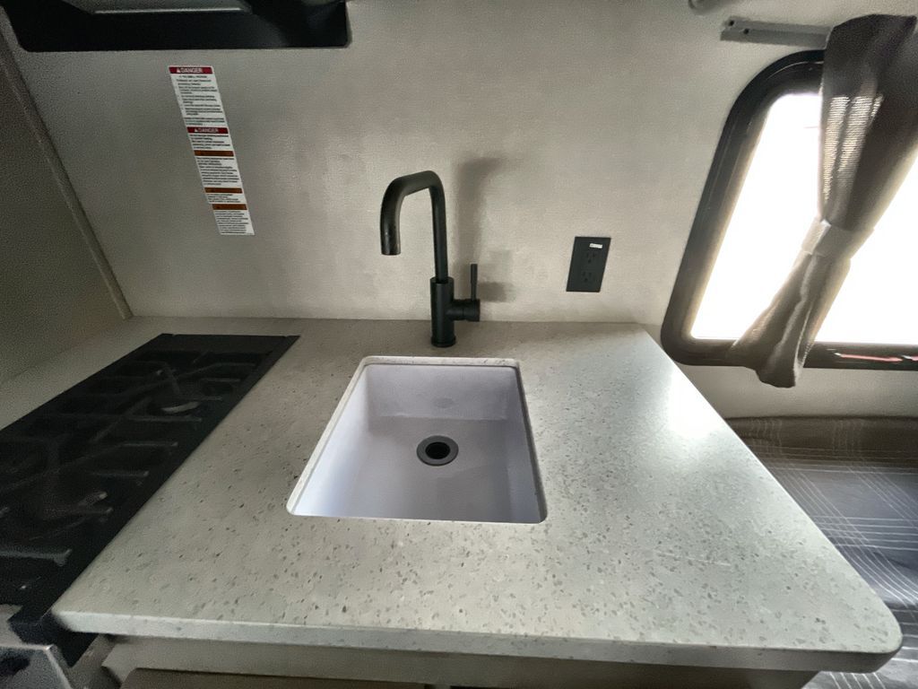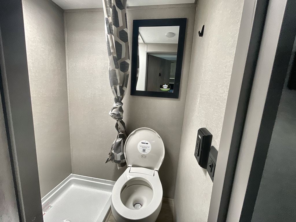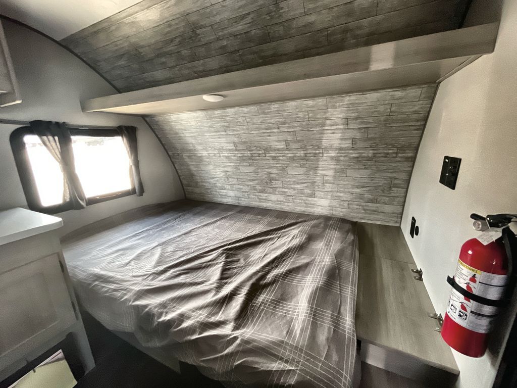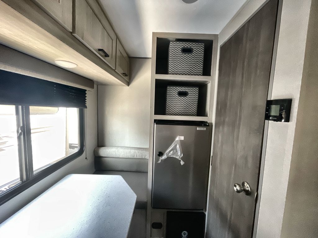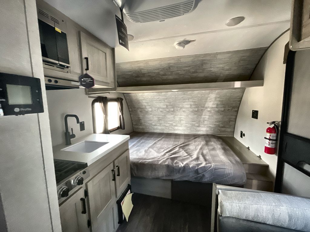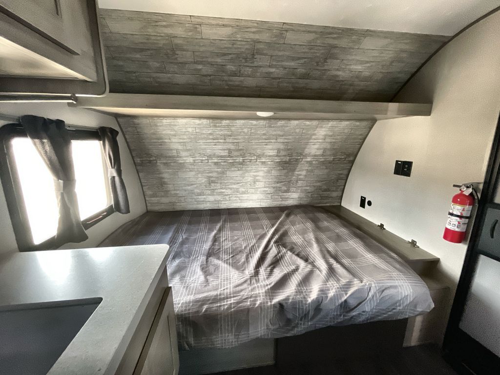 This lightweight travel trailer includes everything you need for comfortable camping trips at the lake. You can make your meals on the two burner cooktop or in the stainless steel microwave, and a 3.3 cu. ft. 12V refrigerator will keep leftovers fresh. A front queen bed provides a great night's rest, and there is a 29" booth dinette that will double as both dining and additional sleeping space. And a private bath with a 24" x 32" shower and toilet will let you easily freshen up without having to use the camp's facilities!